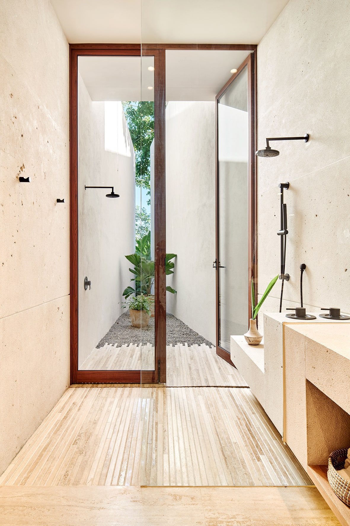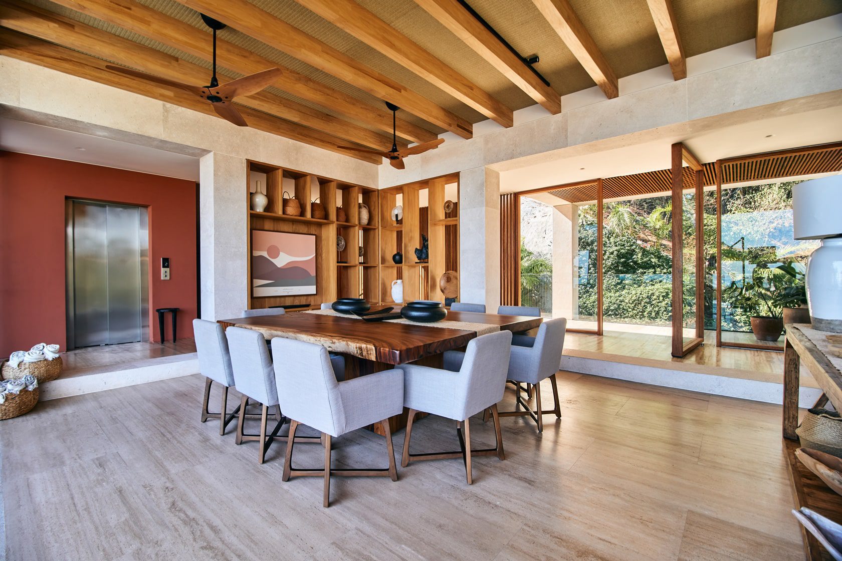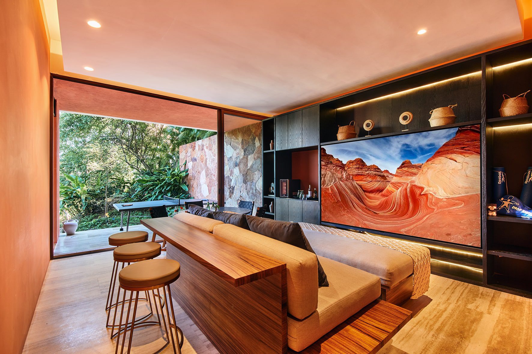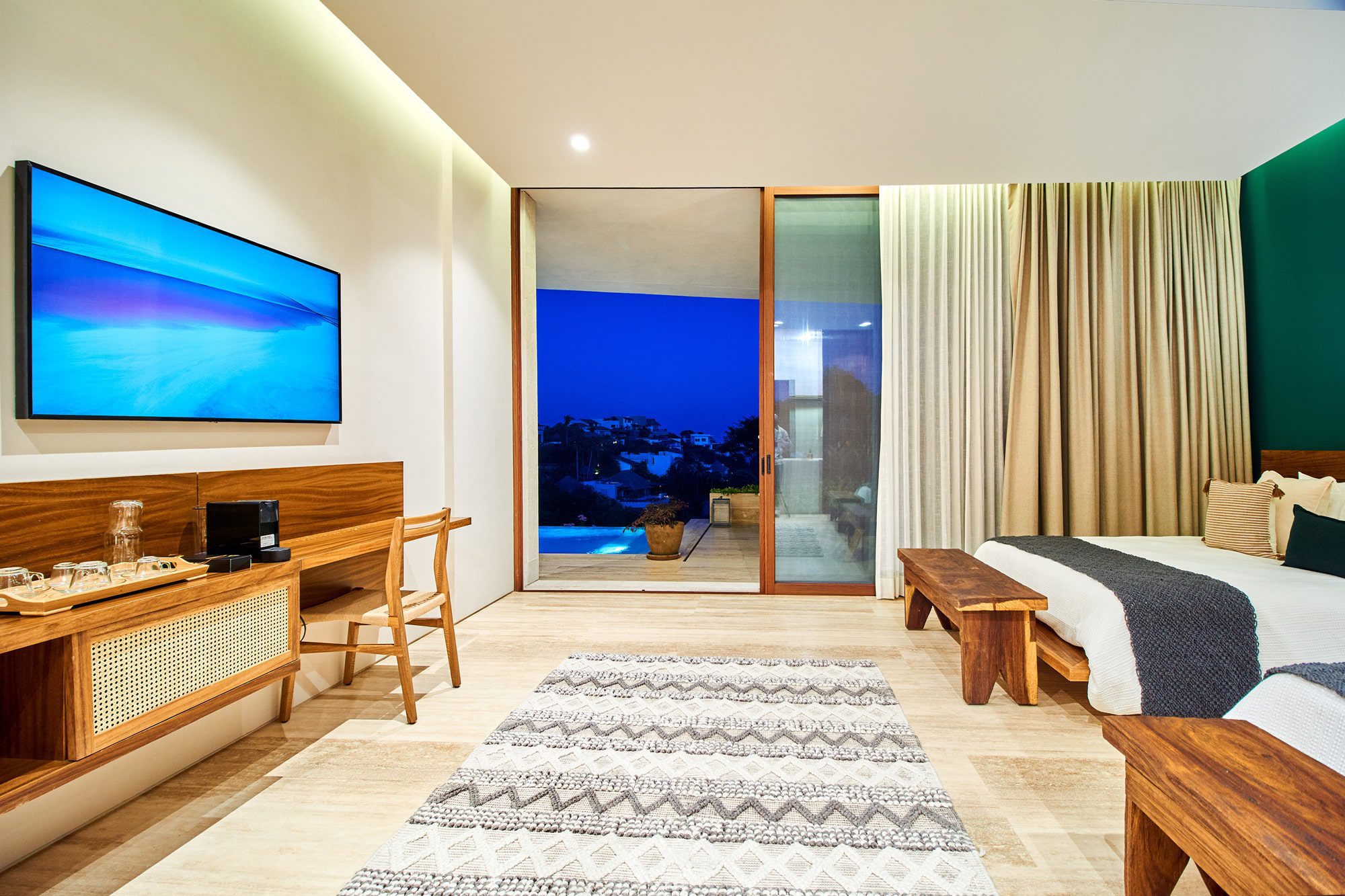 With two private pools and five well-appointed bedrooms, Casa Sirenas is spacious. An adaptive media room can also serve as an extra bedroom, comfortably housing up to 12 guests. The villa’s design emphasizes natural materials and neutral colors, peppered with distinct Mexican touches.