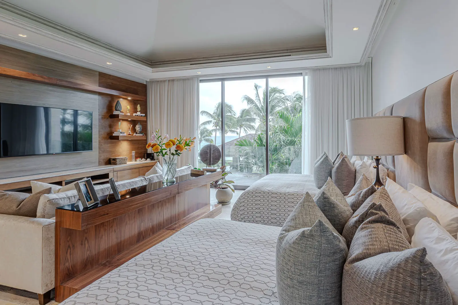 2 Queen beds, 2 Pairs of slippers & palm beach bag, Air conditioning, Ceiling fan, Coffee maker, Dual vanity, Ensuite bathroom with tub & shower, Hairdryer, Mini bar, Ocean view, Organic toiletries, Robes, Safety box, Satellite TV, Walk in closet, Wifi access, Window screen