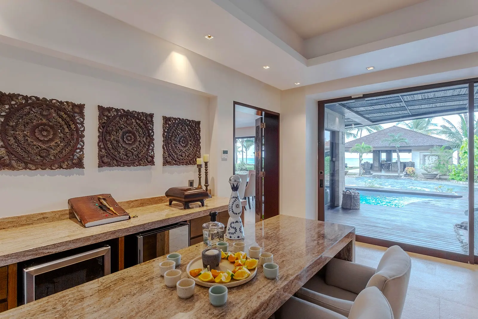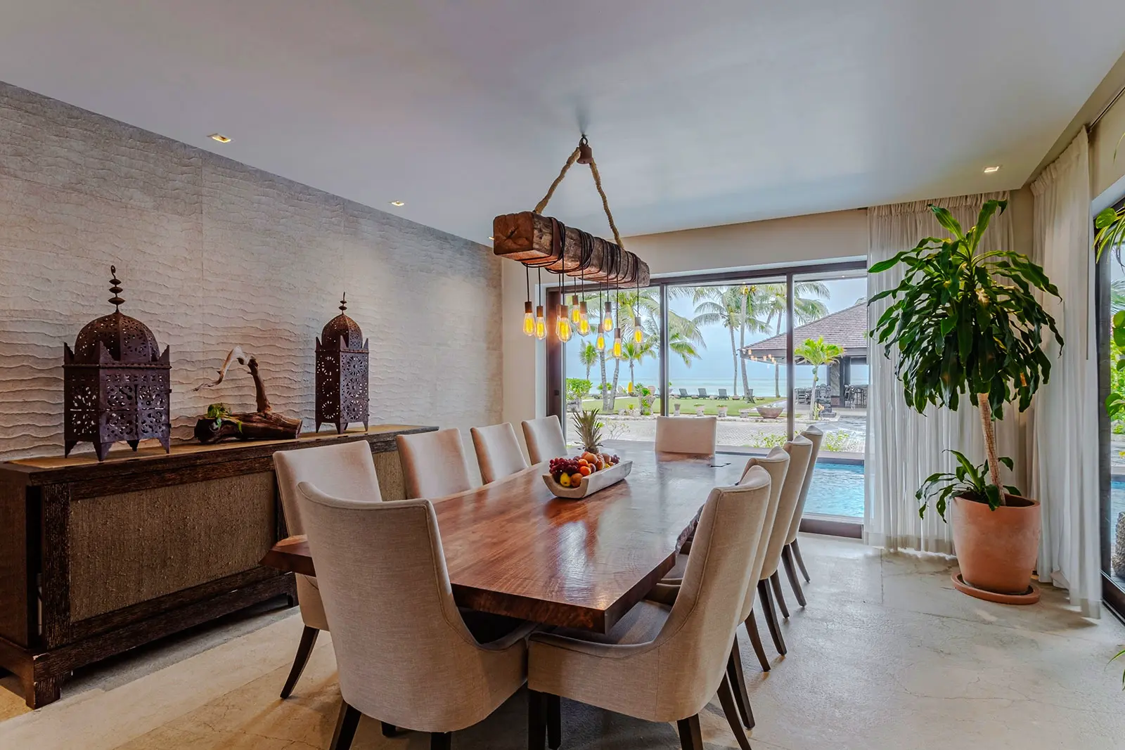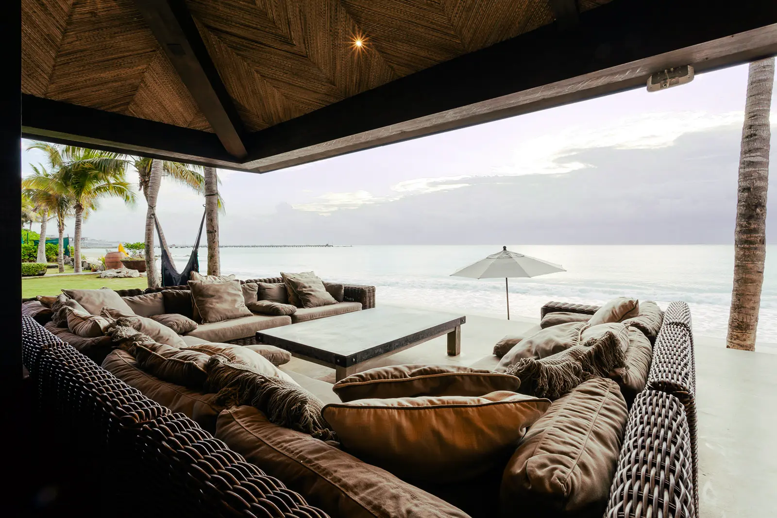Daily life here flows easily between indoor comfort and the beachfront palapa that anchors the social experience of the villa. Open spaces connect the house to the shore, creating a natural rhythm of moving from shaded lounges to the water’s edge and back again. The palapa, with its bar, kitchen, indoor dining, and lounge area, is designed for lingering over meals, relaxed gatherings, and unhurried moments by the sea, supported by an on-staff chef and butler that allow guests to focus fully on their time away.