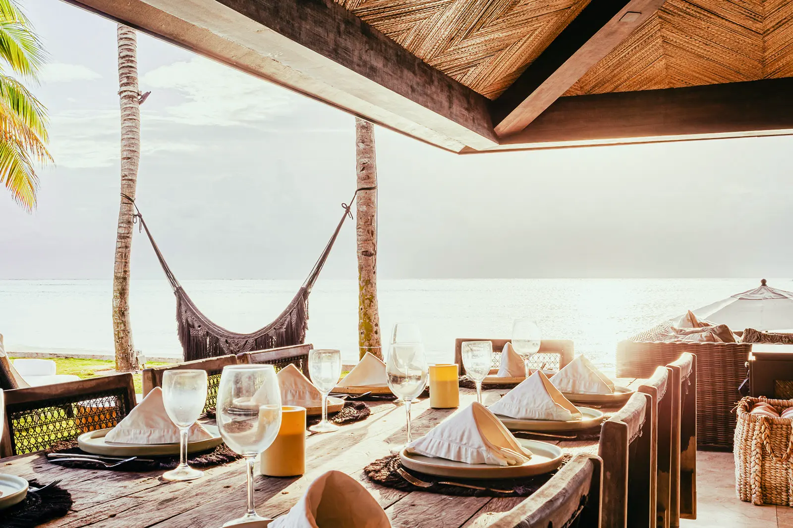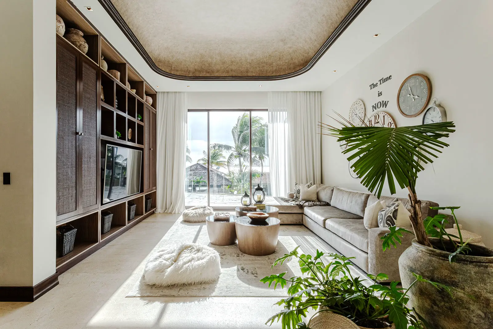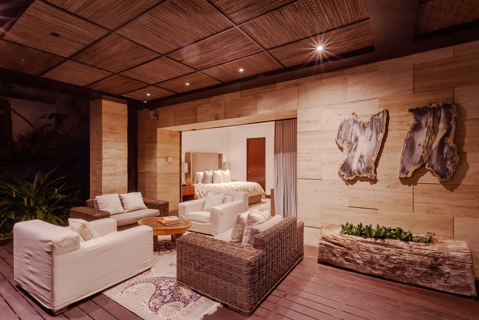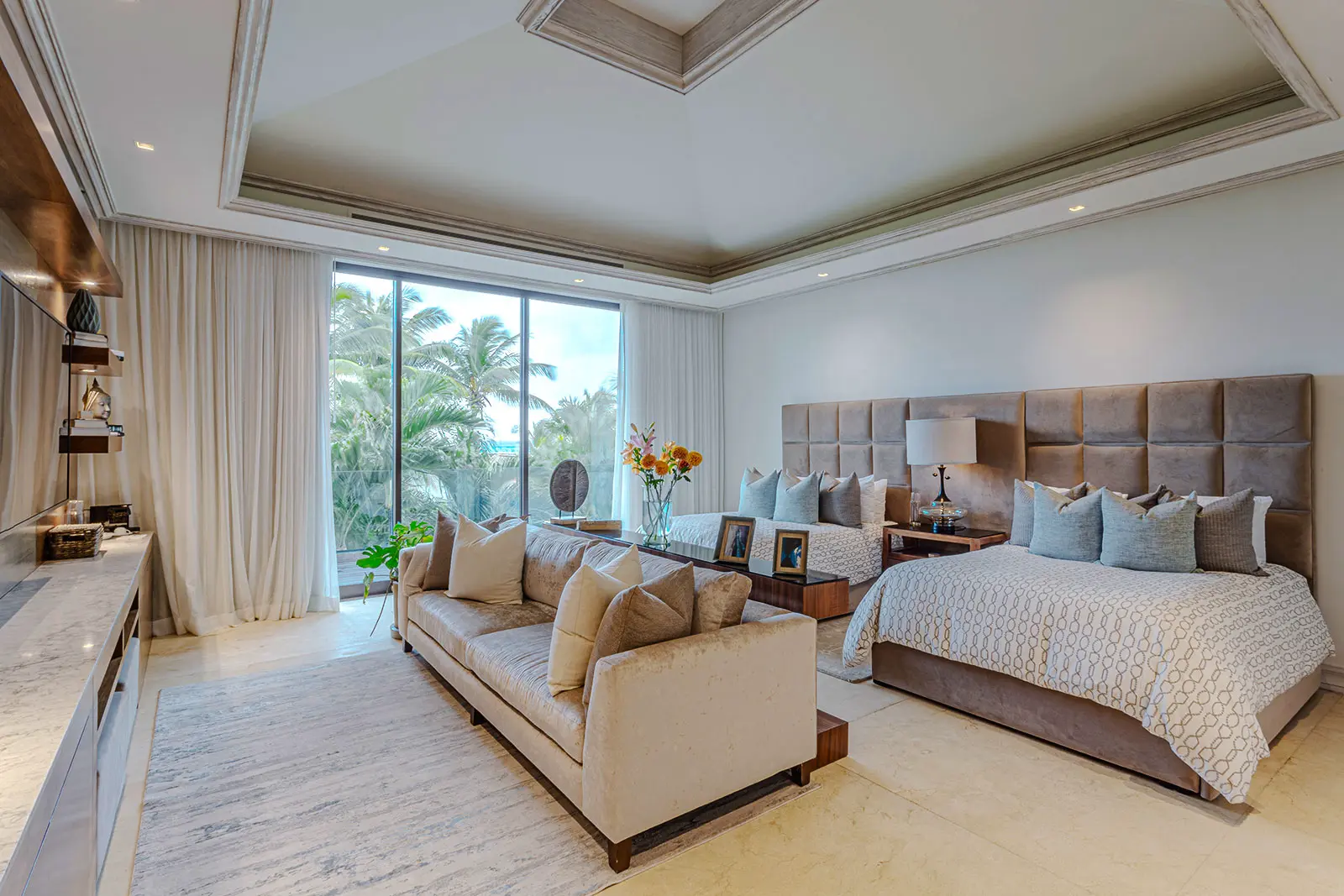 Daily life here flows easily between indoor comfort and the beachfront palapa that anchors the social experience of the villa. Open spaces connect the house to the shore, creating a natural rhythm of moving from shaded lounges to the water’s edge and back again. The palapa, with its bar, kitchen, indoor dining, and lounge area, is designed for lingering over meals, relaxed gatherings, and unhurried moments by the sea, supported by an on-staff chef and butler that allow guests to focus fully on their time away.