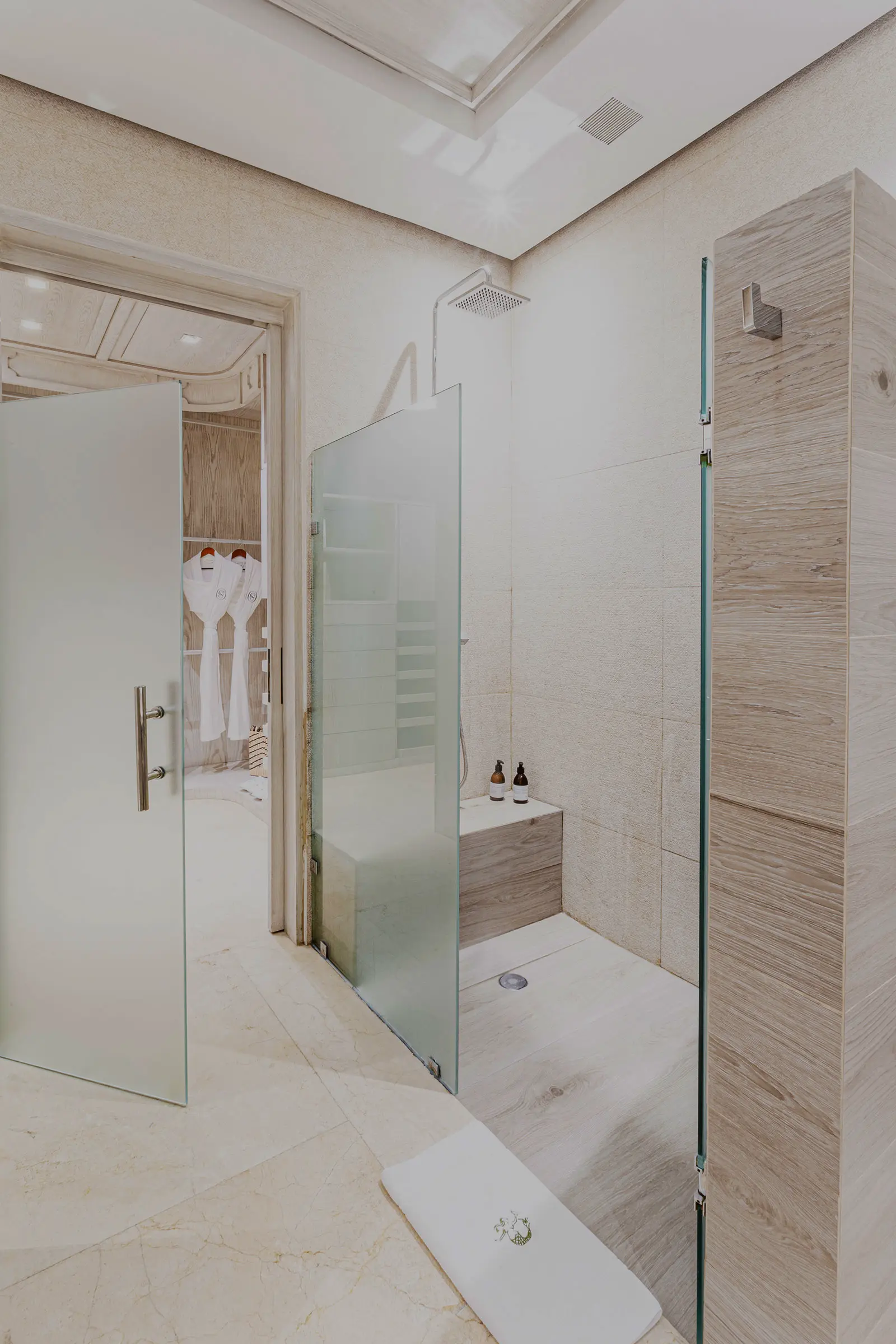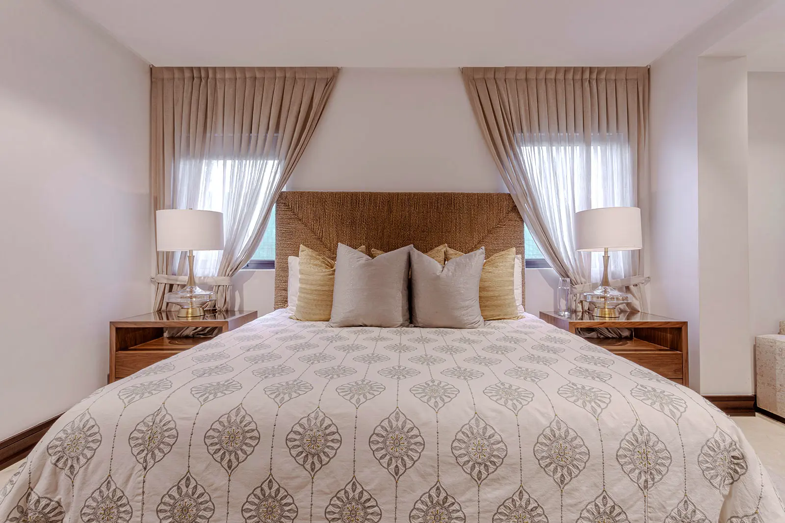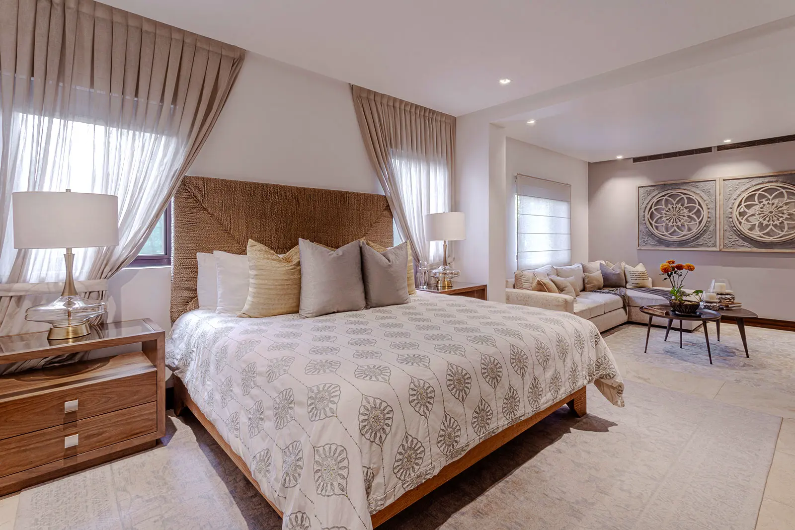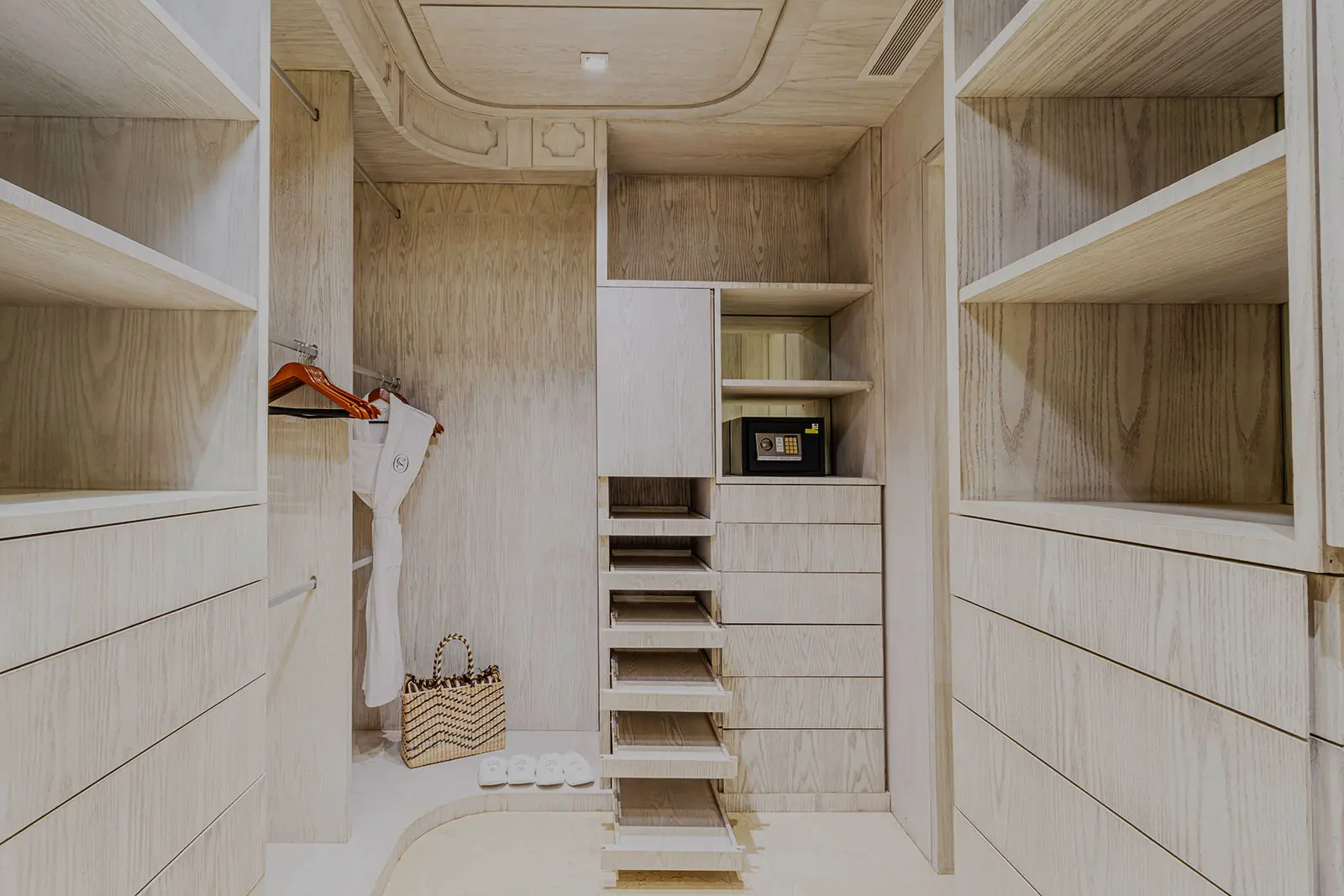 King size bed, 2 Pairs of slippers & palm beach bag, 2 Separate toilets, Air conditioning, Ceiling fan, Coffee maker, Dual vanity, Electric curtains, Ensuite bathroom with tub & shower, Hairdryer, Mini bar, Organic toiletries, Safety box, Satellite TV, Walk in closet, Wifi access, Window screen