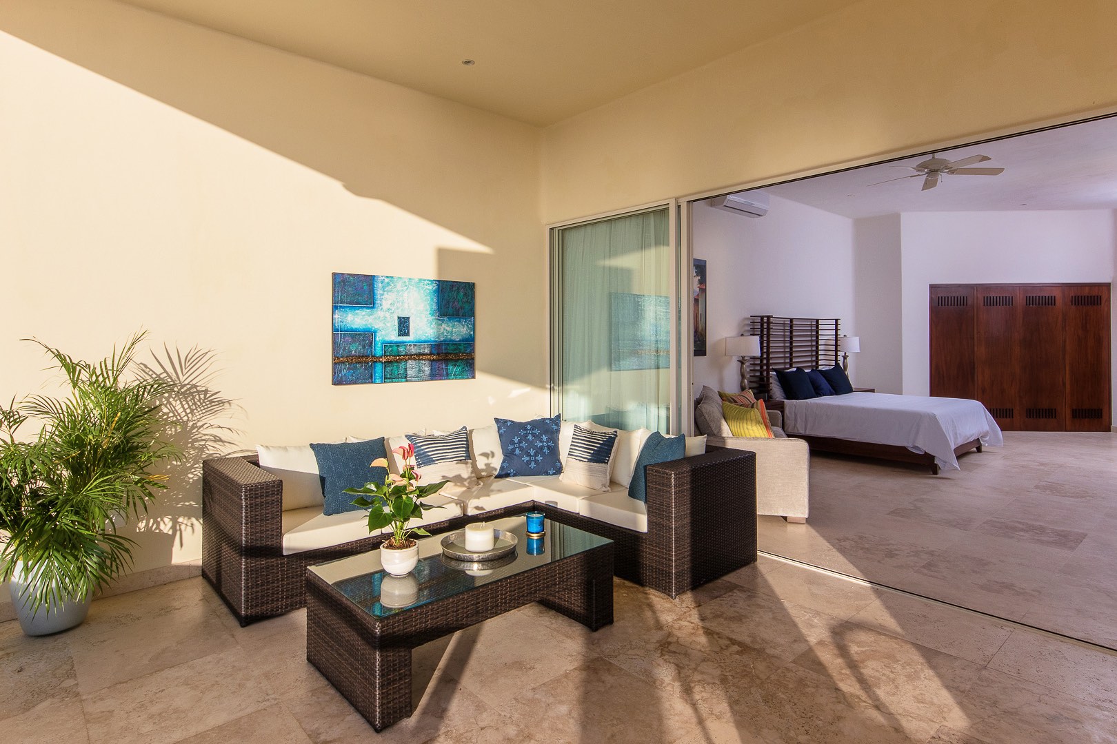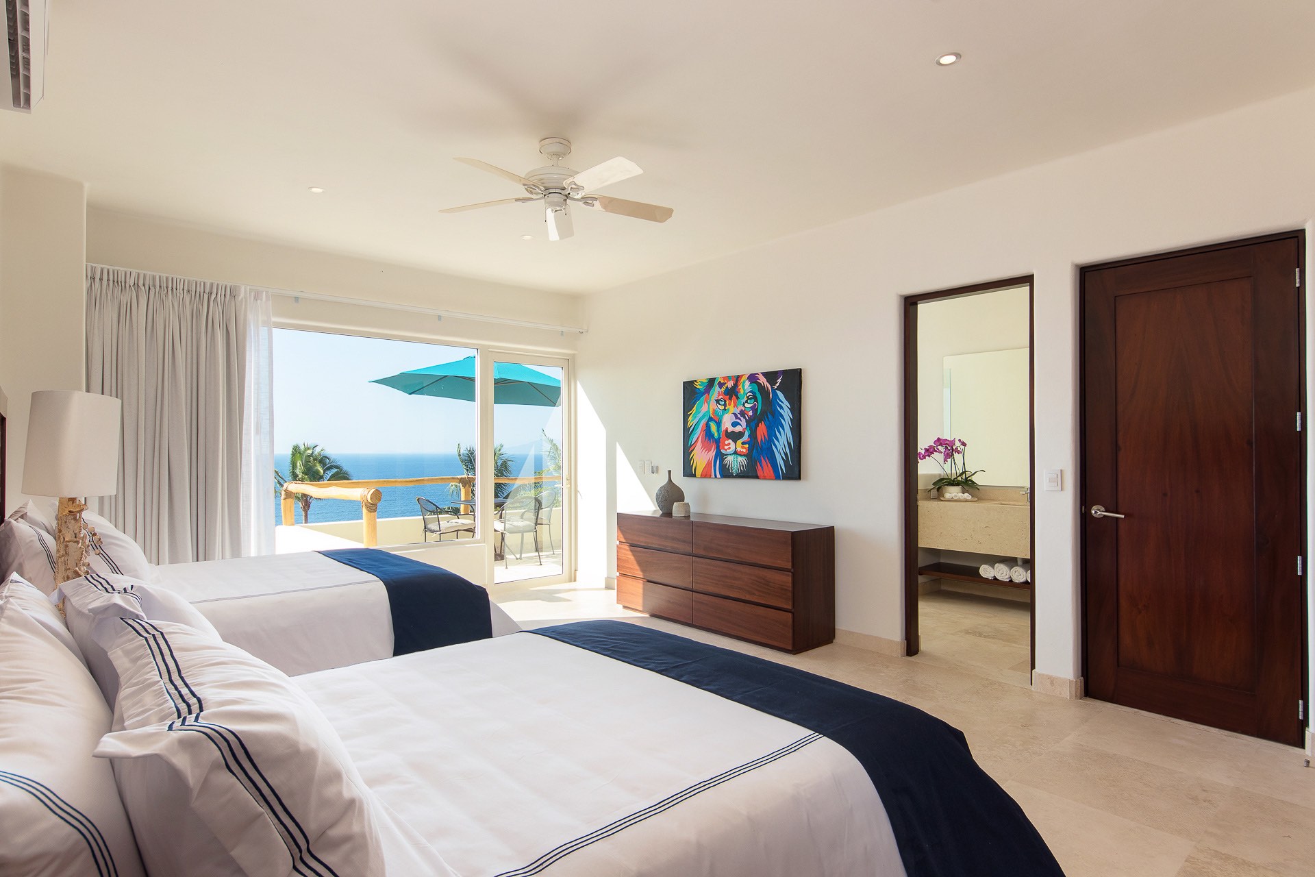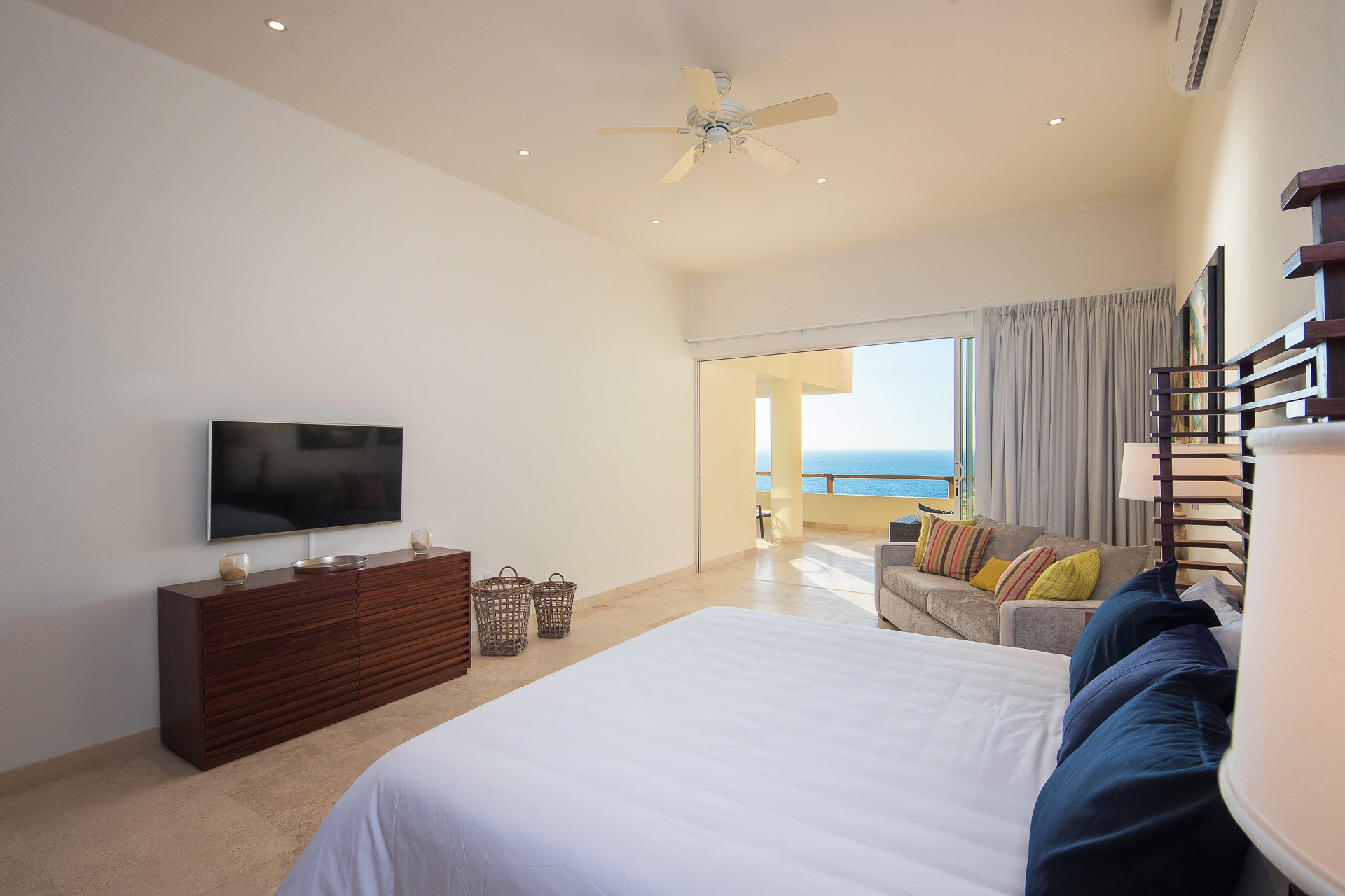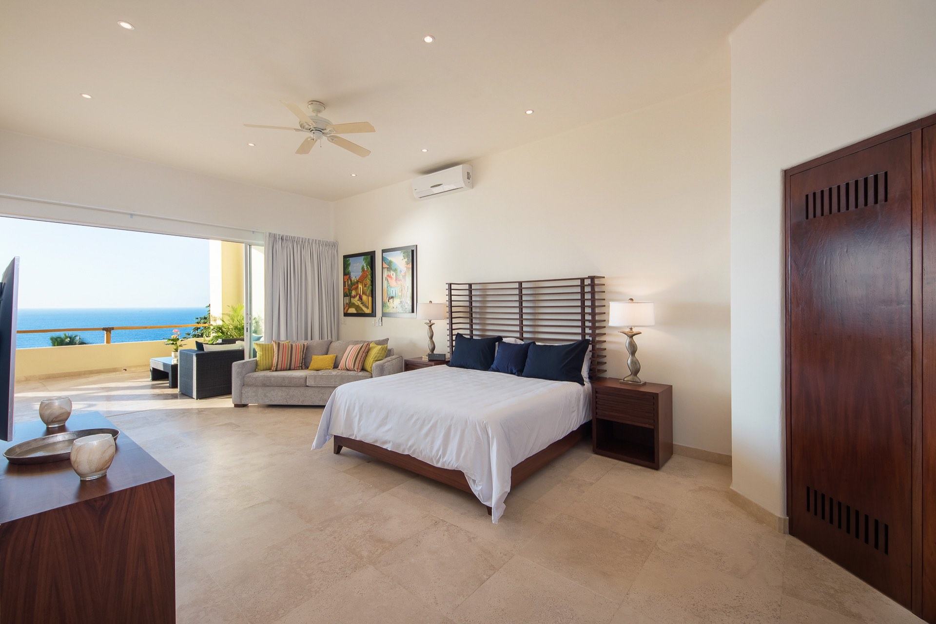 (Principal Bedroom - Lower Level 1): King size bed, Sleeper sofa, En-suite bathroom, TV, A/C, Security Safe, Private Terrace, Ocean view