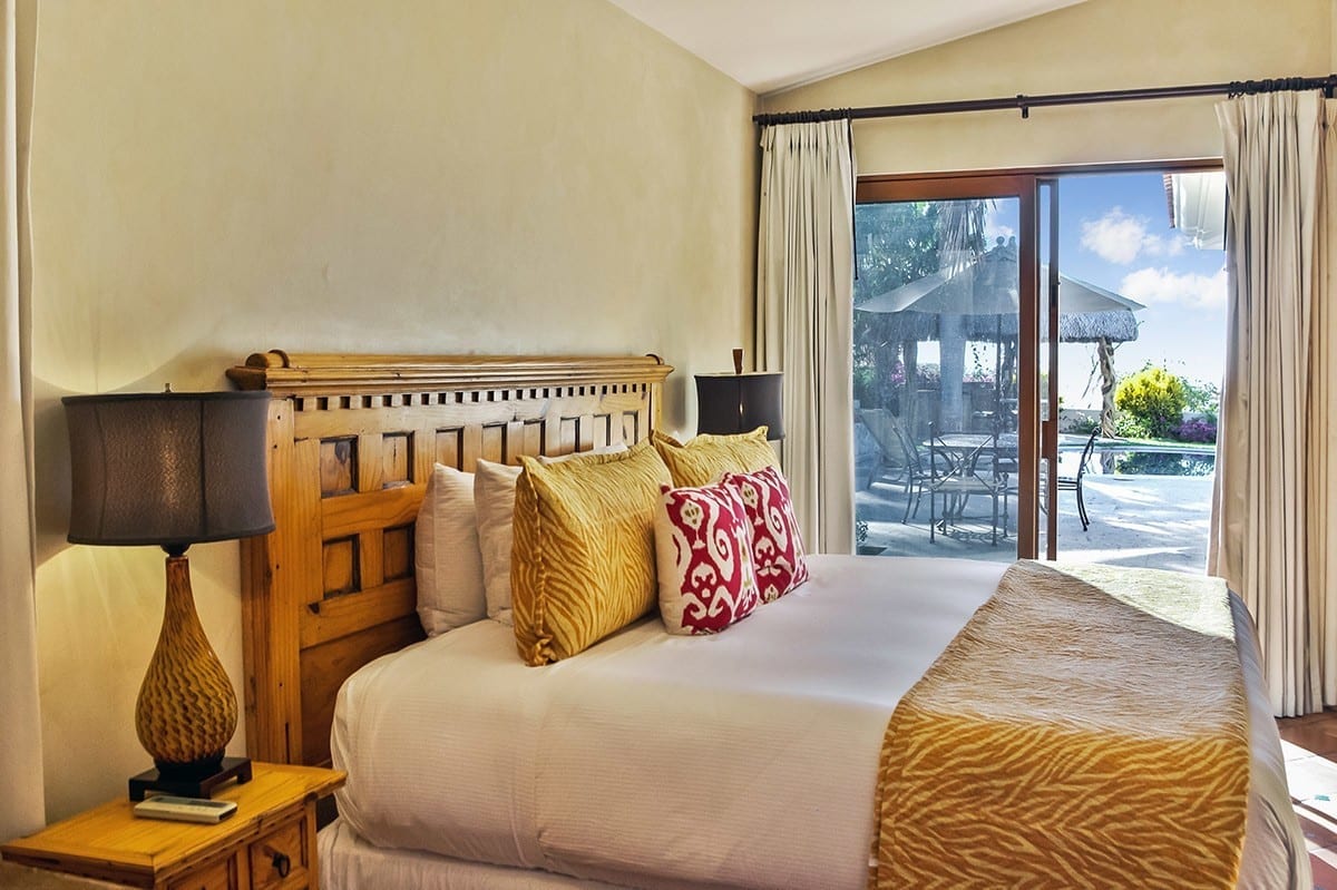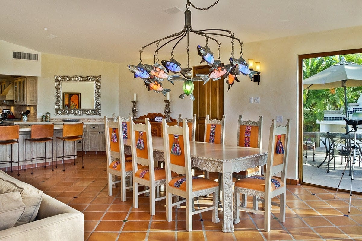 Casa Tortuga is ideal for multiple families or groups of friends. It features expansive master bedrooms with direct pool access and comfortable guest rooms. The kitchen, living, and dining areas’ open-concept design creates a welcoming atmosphere for gatherings and relaxation. Sunlight streams through large sliding glass doors and corner windows, illuminating the vibrant Mexican decor throughout the villa.
