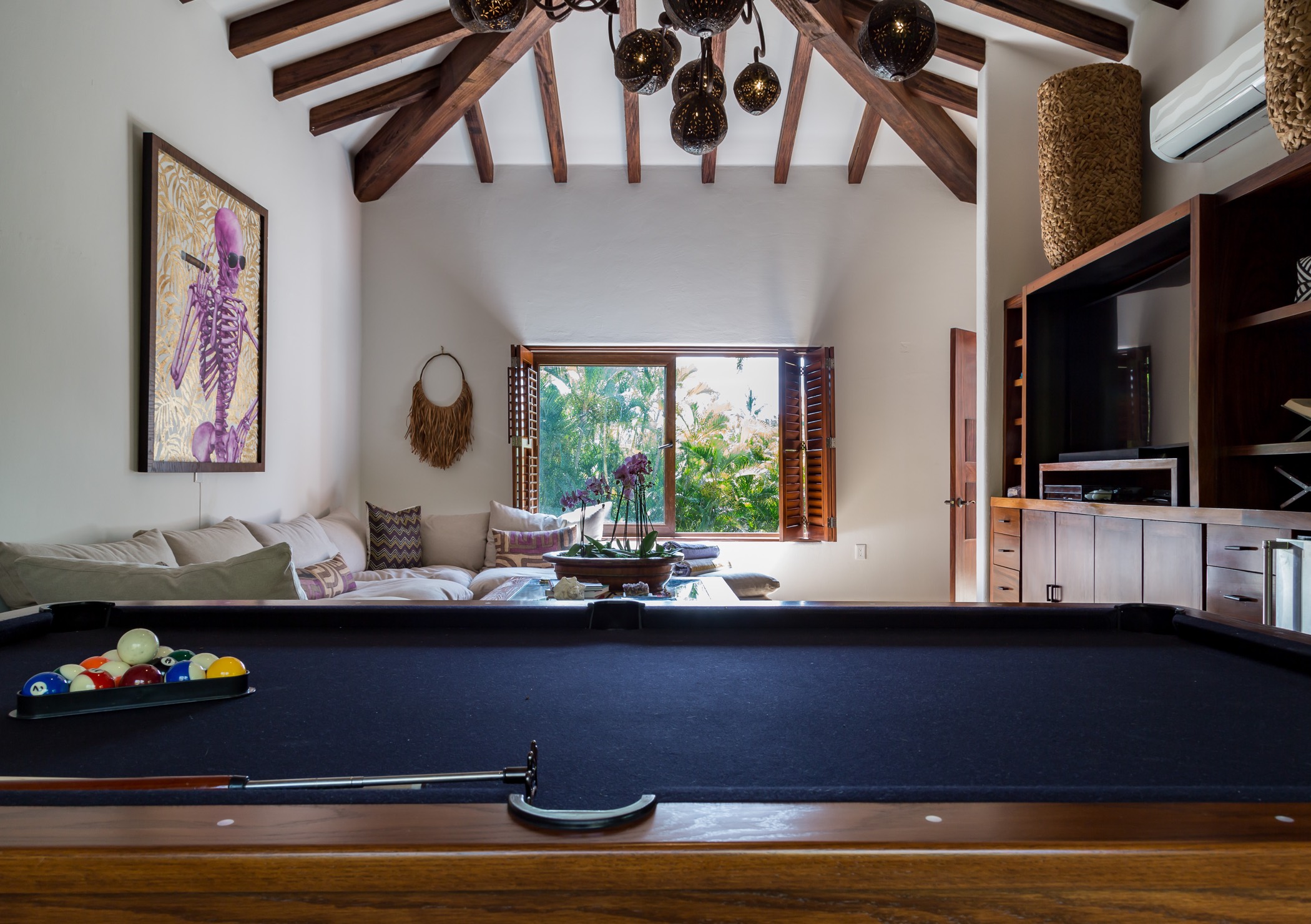 Stay entertained in the spacious game room, featuring a custom pool table and a large screen for movie nights. Golf enthusiasts can practice on the 5-hole putting green. Steps away, a private beach awaits with kayaks, paddle boards, and fishing gear. An oceanfront fire pit, garden yoga, and terrace massages make relaxation inevitable. The immersive Sonos enhances all of these experiences with a surround sound system.
