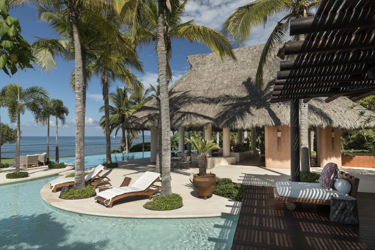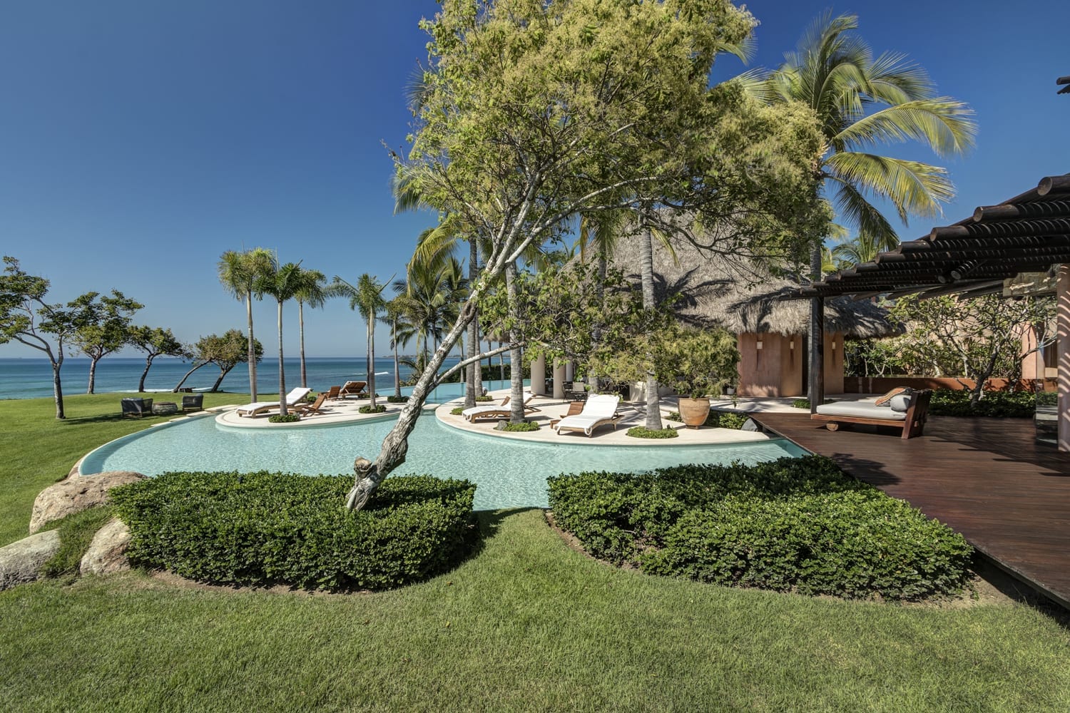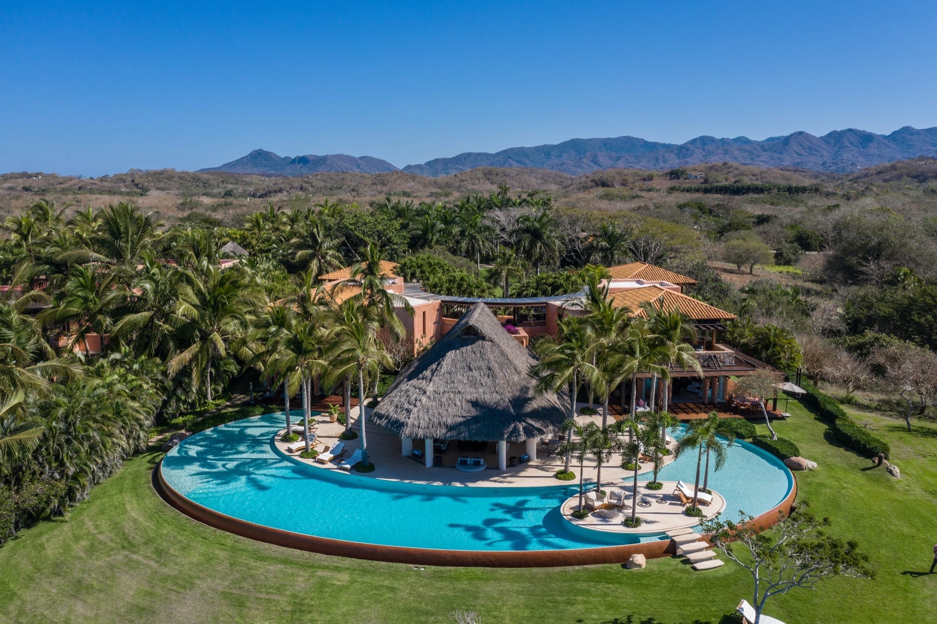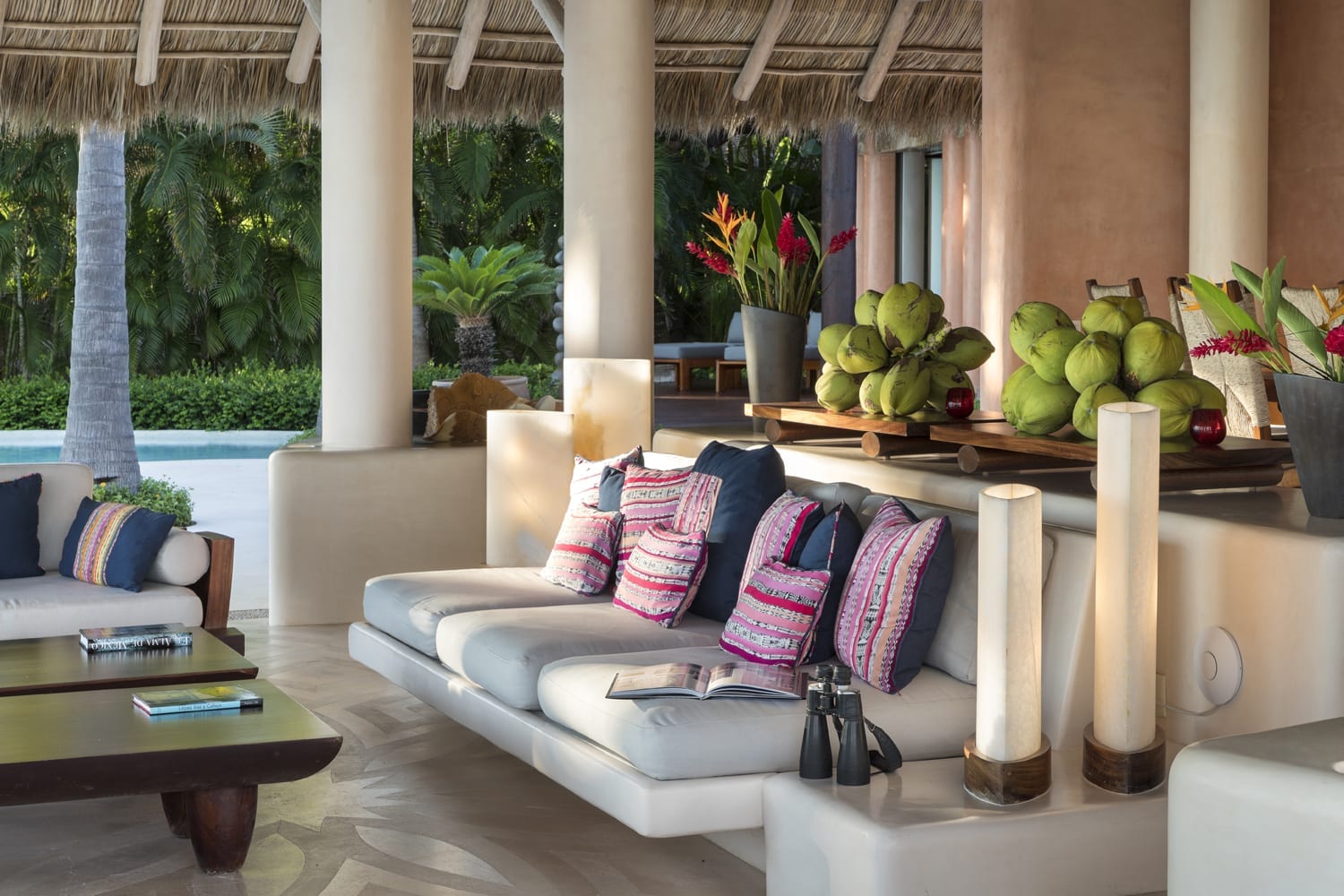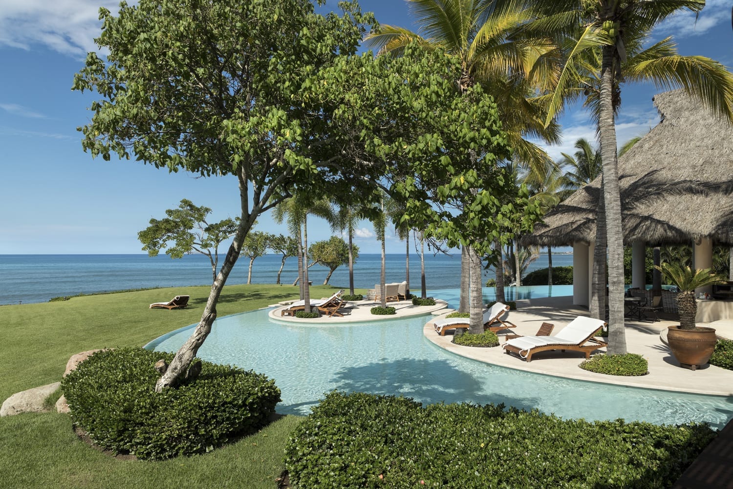 Every inch of this property has been meticulously crafted, from the pristine white sands that call out from below the beautifully manicured lawns to the tropical greenery that lovingly envelopes the estate. At the heart of Casa Tres Soles stands a magnificent palapa overlooking the azure pool and the vast expanse of the Pacific Ocean. It’s a space adorned with intricate artwork and handcrafted decor that resonates with the charm of the Mexican coast.