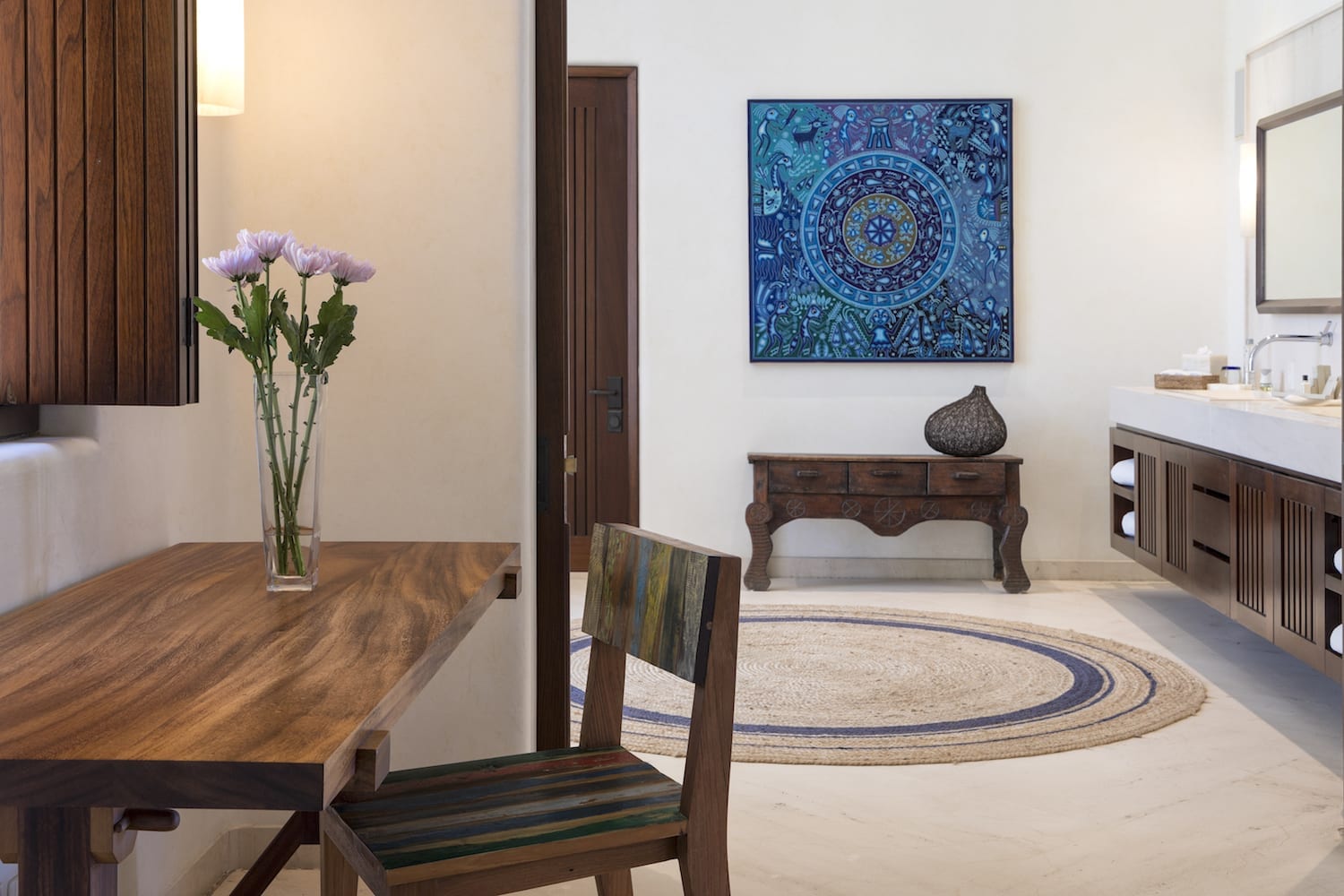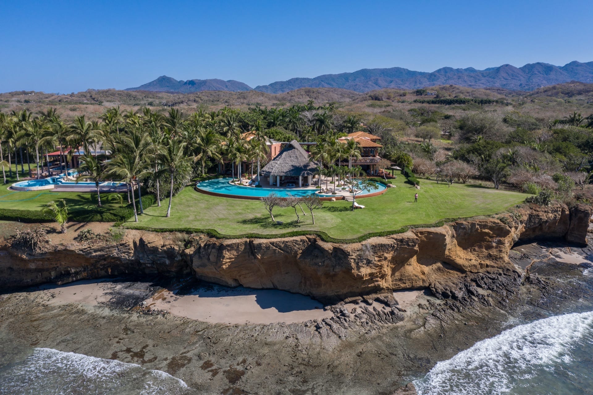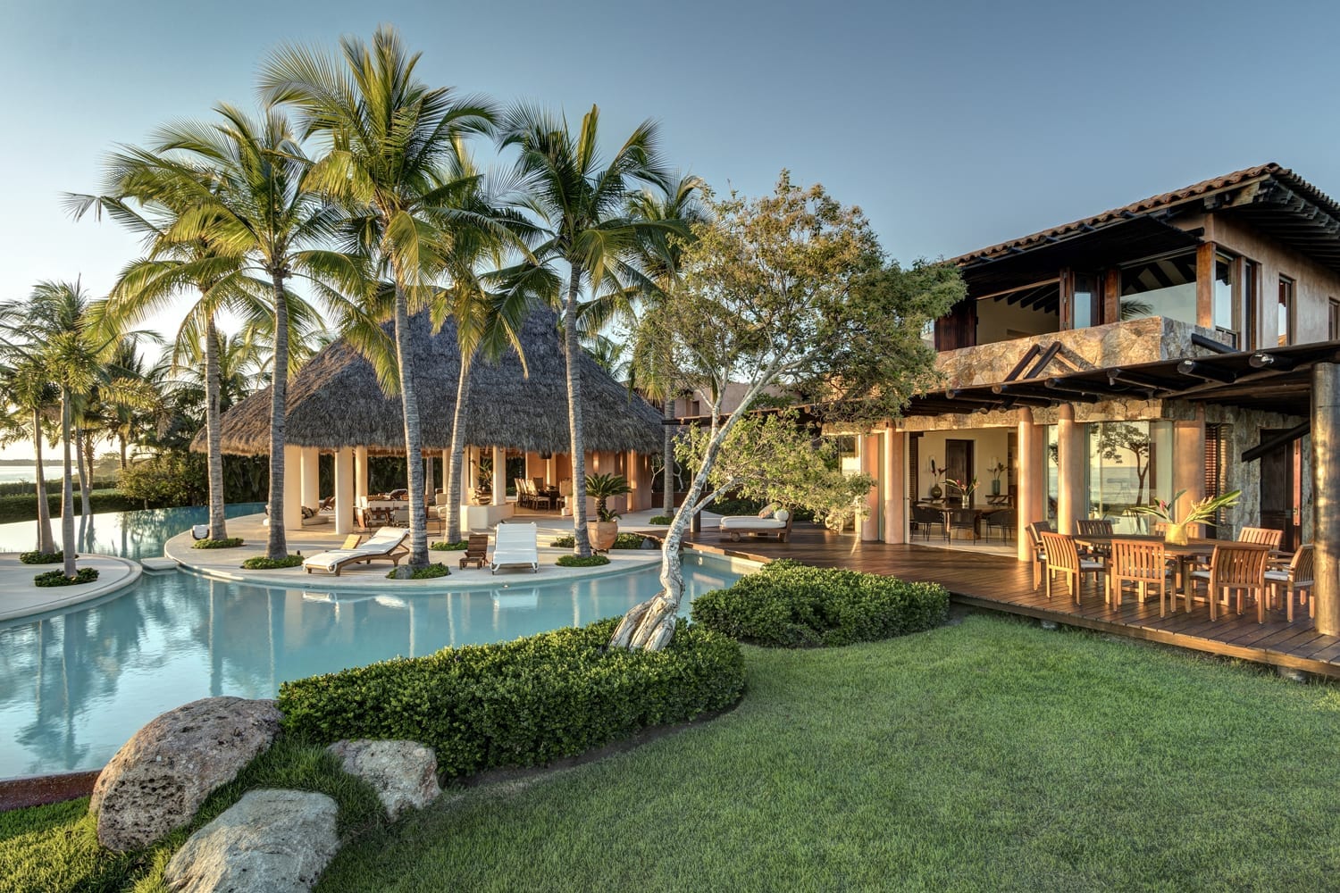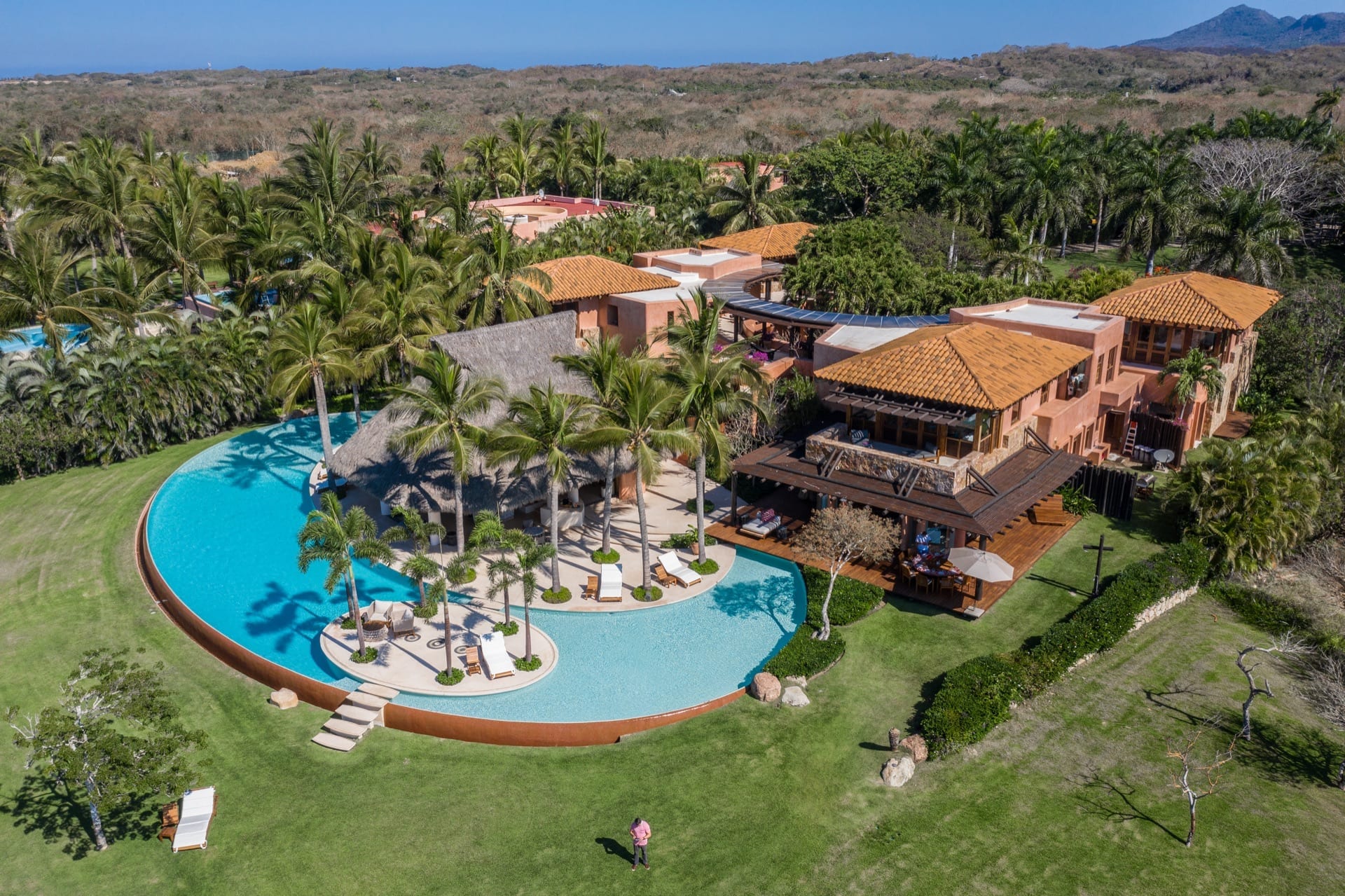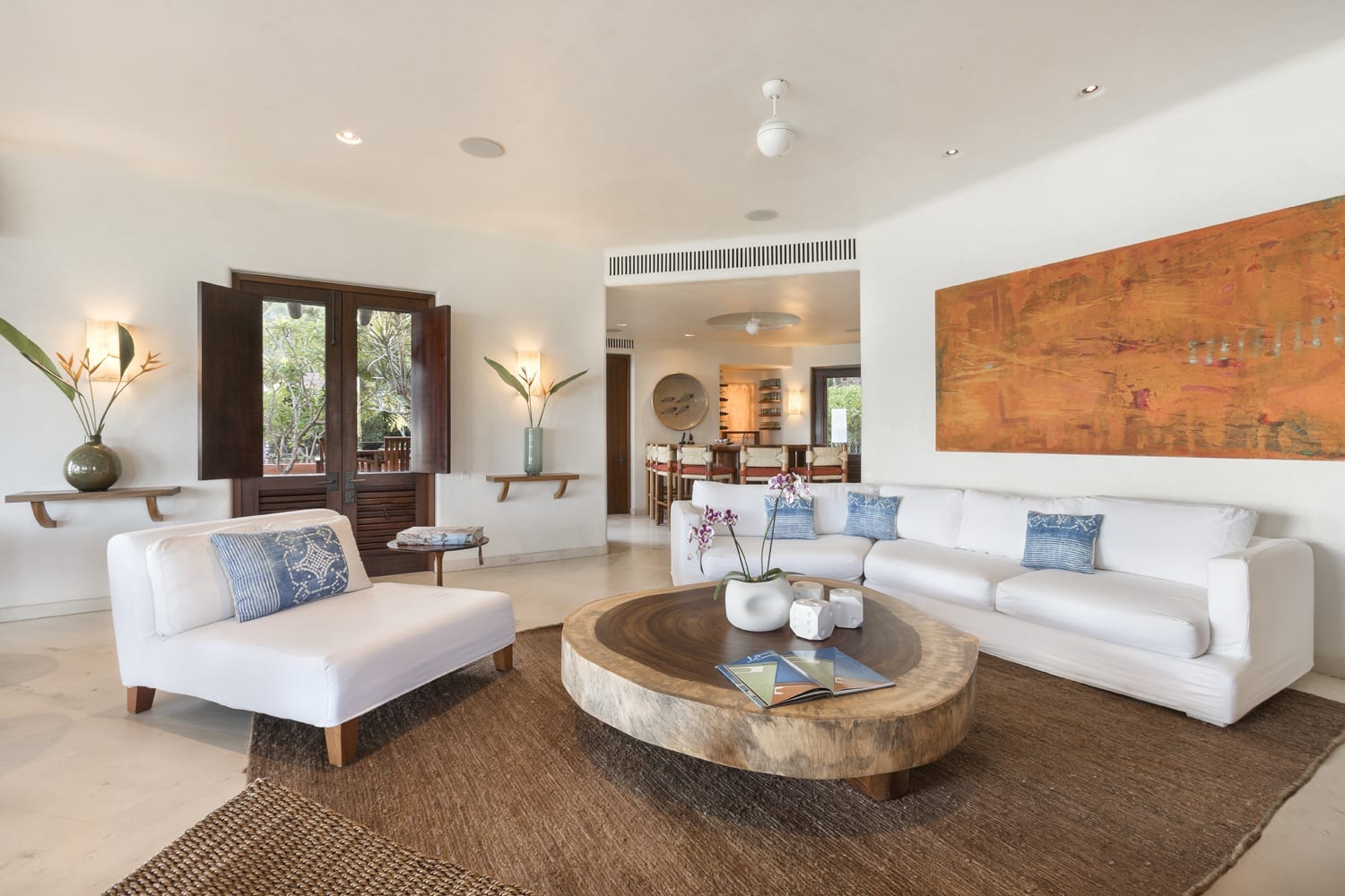 Every inch of this property has been meticulously crafted, from the pristine white sands that call out from below the beautifully manicured lawns to the tropical greenery that lovingly envelopes the estate. At the heart of Casa Tres Soles stands a magnificent palapa overlooking the azure pool and the vast expanse of the Pacific Ocean. It’s a space adorned with intricate artwork and handcrafted decor that resonates with the charm of the Mexican coast.
