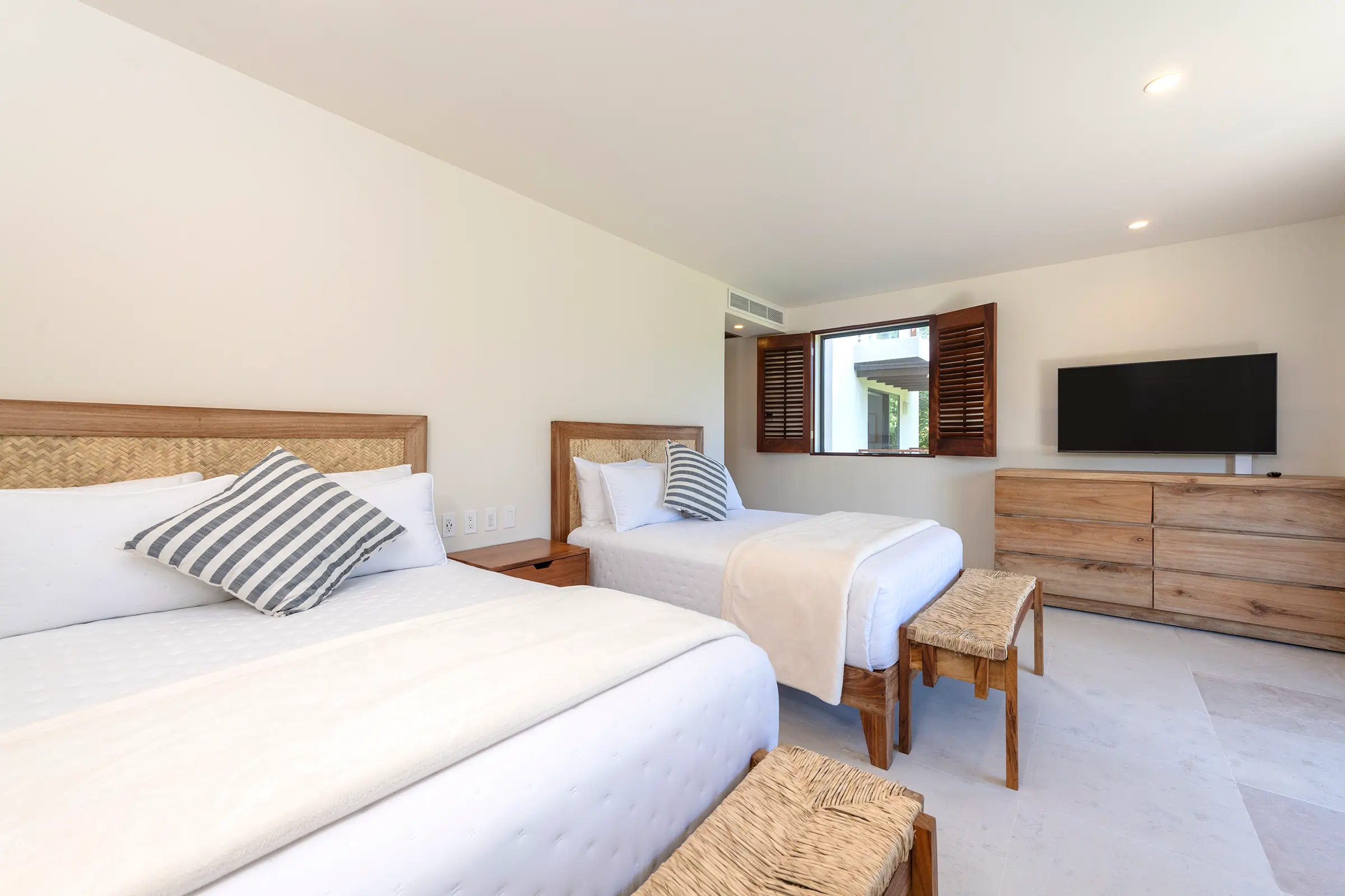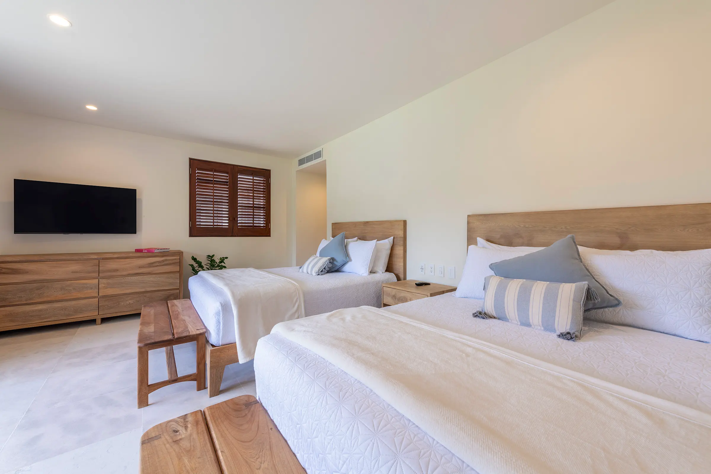 Two Queen-size beds, TV, and en-suite bathroom.