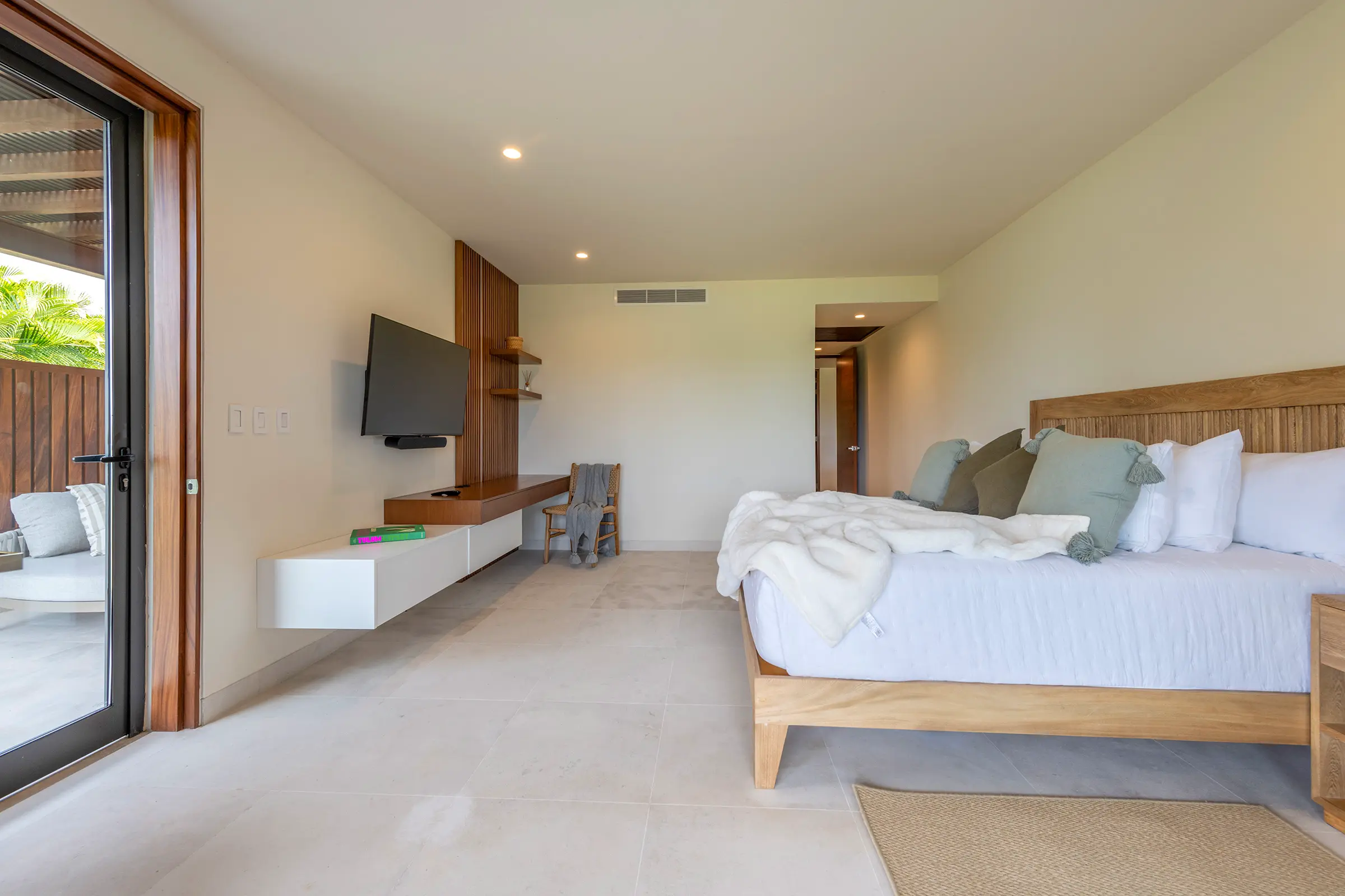 King-size bed, TV, en-suite bathroom, and access to a private patio.