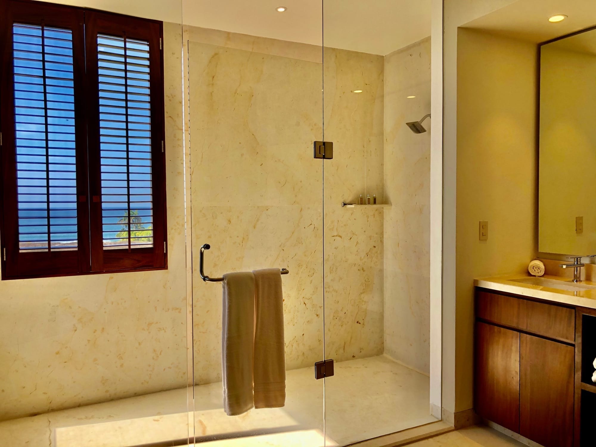 Another luxurious space with a king-size bed and an en-suite bathroom featuring dual vanity and shower. Like the principal bedroom, this opens to a front balcony, allowing guests to soak in the stunning ocean vistas.