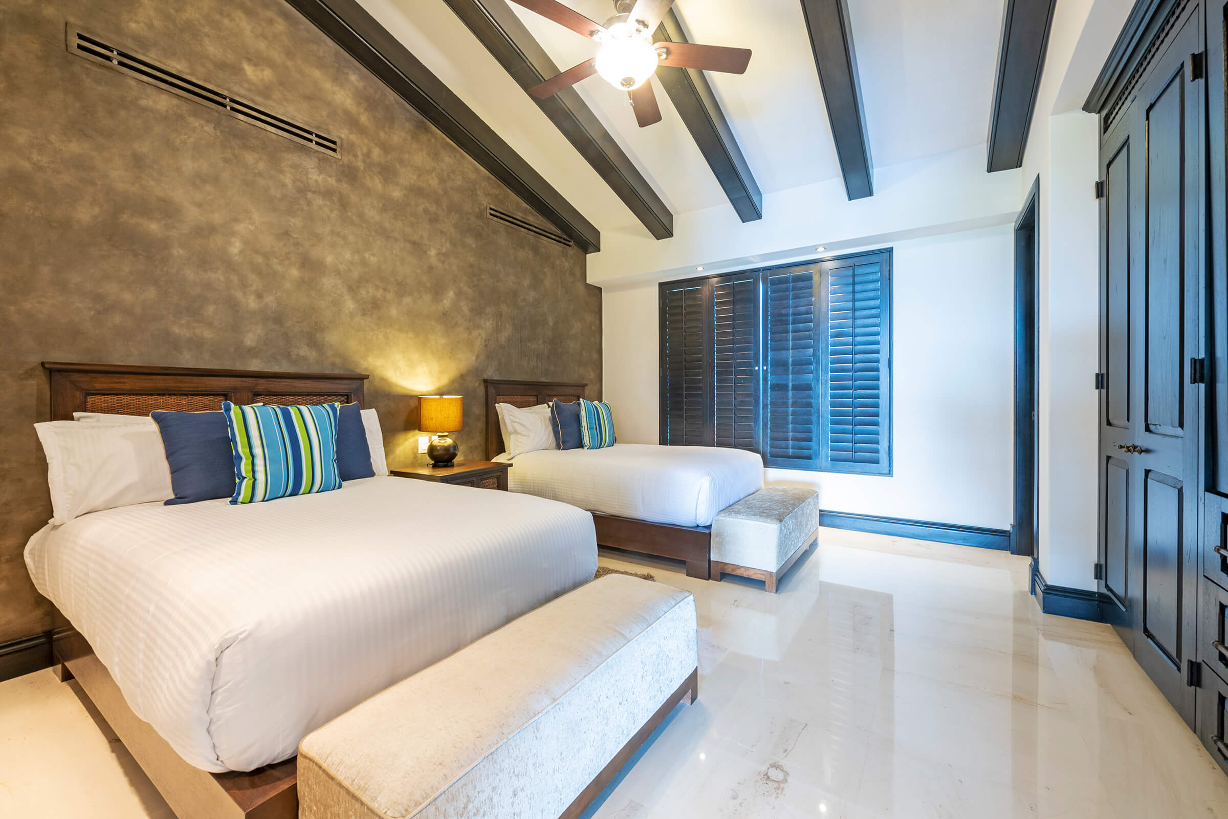 BEDROOM 3: Offers two double beds, an ensuite bathroom, a ceiling fan, air-conditioning, and a TV.