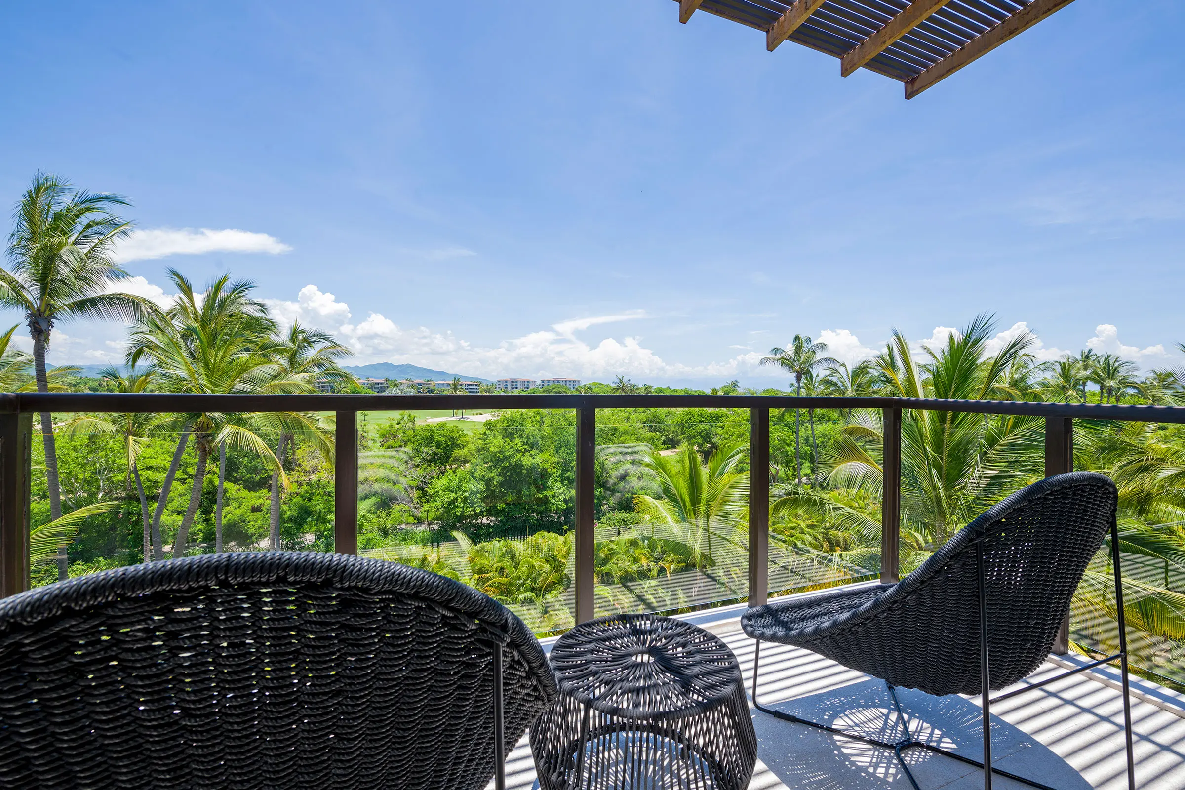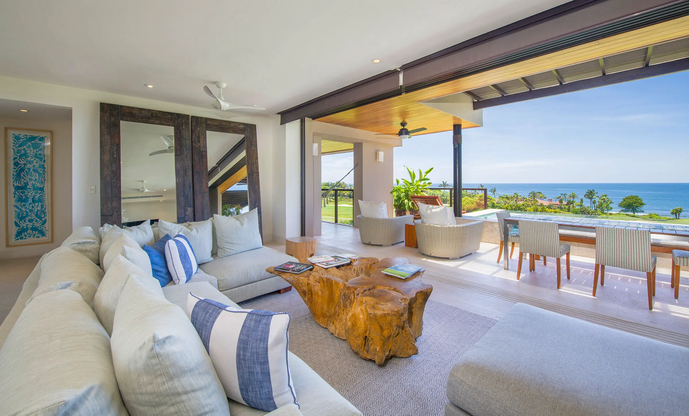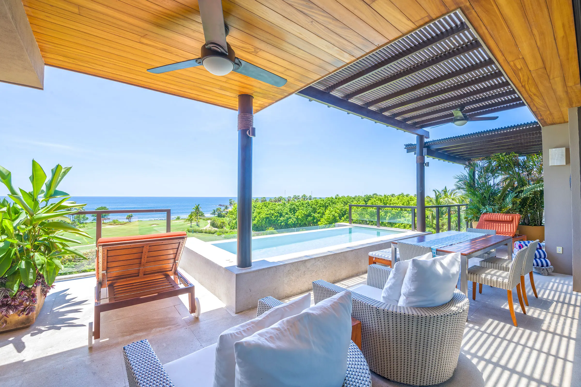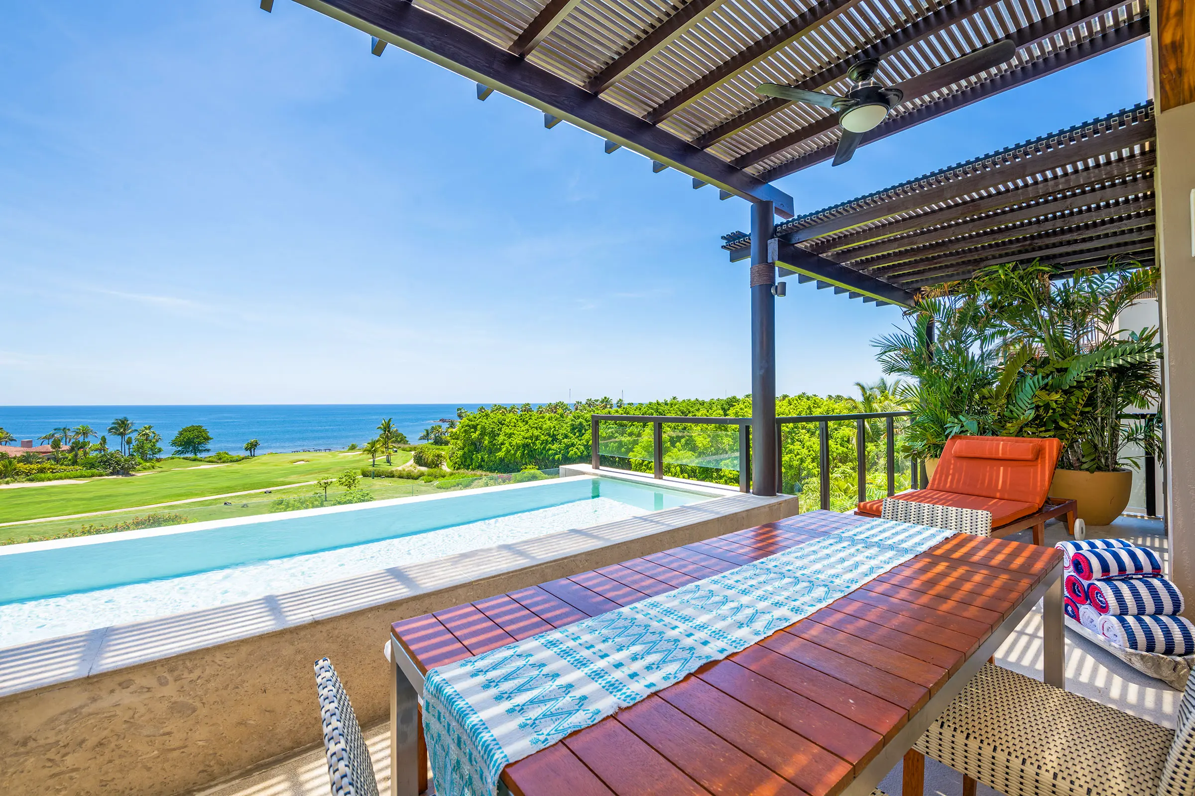 The condo has a private plunge pool, perfect for cooling off while admiring the ocean views, and a 6-person golf cart, making exploring Punta Mita’s beautiful surroundings easy. In addition, guests benefit from Premier Golf Membership, which grants access to Punta Mita’s world-class golf courses, beach clubs, and various exclusive amenities.