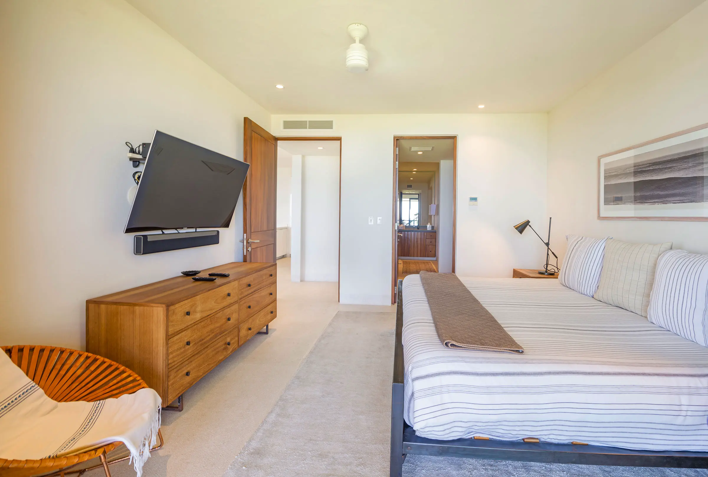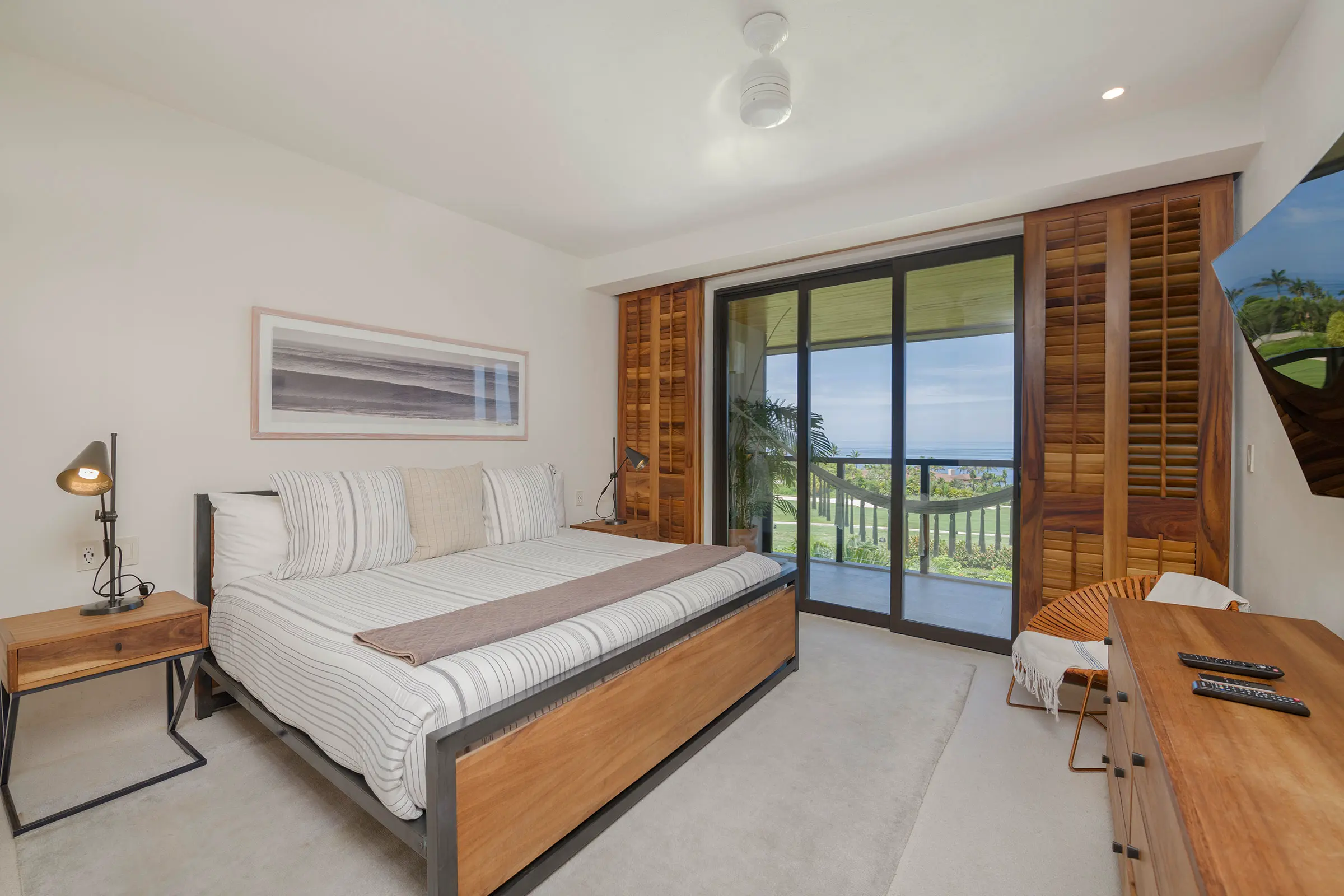The main bedroom features a luxurious king-size bed, offering the ultimate comfort for a restful night’s sleep. Guests will wake up to stunning ocean views from the room and enjoy direct access to the terrace, perfect for savoring morning coffee or an evening glass of wine. The en-suite bathroom is elegantly designed with a deep soaking tub, creating a private spa-like atmosphere where relaxation comes naturally. A flat-screen TV is also available for entertainment.