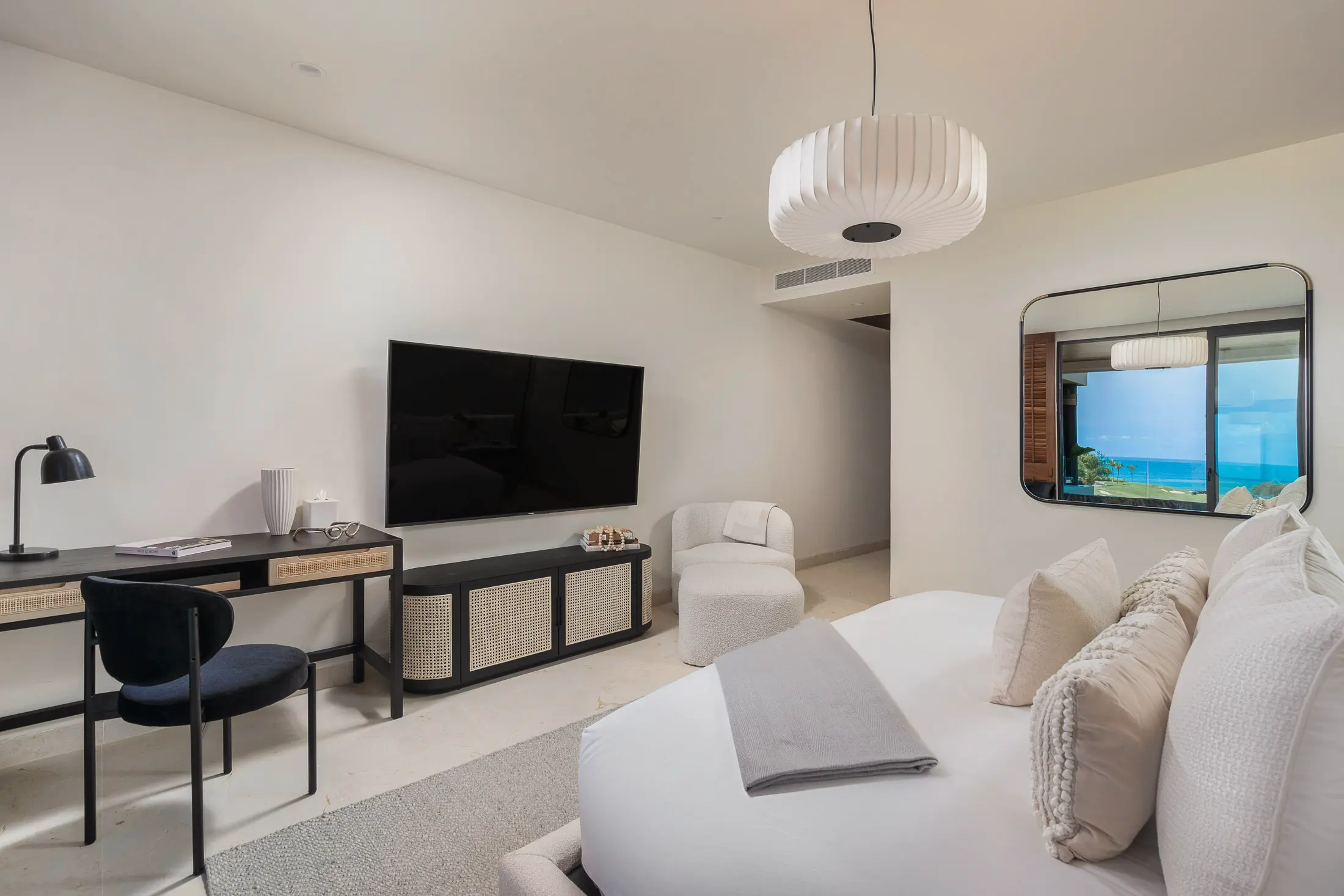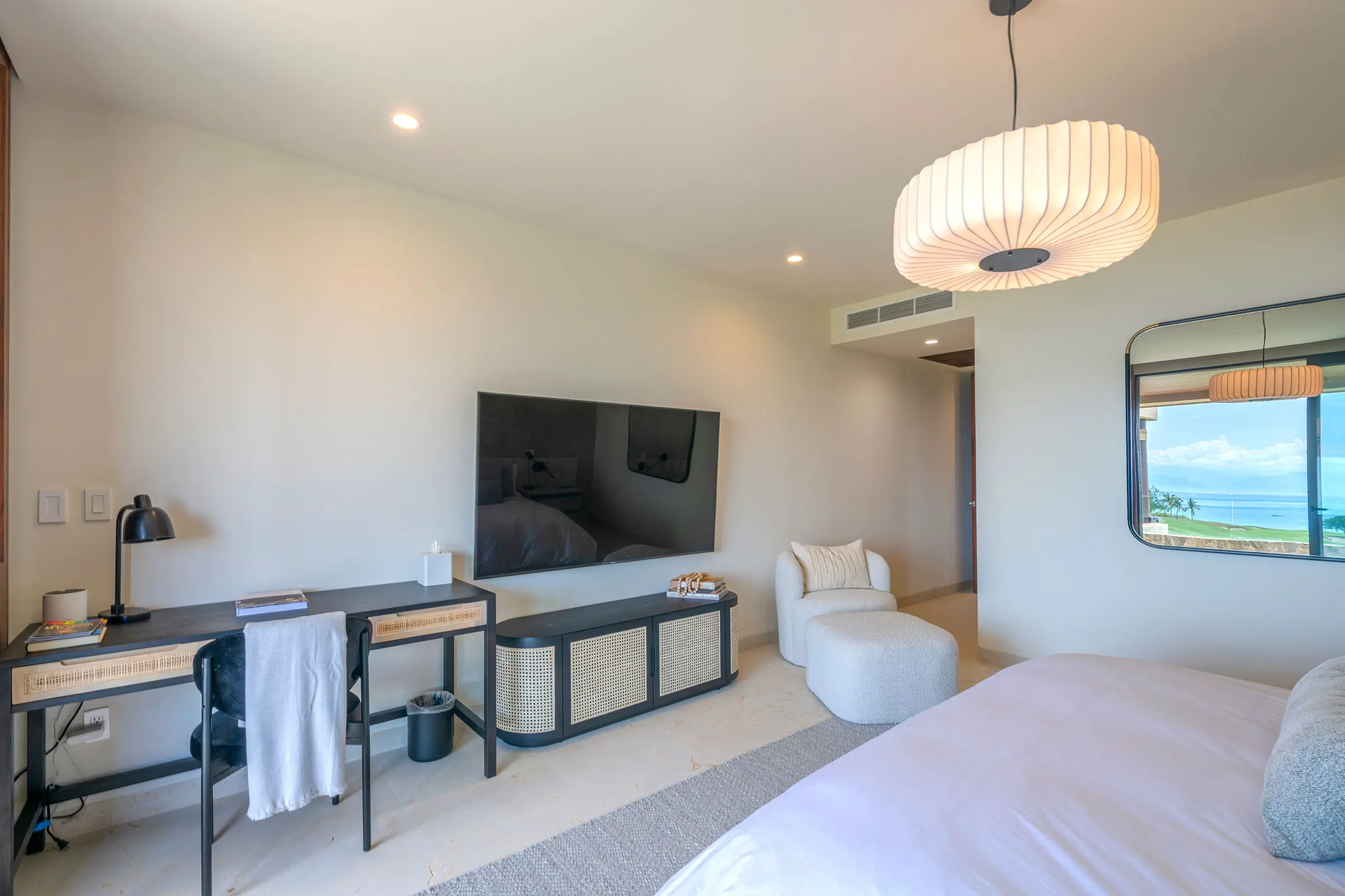 The spacious main bedroom offers a king-size bed and stunning ocean views from a shared patio. Relax in style with a private furnished patio balcony and an en-suite bathroom with a bathtub and shower. Air conditioning ensures comfort at any time of day.