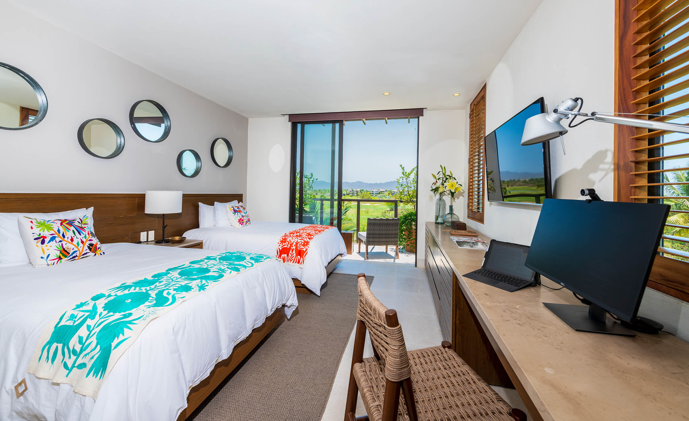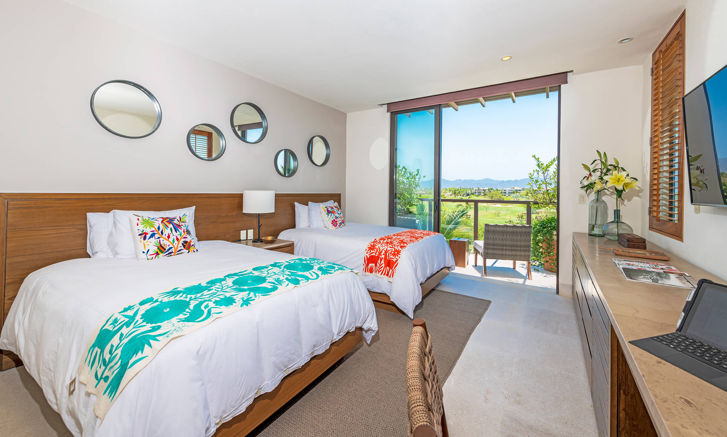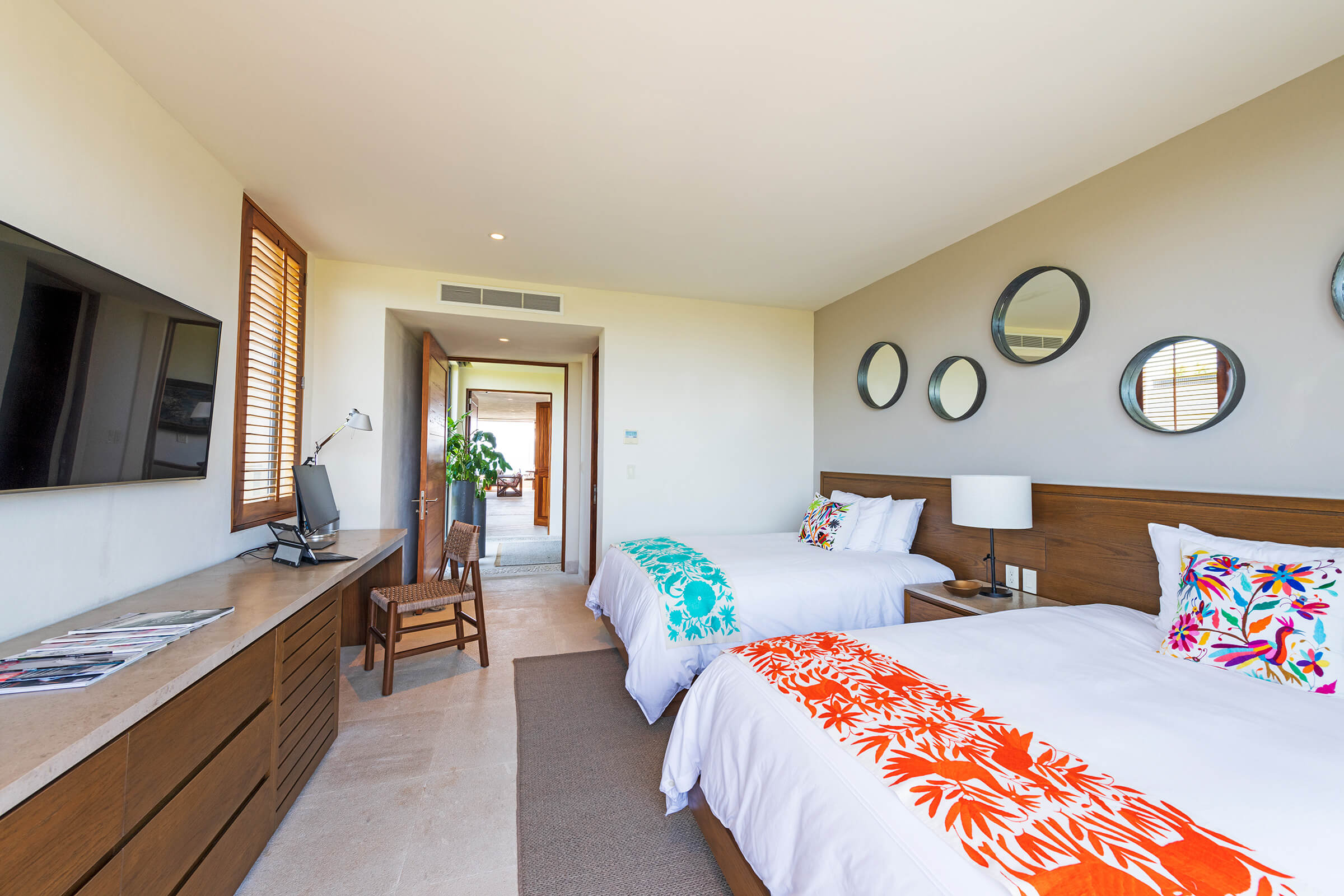 This room is designed for comfort and style. It has two double beds, a TV, and an en-suite bathroom with a rain shower, bathtub, and oversized vanity. The patio outside provides picturesque views of the shared lawn and the endless ocean.