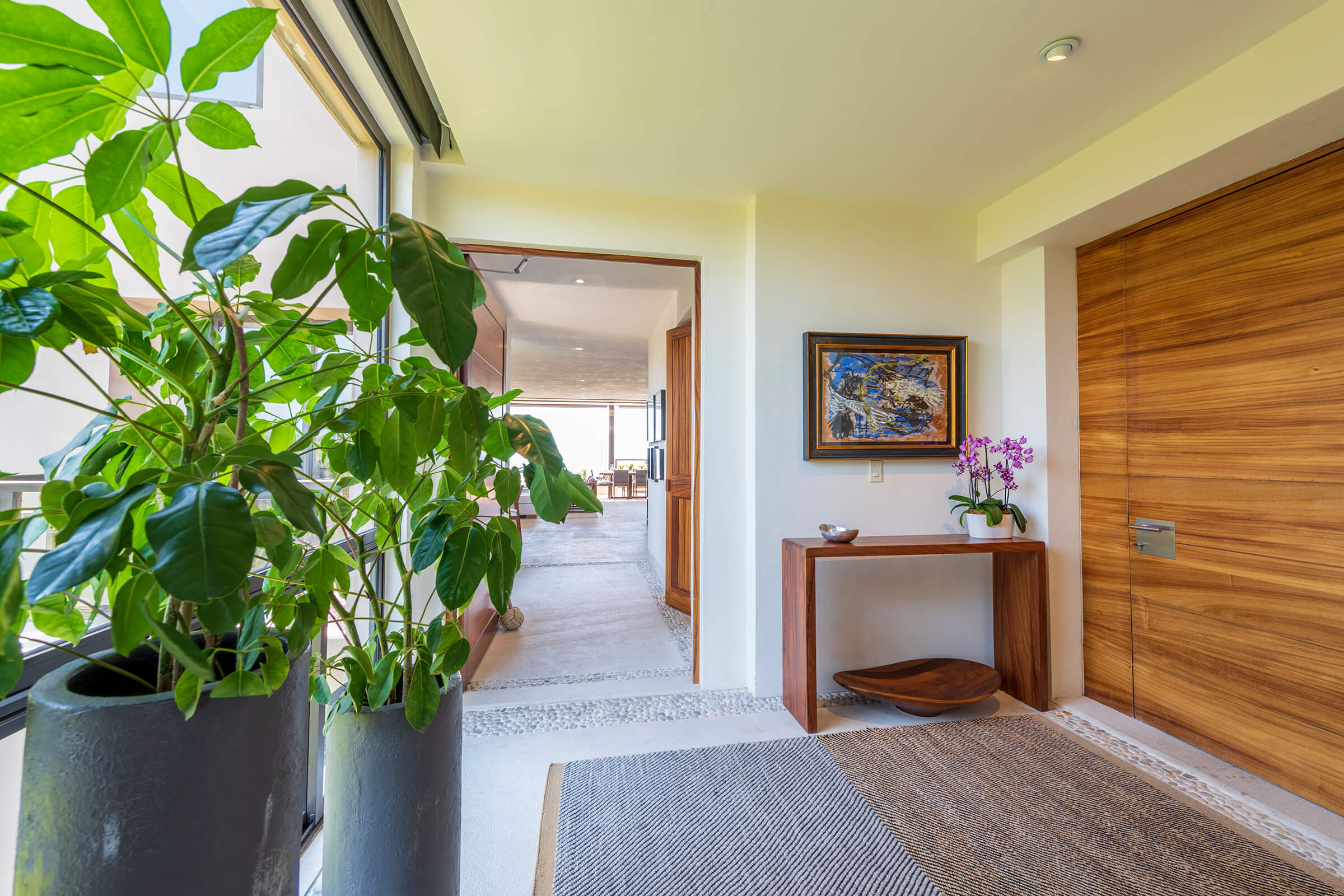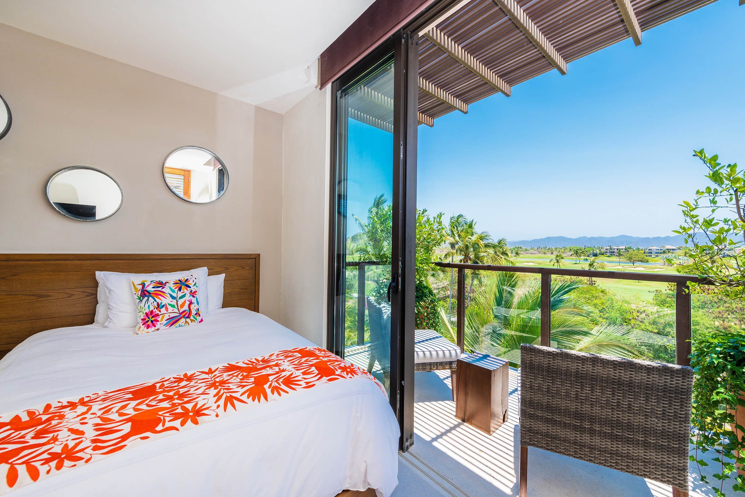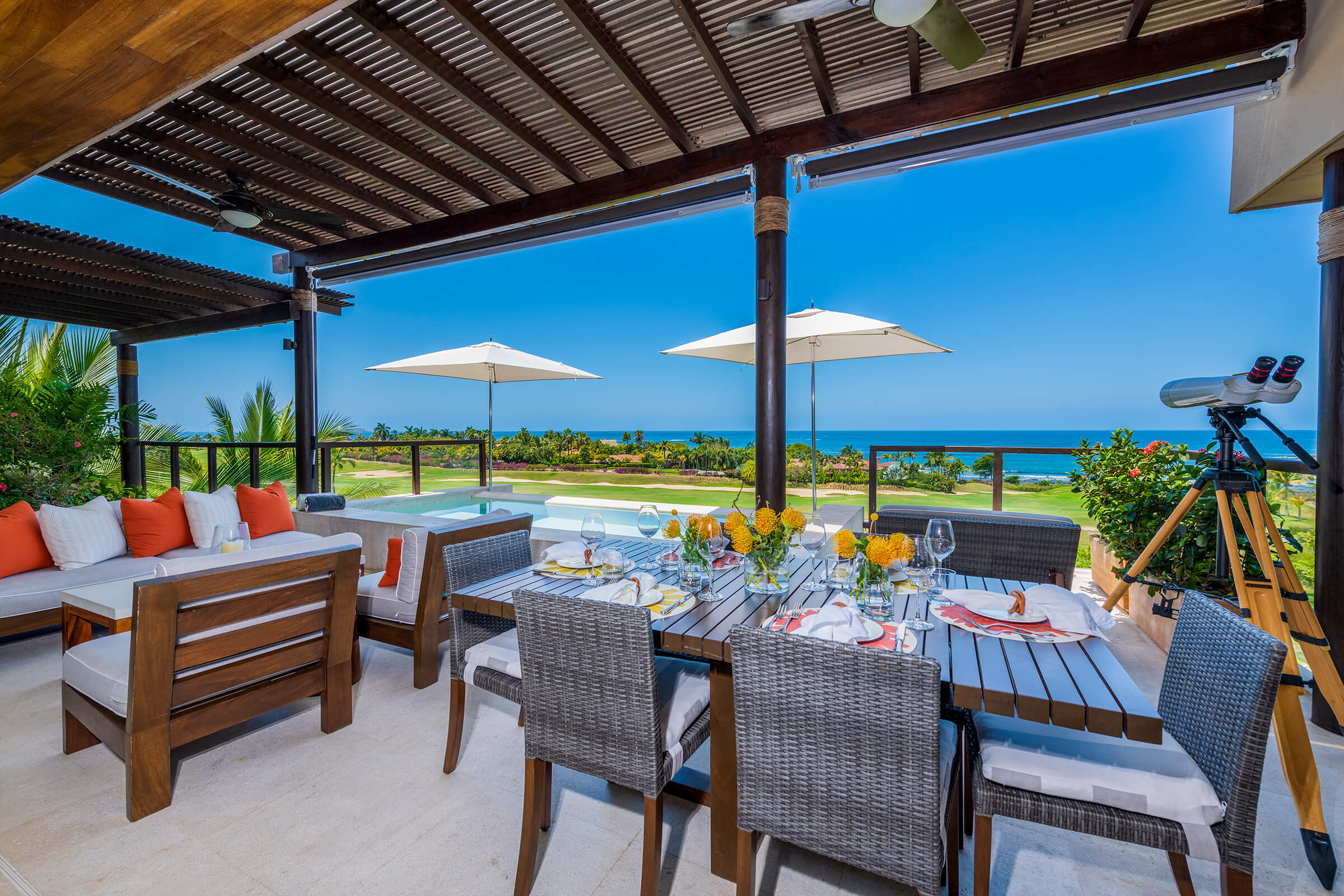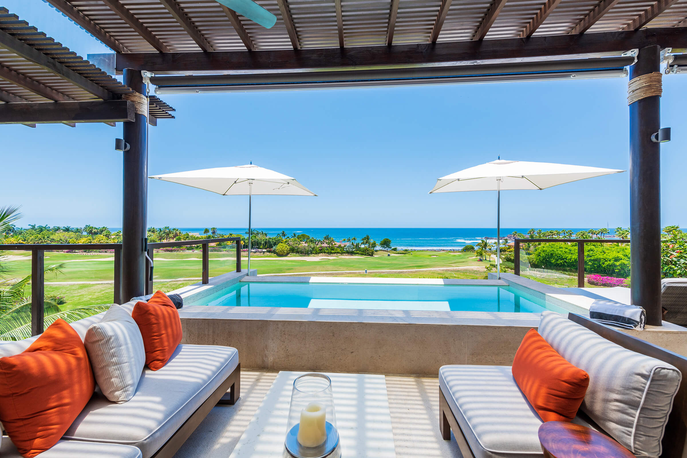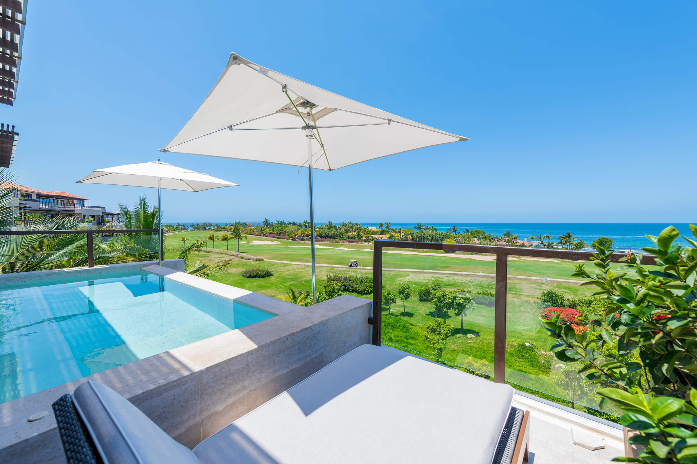 Condo Piscis, a luxurious sanctuary at Las Marietas, Punta Mita, Mexico, encapsulates elegance and serenity. This condo comprises three bedrooms and 3.5 bathrooms and can host 6-8 guests. From breathtaking ocean views to a private plunge pool and Premier Golf Membership, this residence promises an experience beyond the ordinary. It is ideally located beside the 18th hole of the Jack Nicklaus Signature Bahía Golf Course. Condo Piscis neighbors the esteemed Four Seasons property, presenting you with premier dining options within the gates.