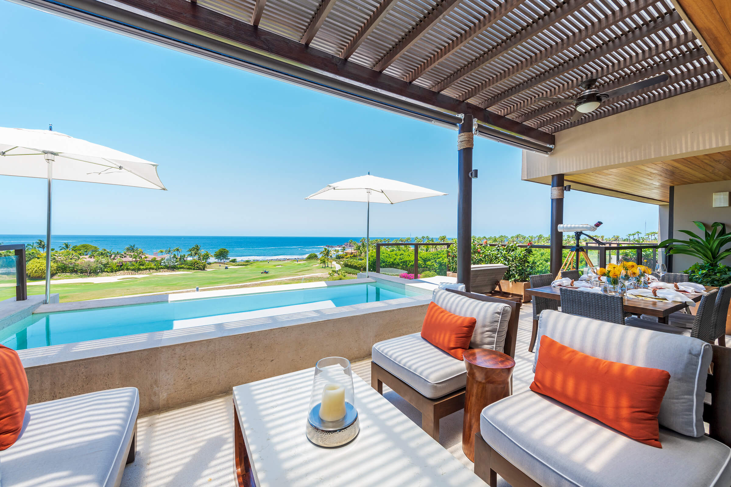 Embodying sophisticated contemporary design, Condo Piscis boasts two ocean-facing master bedrooms with en-suite bathrooms, an additional outdoor shower, a sprawling private terrace with a plunge pool, and separate living and dining areas.