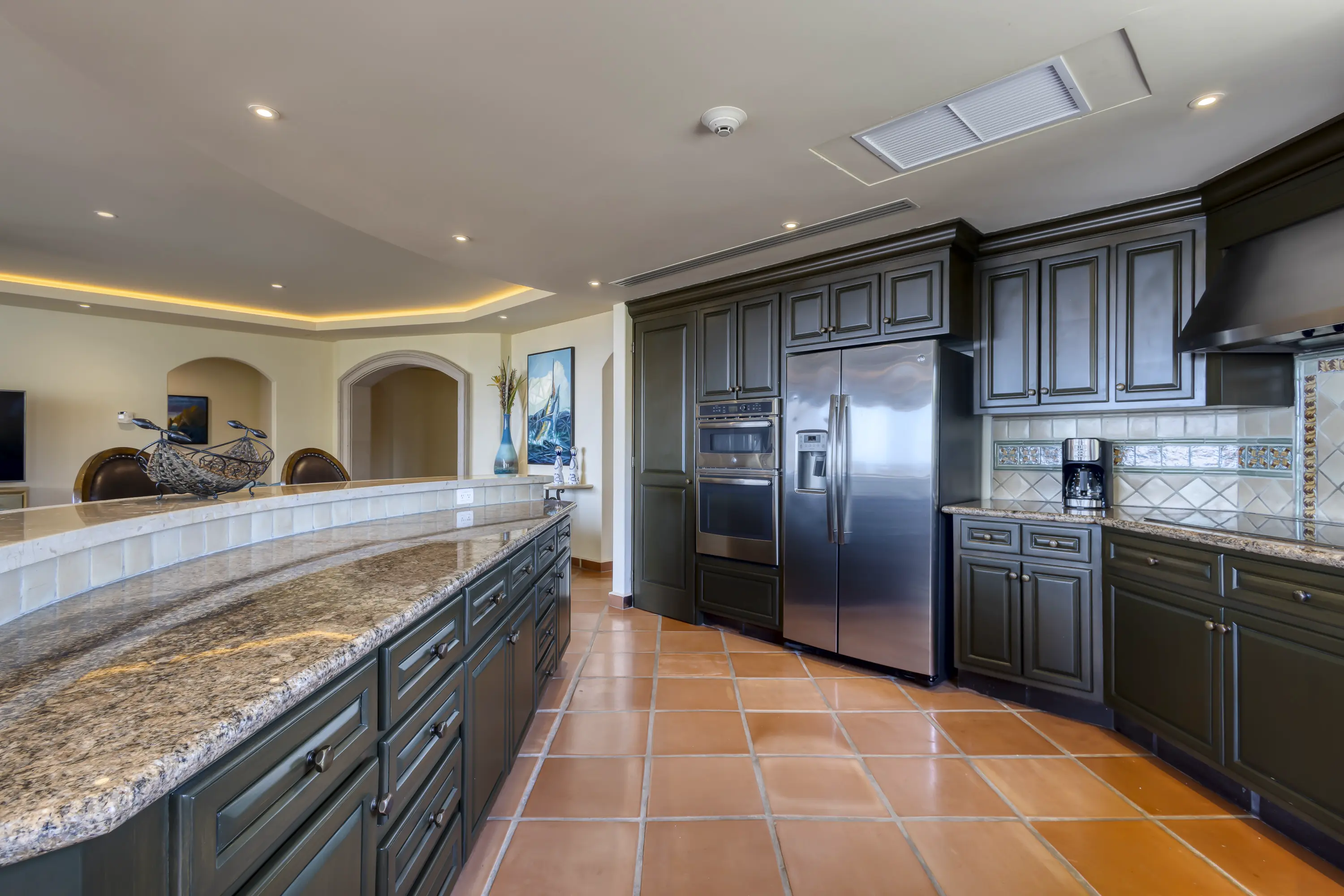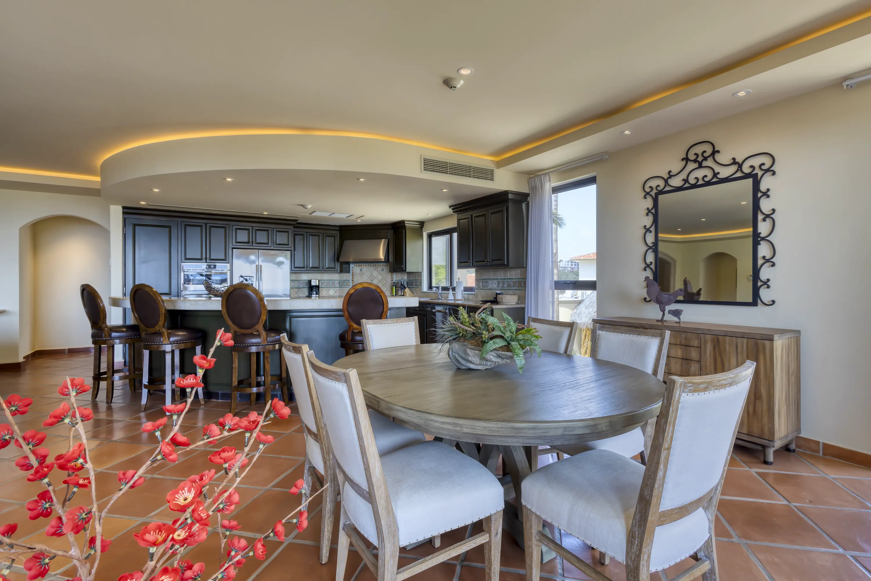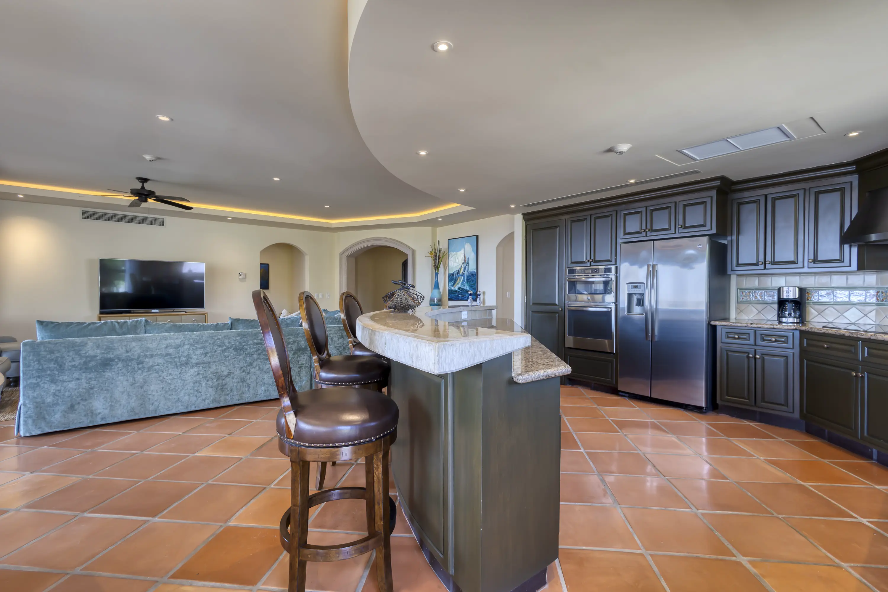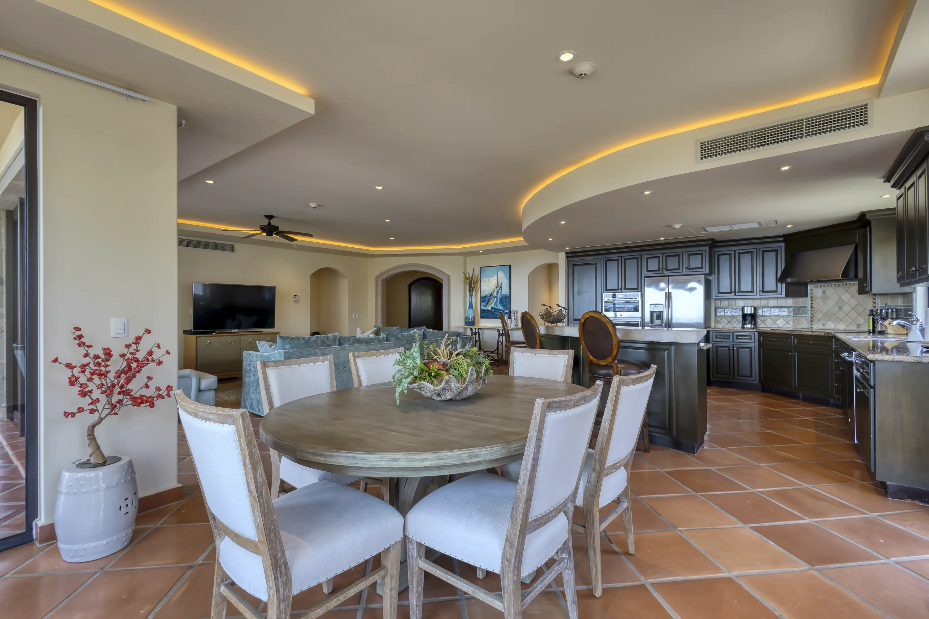 The large kitchen is well-equipped with upgraded appliances and stocked with all your kitchen needs. The kitchen, dining, and living room areas are open-concept and tastefully decorated. Beautiful accent lighting, a Samsung “5” TV, a Sonos Sound System, and Apple TV on all TVs allow you to watch your favorite programs (HULU TV, ESPN, Disney, HBO, etc.) while enjoying incredible ocean views. A large sliding door with a screen opens to a spacious outdoor living area, complete with a round bar-height table for three, a counter-height round table for six, and a gas BBQ, perfect for enjoying outdoor dining with ocean views.