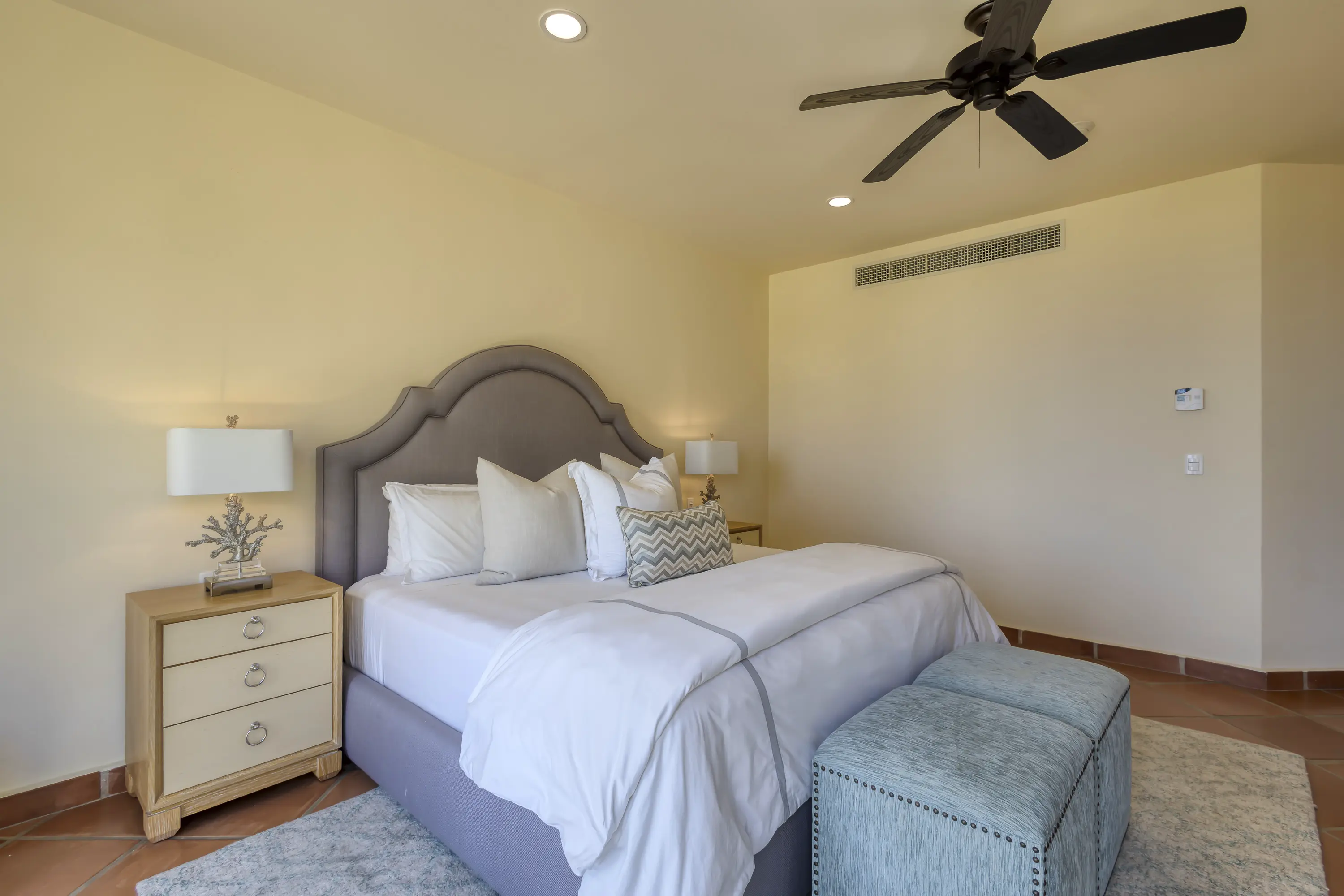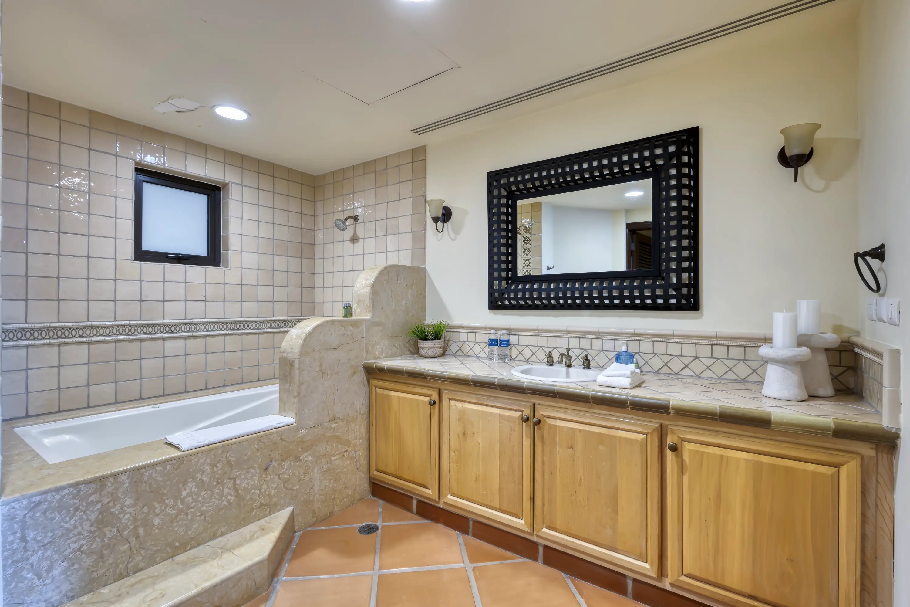 Enjoy this luxury 2-bedroom, 2.5-bath, third-floor condo in the Marlin B Building, one of Cabo’s best-kept secrets. The large main bedroom features a king-sized bed, a large en-suite bathroom with a whirlpool tub, shower, double sinks, a closet, and access to the terrace with stunning ocean views.