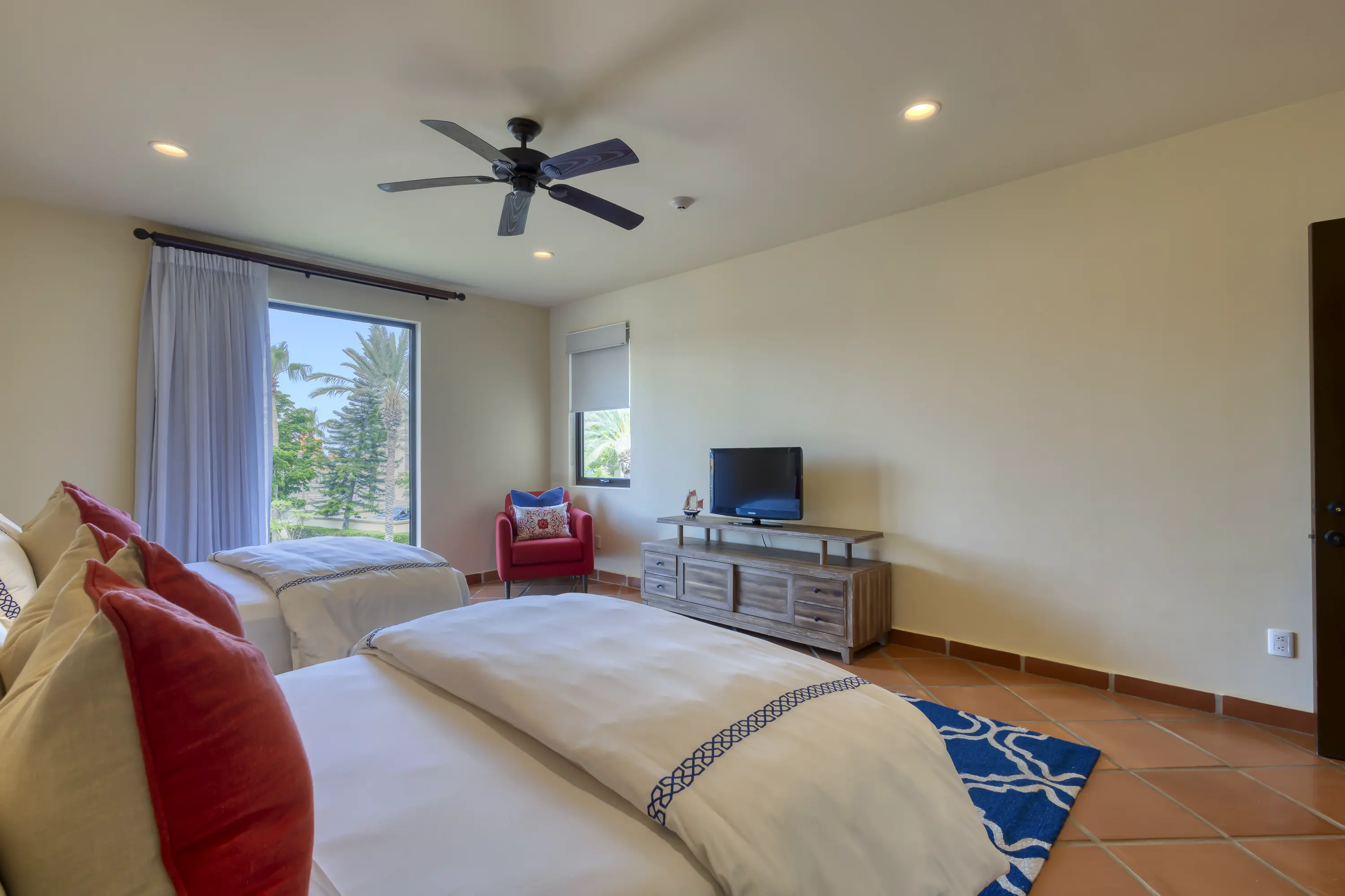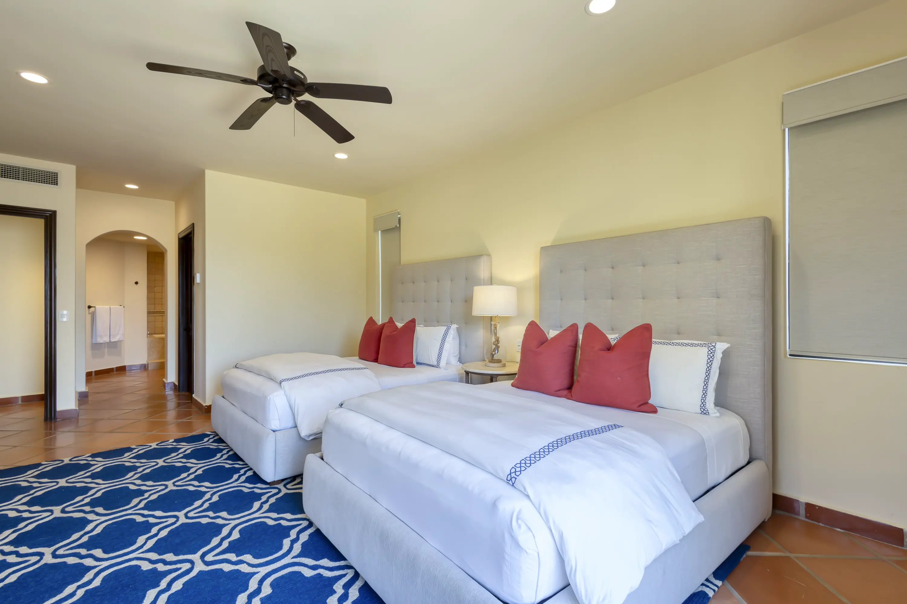 The second bedroom is a large junior master with two queen-size beds. It also features a large en-suite bathroom with a whirlpool tub, shower, and ample closet, making it perfect for families.