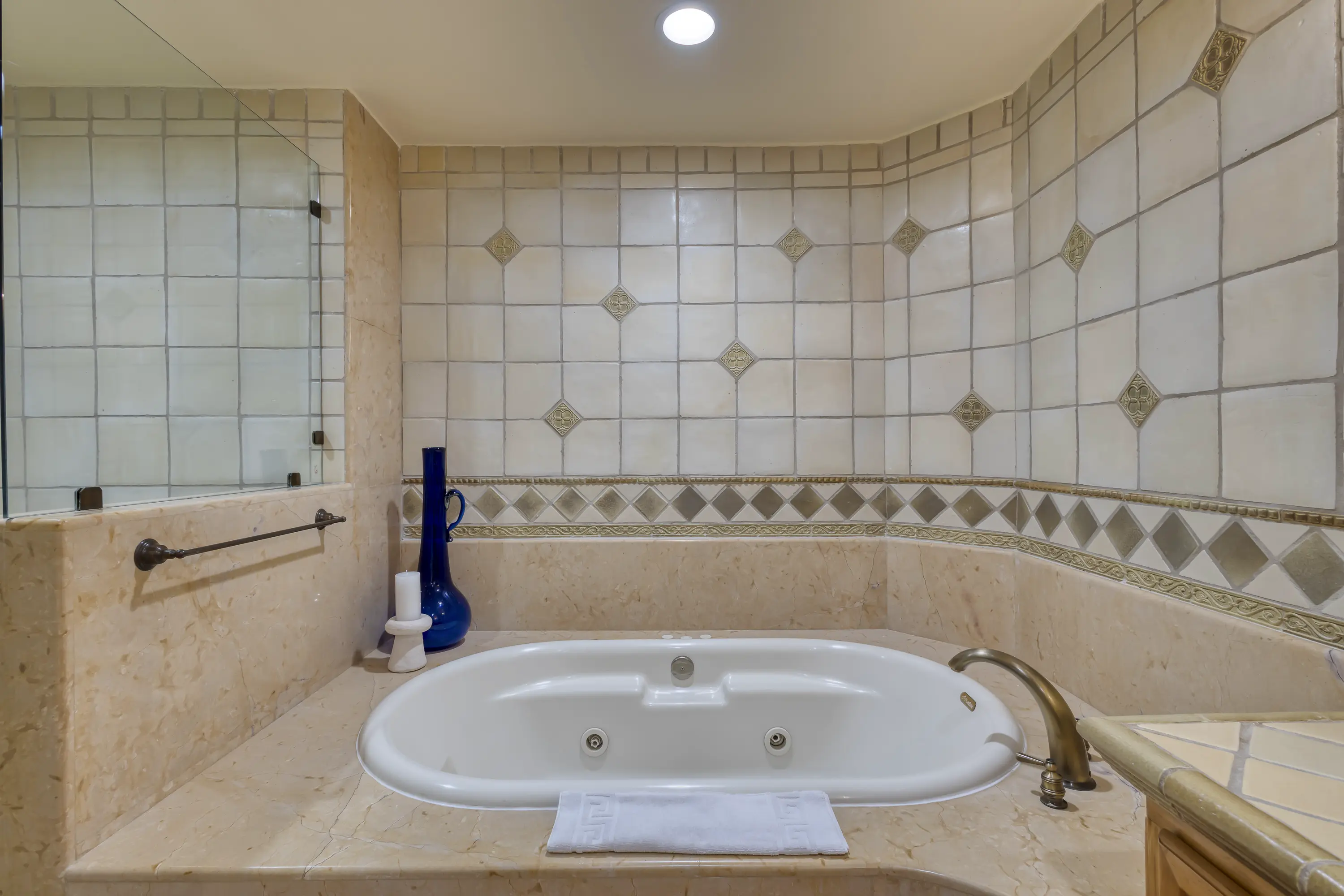 The condo includes a jetted Jacuzzi, an outdoor living and sitting bar area, and a chaise lounge with an al fresco dining table. These amenities provide ample options for relaxation and enjoyment.