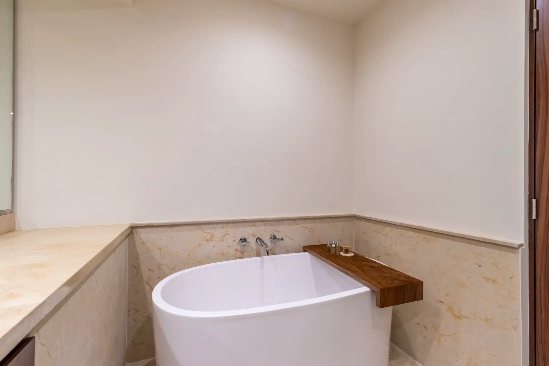 The second bedroom also boasts a king-size bed with a TV, air conditioning, and a double closet. It includes a comfortable sofa and a dedicated workspace. This bedroom also has access to a balcony with pool and ocean views, furnished with outdoor seating. The ensuite bathroom includes a double vanity, an indoor shower, and a bathtub.