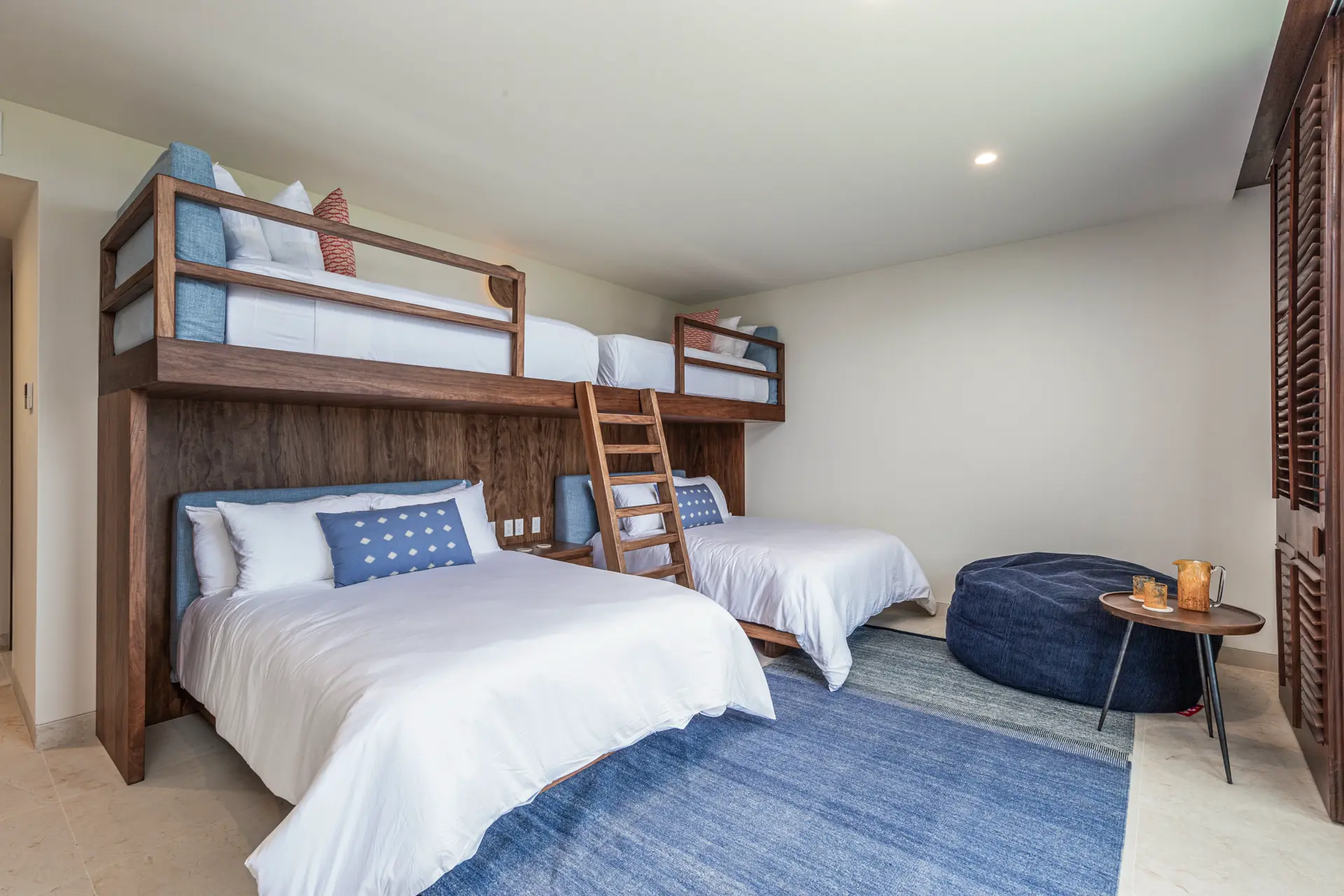 The third bedroom is ideal for families, featuring two queen-size beds, each with a single bunk above, perfect for children. It also has a TV, air conditioning, and an oversized beanbag for relaxation. The double closet provides ample storage space. The balcony offers ocean views and outdoor furnishings. The ensuite bathroom includes a double vanity, an indoor shower, and a bathtub.