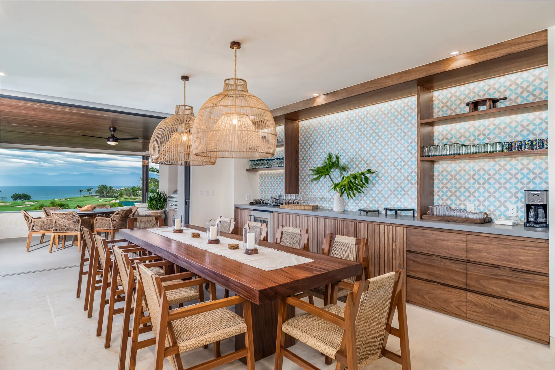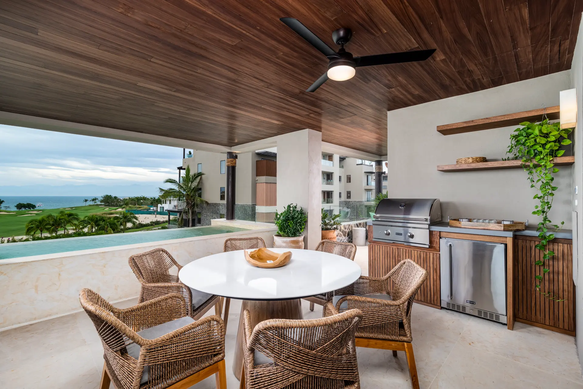 The condo’s private heated pool is on the balcony, offering a secluded relaxing spot. An al fresco dining area and a gas BBQ grill are available for outdoor meals, providing a perfect setting to enjoy the panoramic ocean views. The included 6-seat golf cart makes exploring the resort and nearby Punta Mita town easy.