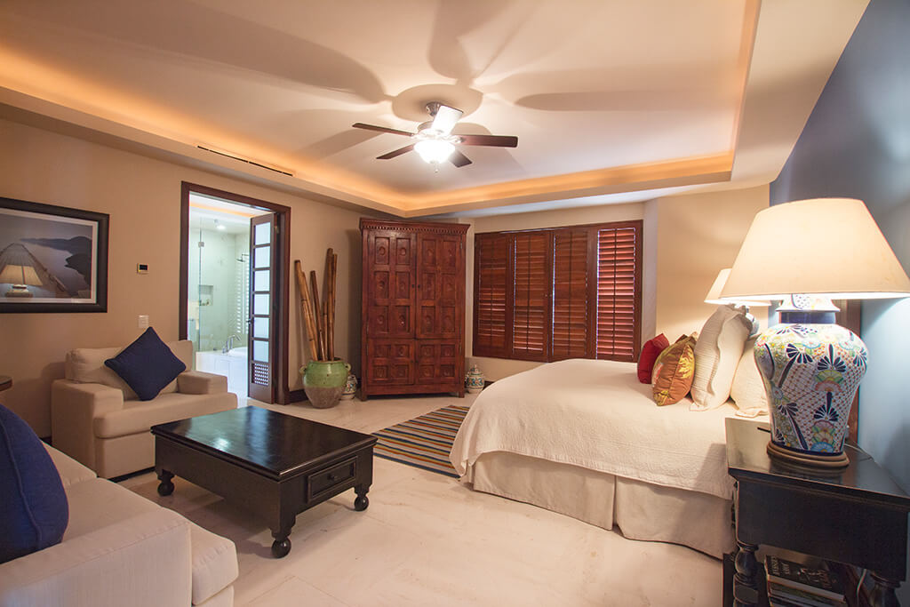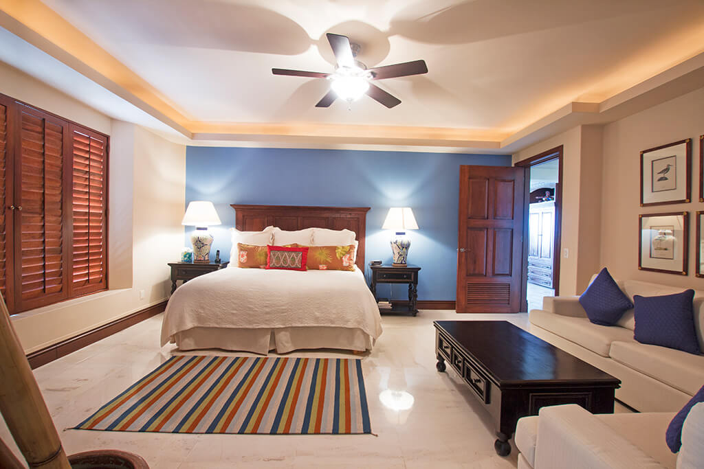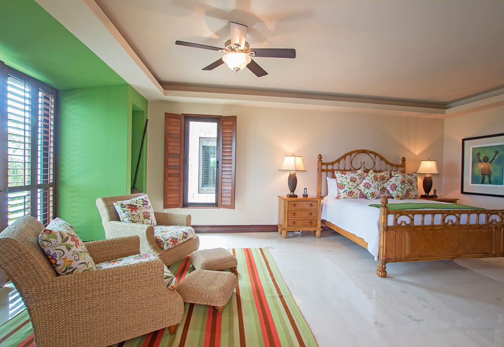– **MAIN BEDROOM 1:** It has a King-size bed, an ensuite bathroom (tub/shower), a ceiling fan, air conditioning, a flat-screen TV, and a telephone.