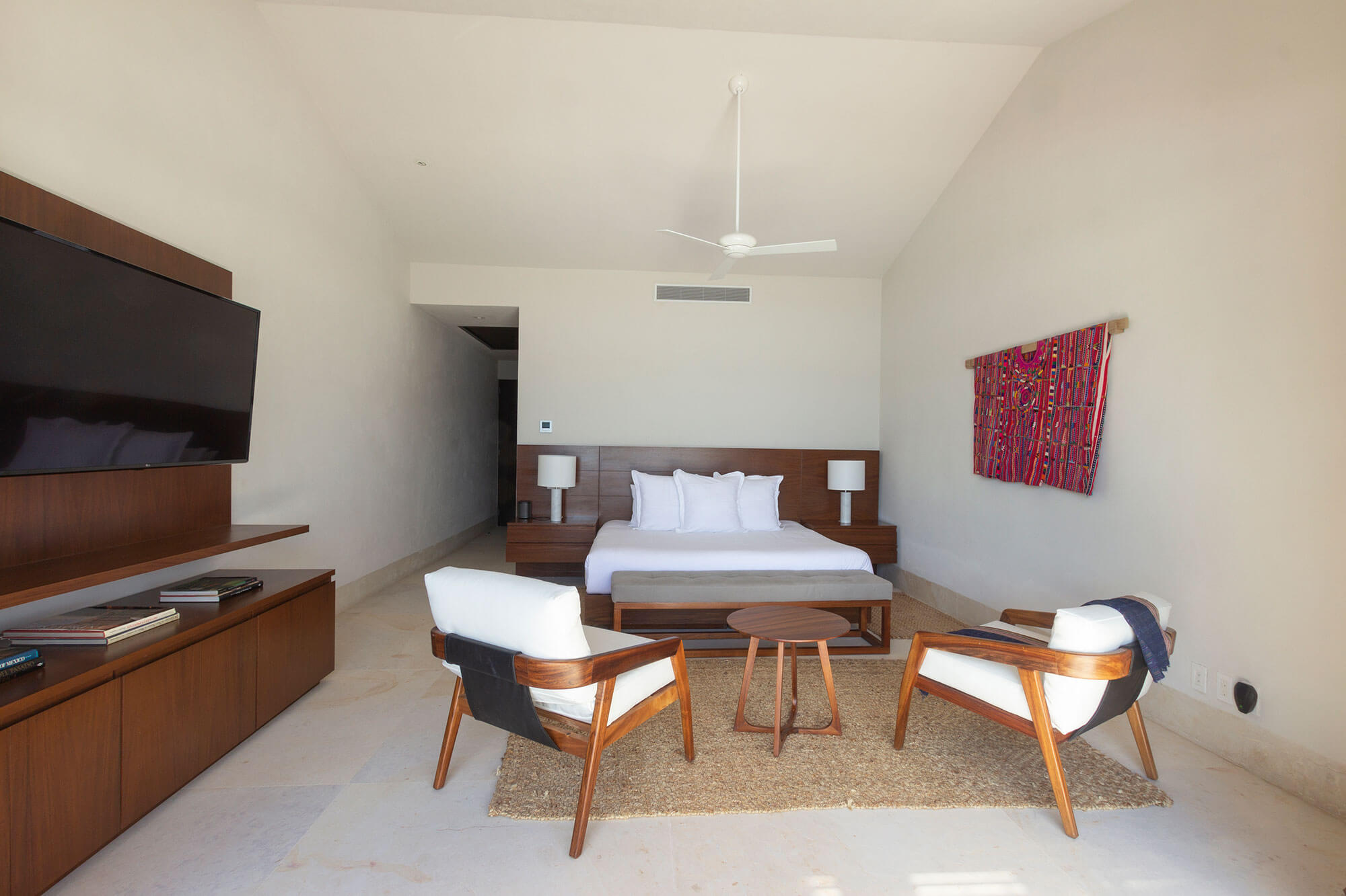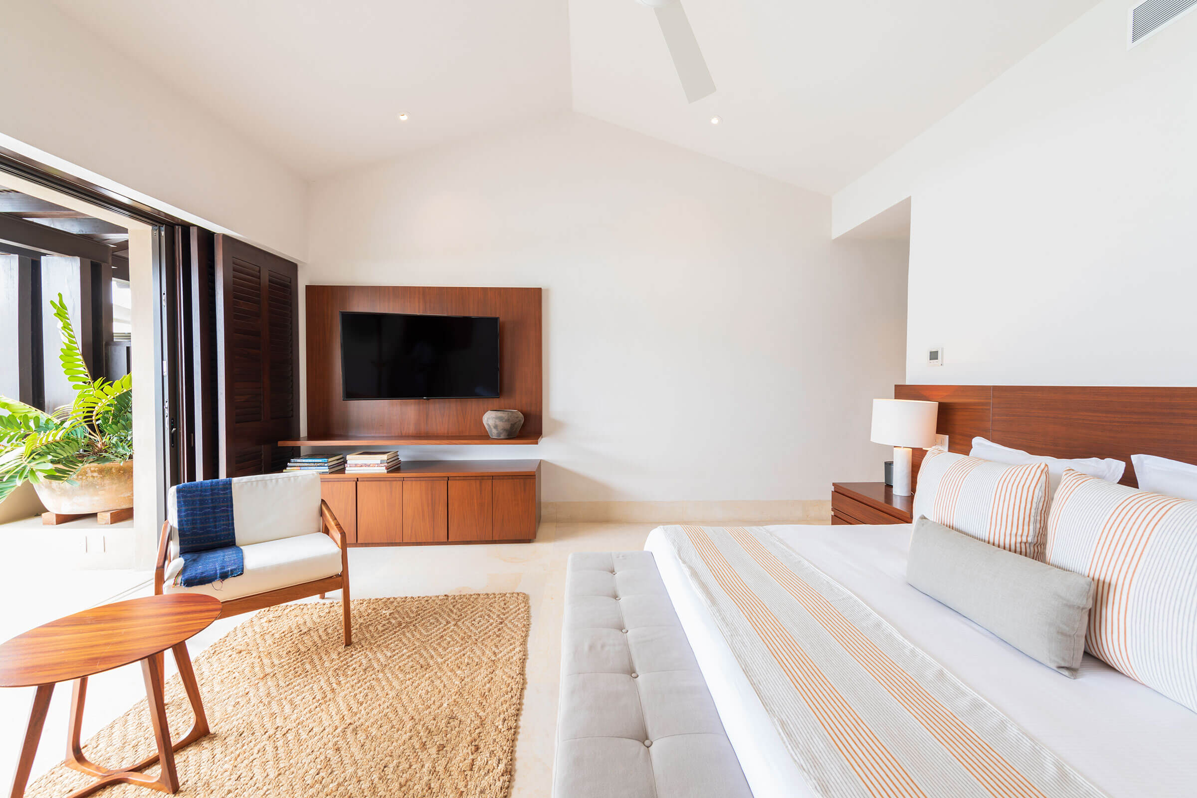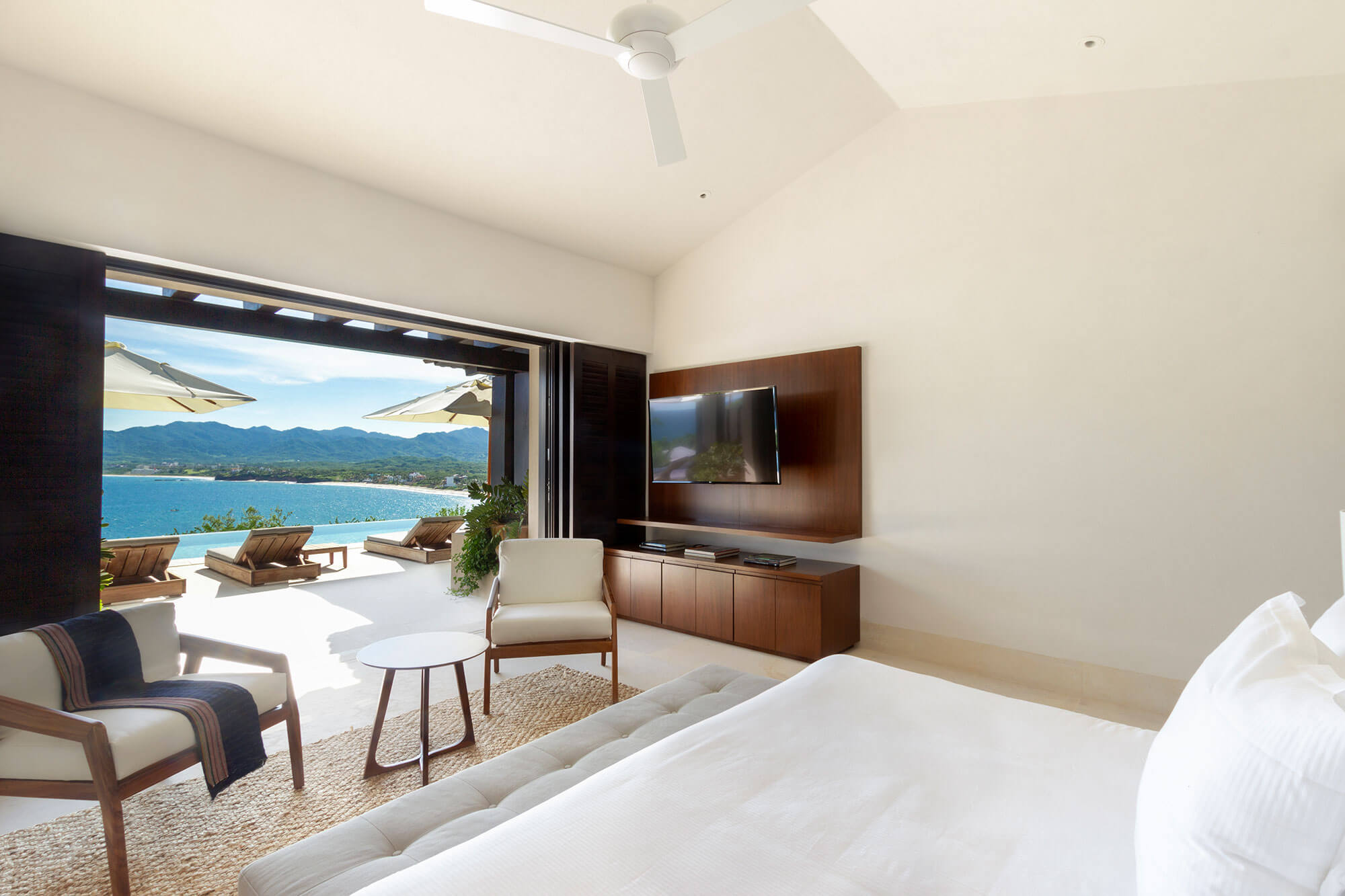 Unwind in Bedroom 2, featuring a king-size bed, a TV, air conditioning, and a ceiling fan. The ensuite bathroom offers a shower and ample closet space. Most importantly, soak in the panoramic ocean vistas.