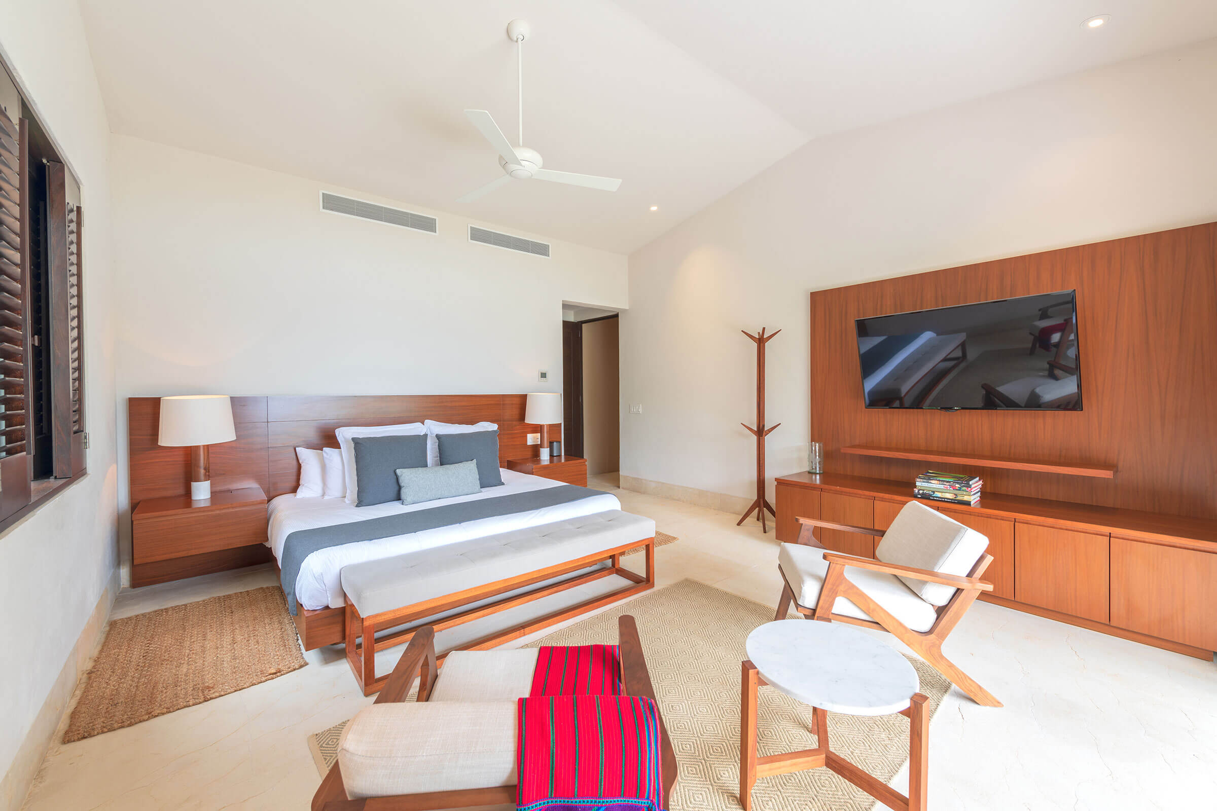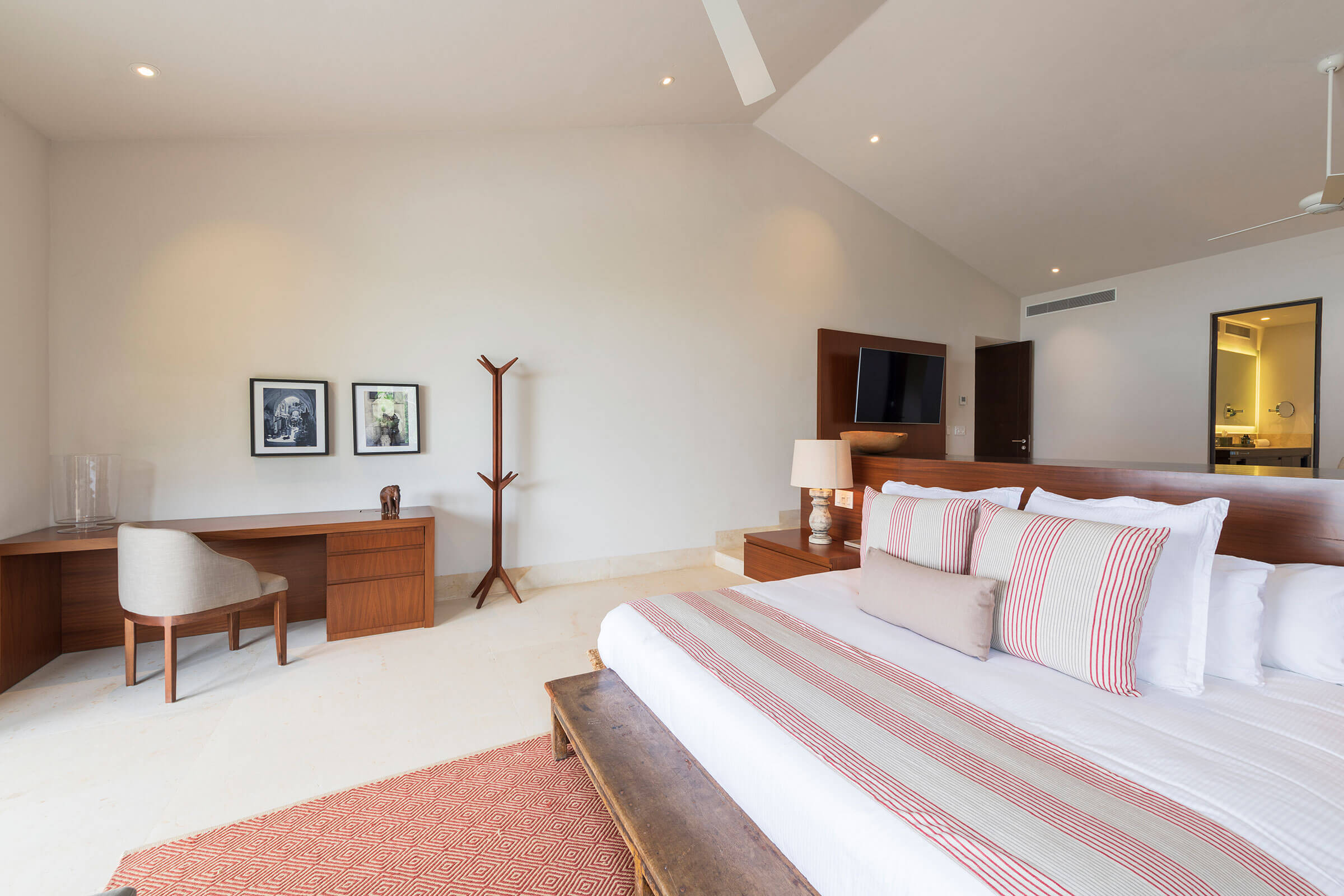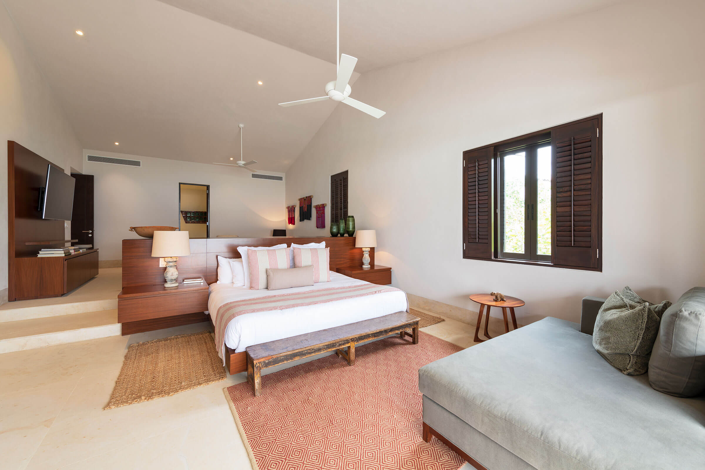 The main bedroom radiates luxury. It houses a king-size bed, a personal sitting area, and a desk. The ensuite bathroom with a shower and tub enhances the lavish ambiance. Plus, there’s a TV, air conditioning, and a ceiling fan for comfort and entertainment. From here, savor the spellbinding ocean views.