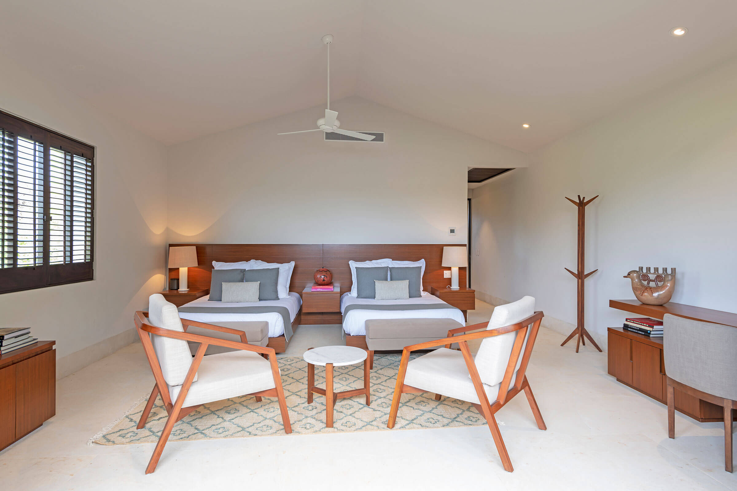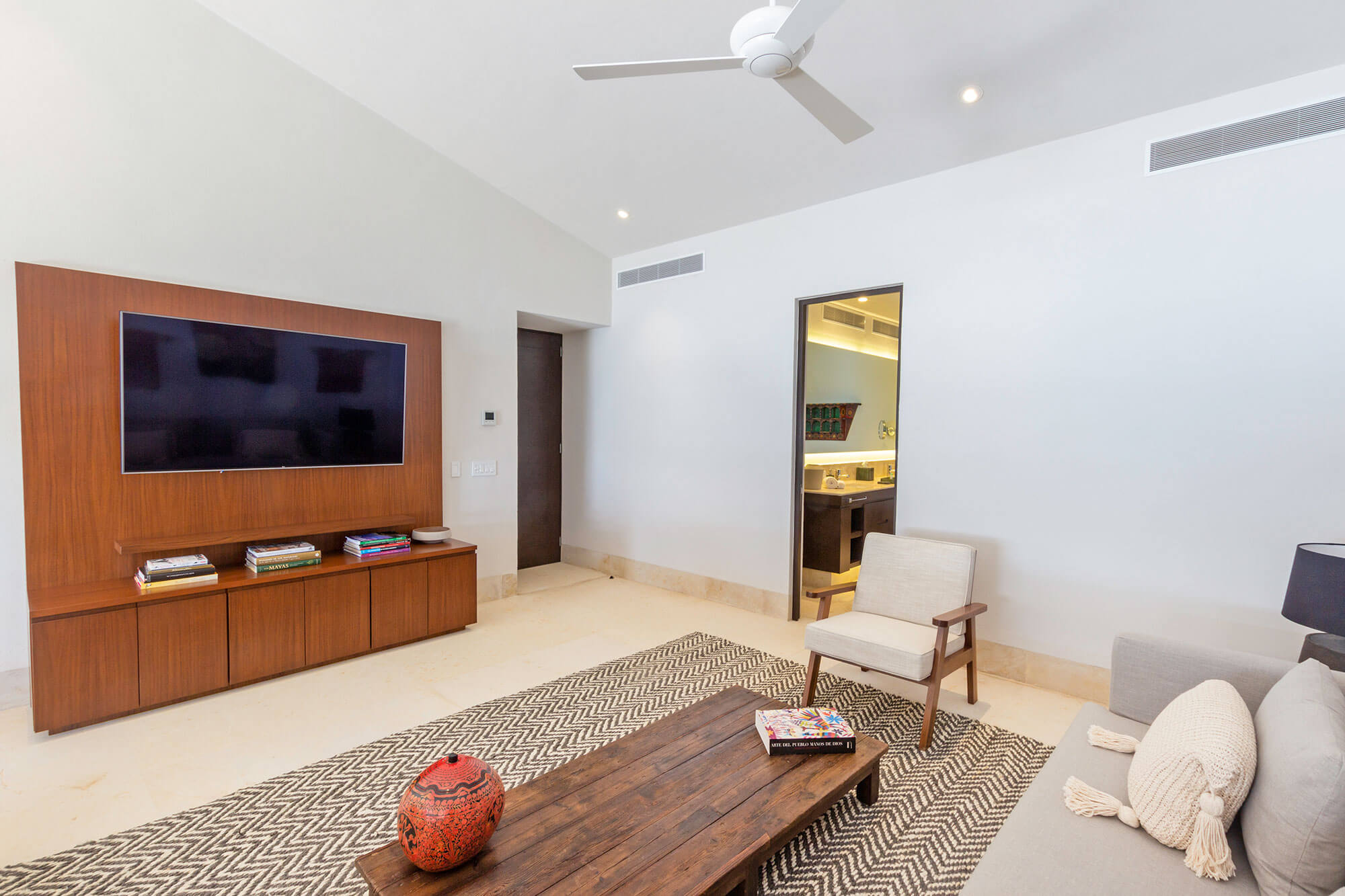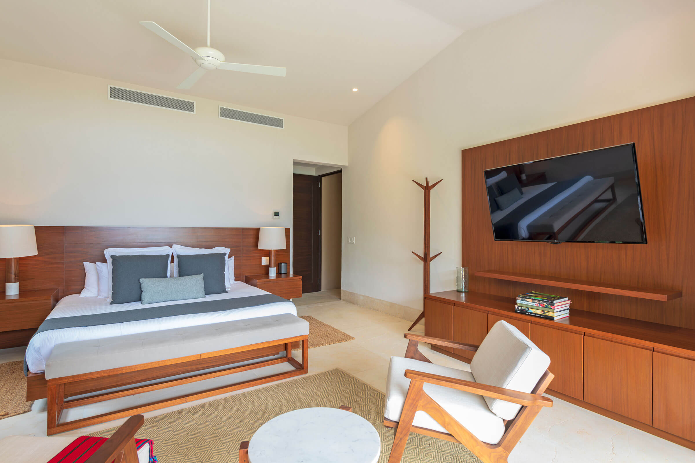 The main bedroom radiates luxury. It houses a king-size bed, a personal sitting area, and a desk. The ensuite bathroom with a shower and tub enhances the lavish ambiance. Plus, there’s a TV, air conditioning, and a ceiling fan for comfort and entertainment. From here, savor the spellbinding ocean views.
