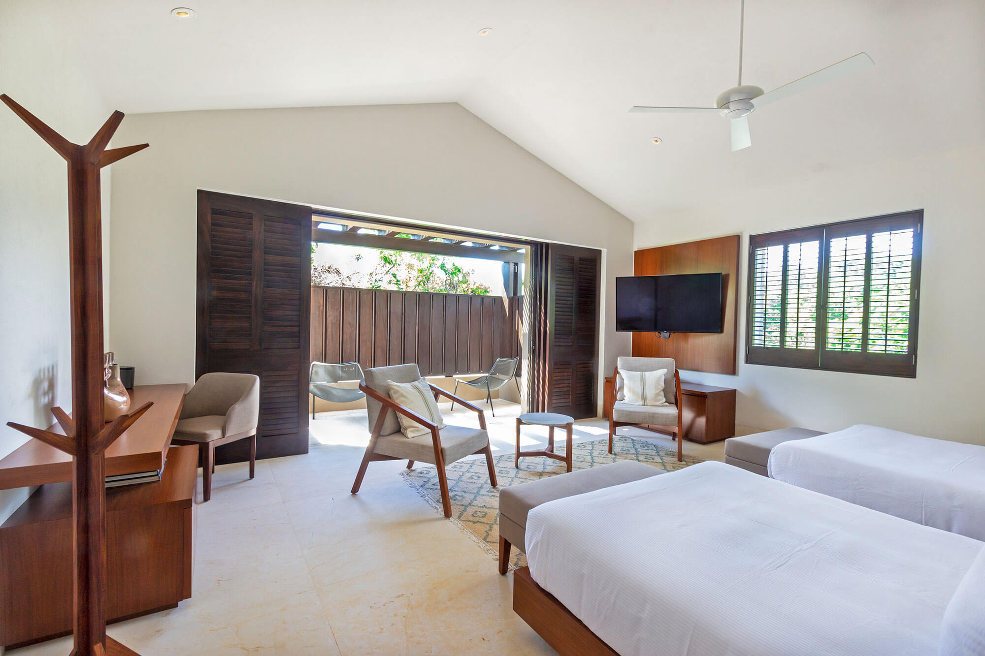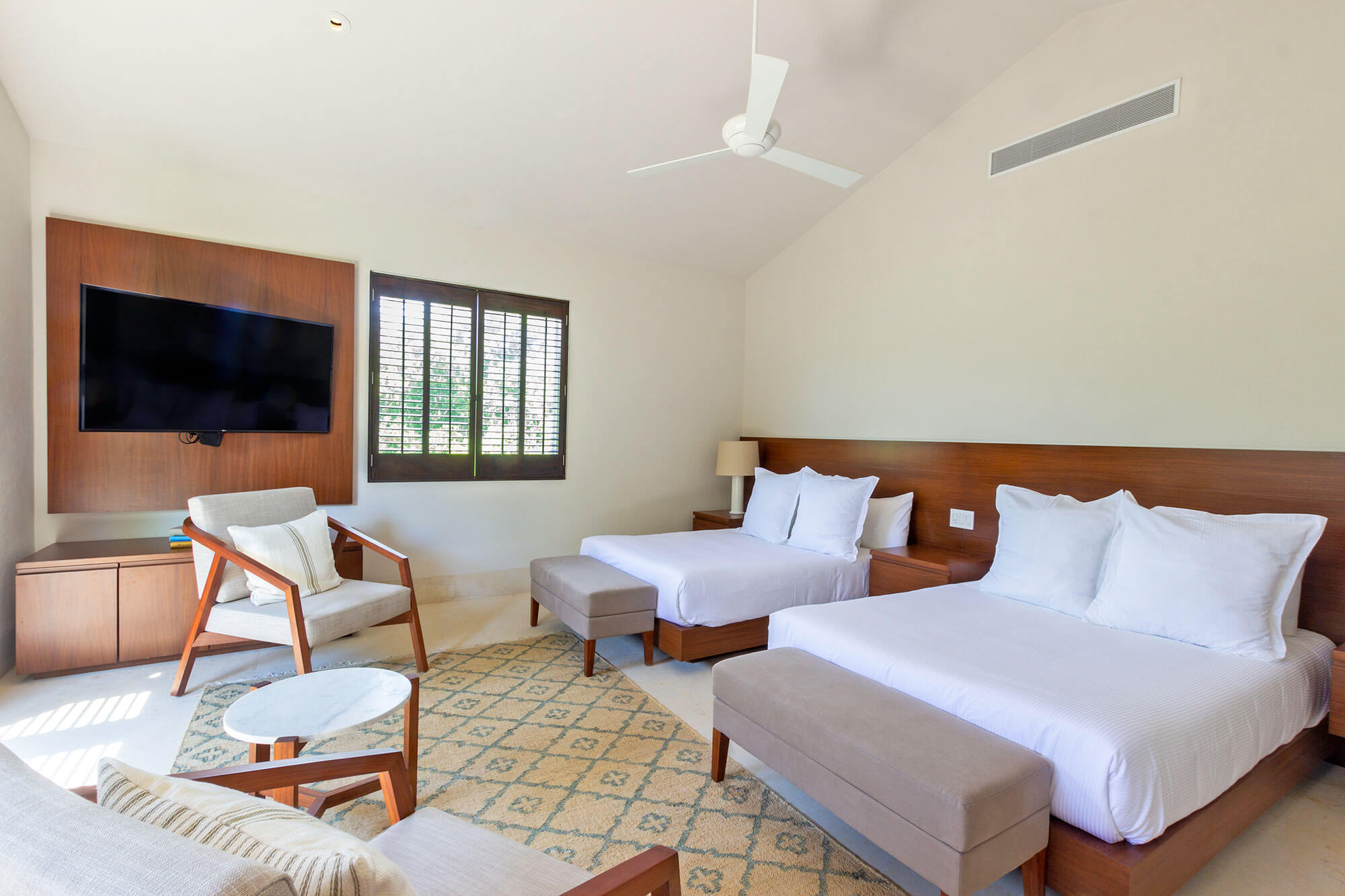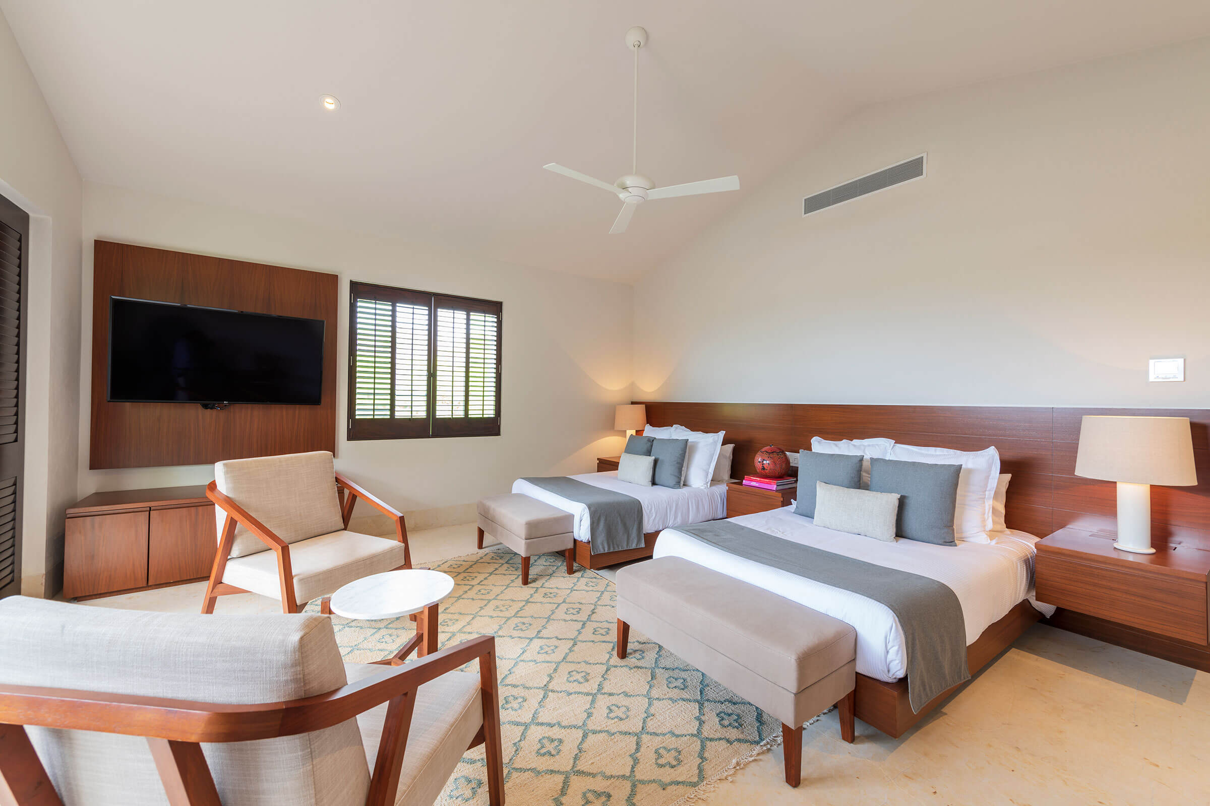 Bedroom 4 is comfortably fitted with two full-size beds, a TV, air conditioning, and a ceiling fan. An ensuite bathroom with a shower and tub and a closet are other features to expect.