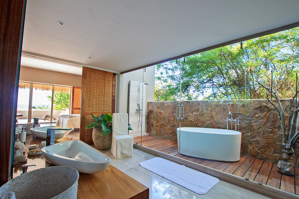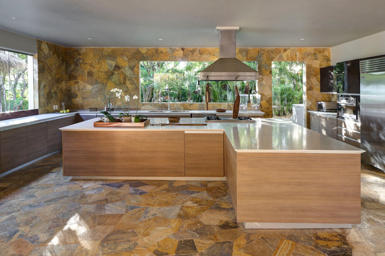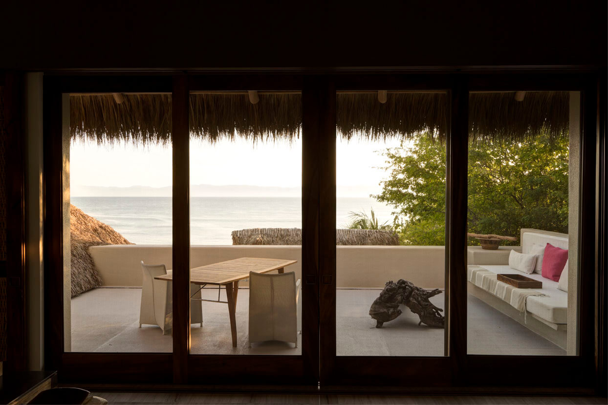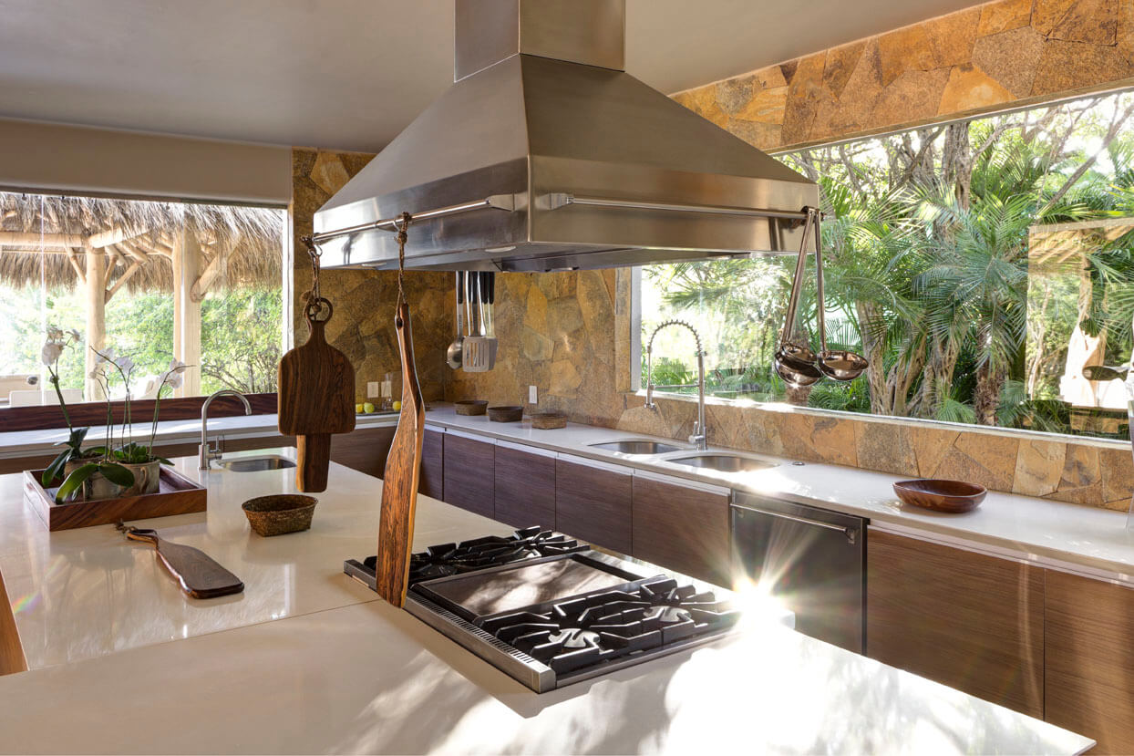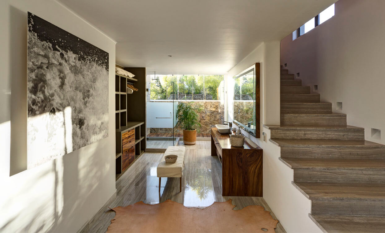 Estate Palo de Brasil also offers stunning outdoor features. An open-air living room and a sunset terrace offer captivating vistas of Banderas Bay and the Marieta Islands. There’s a heated or cooled infinity swimming pool with a built-in Jacuzzi. Kayaks and paddleboards are ready for use. A BBQ grill sets the stage for memorable dining experiences.