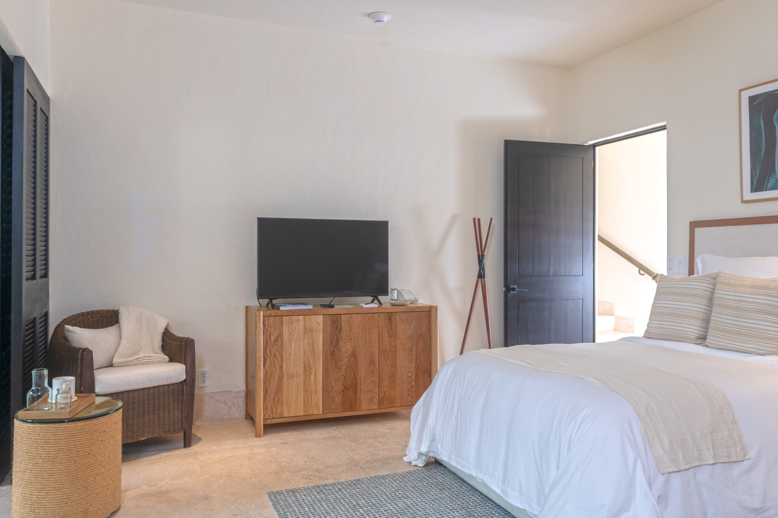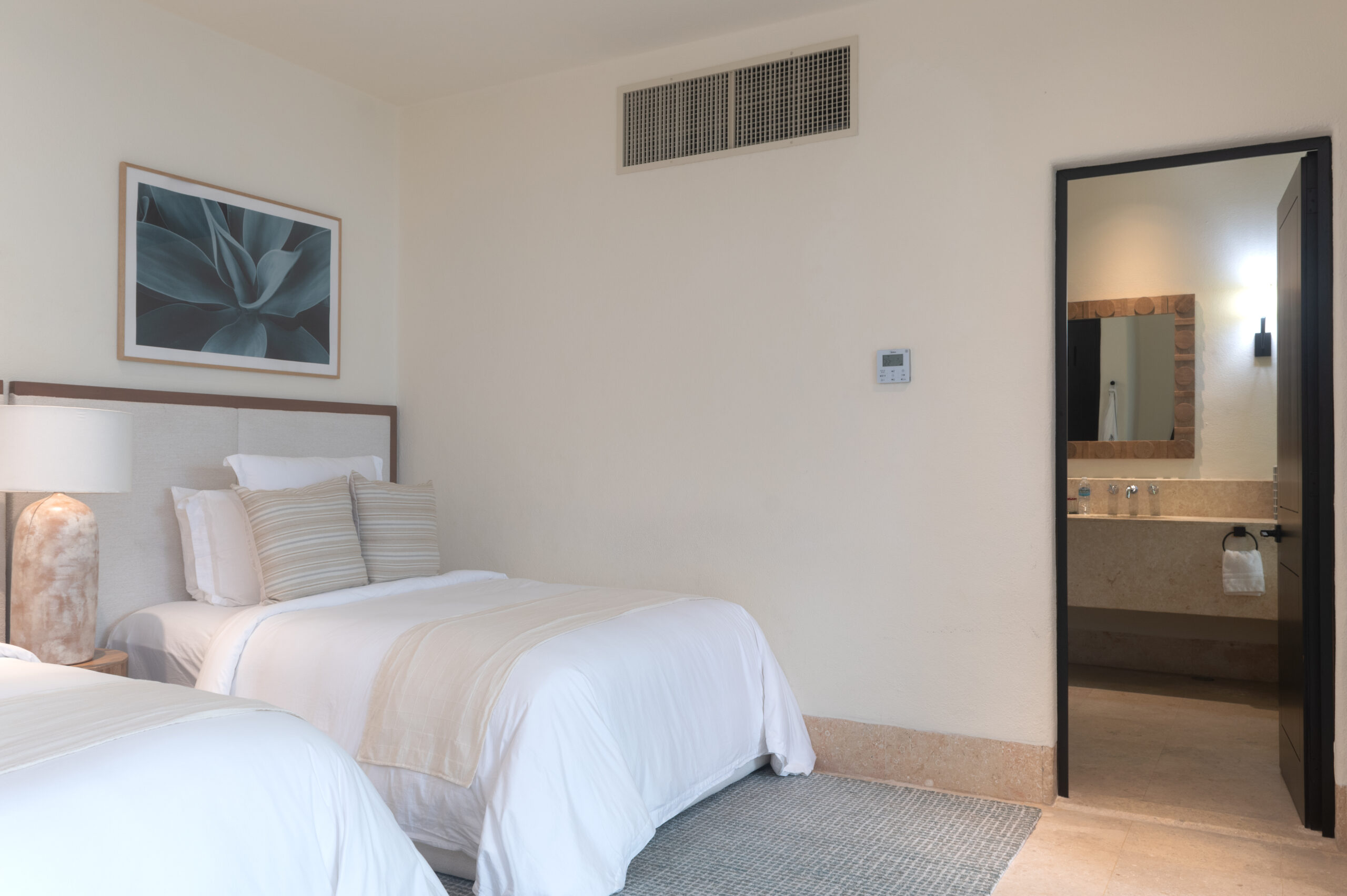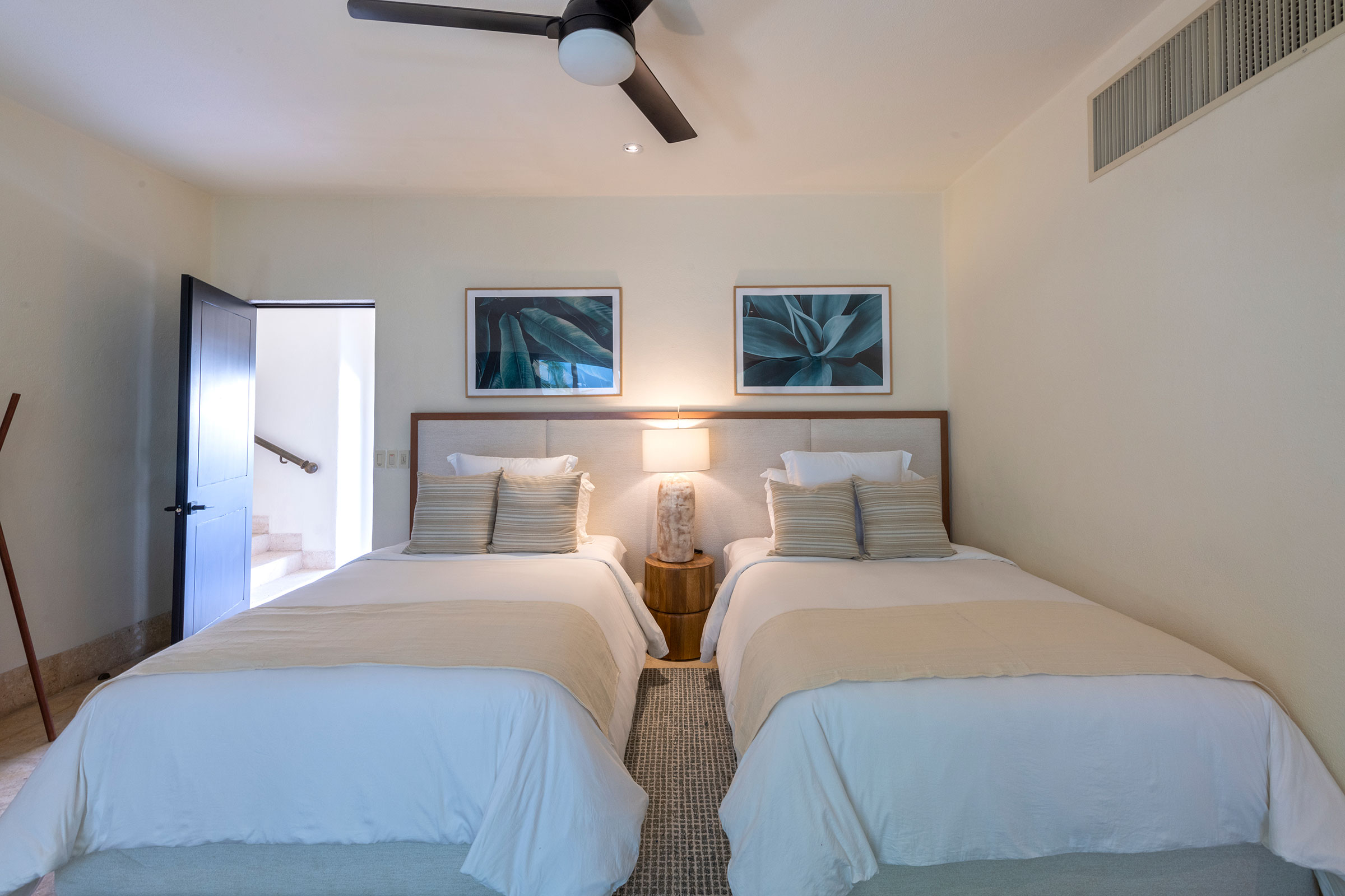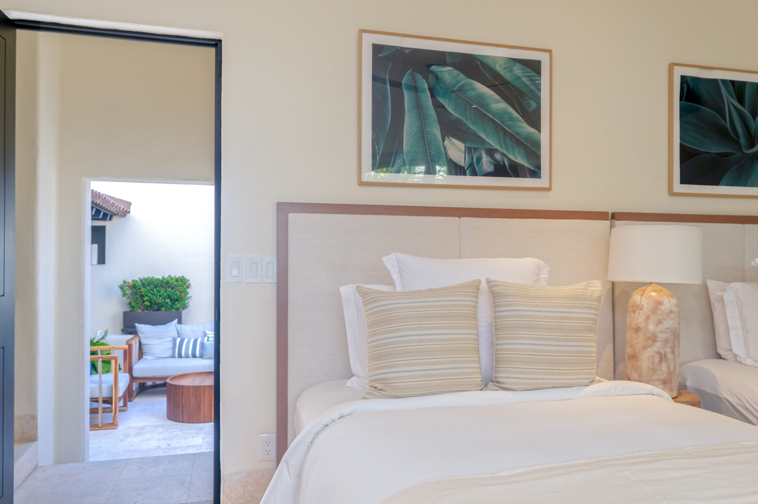 Upon entering a private courtyard, guests are greeted with a soothing water feature, creating a welcoming oasis. The villa features expansive living spaces, including three bedrooms within the main home and a beautiful casita across the courtyard. It’s a perfect vacation home with four full bedrooms plus a flex room, which can be used as a cozy retreat or a fifth bedroom.