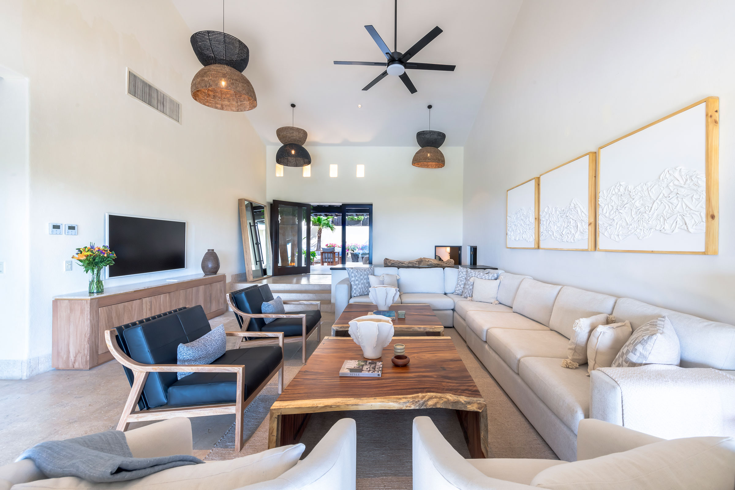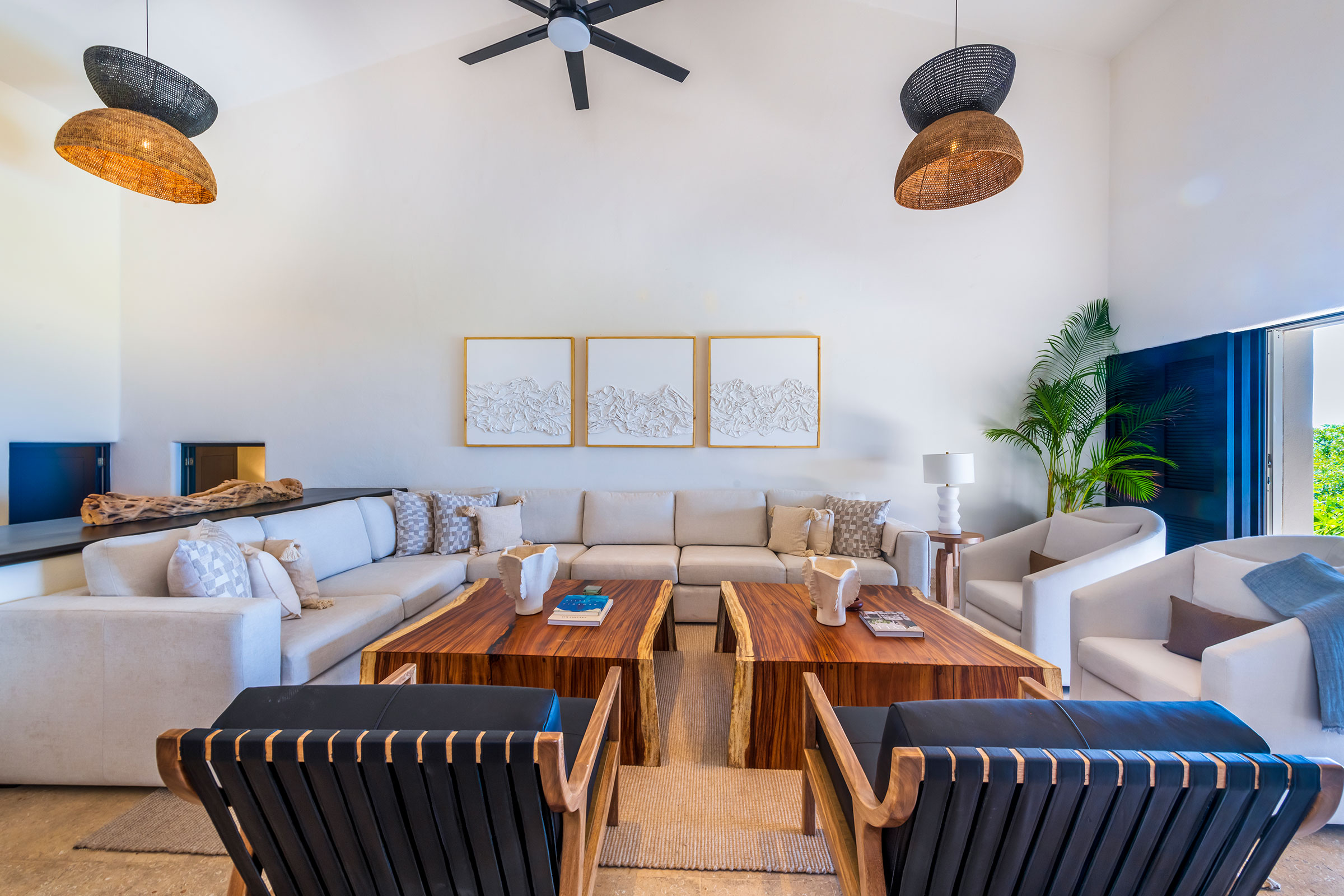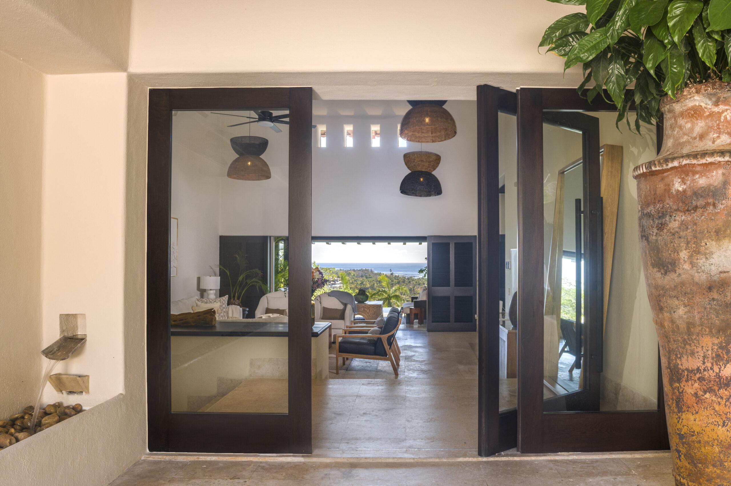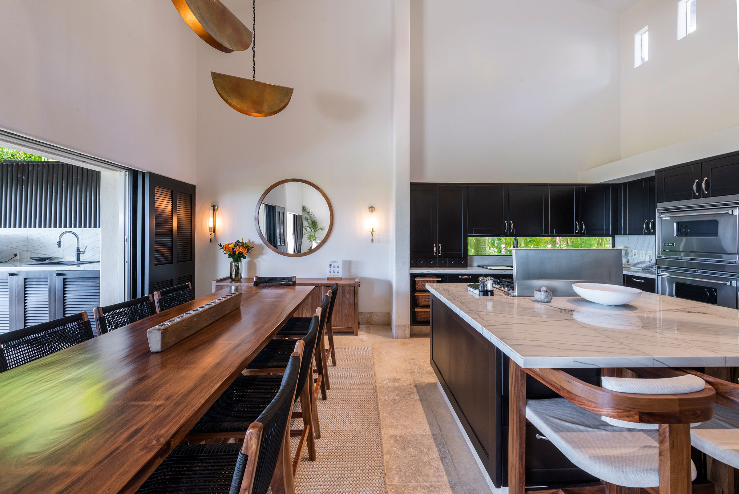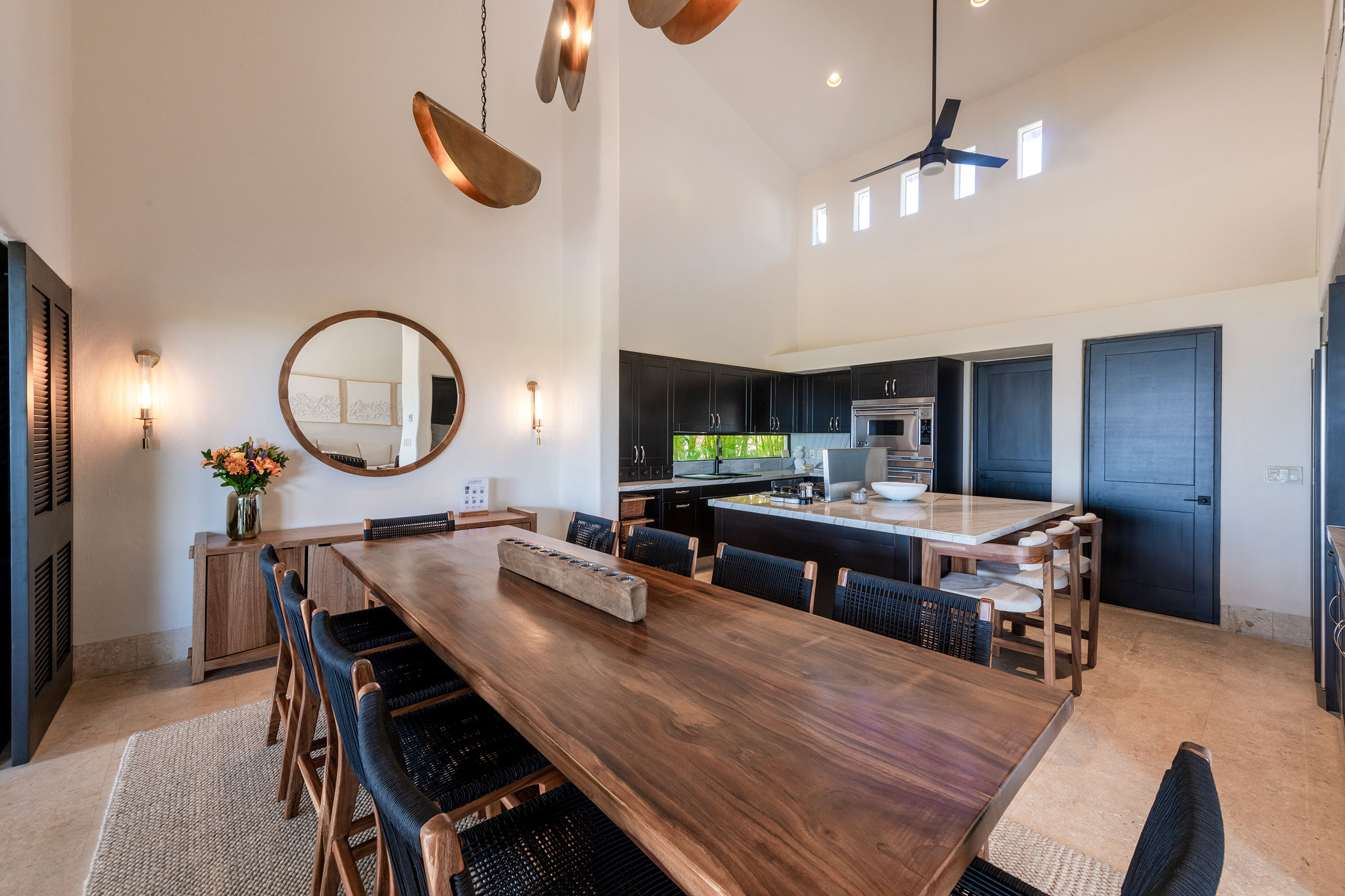 Designed like a dream, the open-concept space with two-story high ceilings offers expansive ocean views. The living room opens through a wall of sliding windows to exterior sundecks, covered outdoor living spaces, and a private infinity-edge pool.