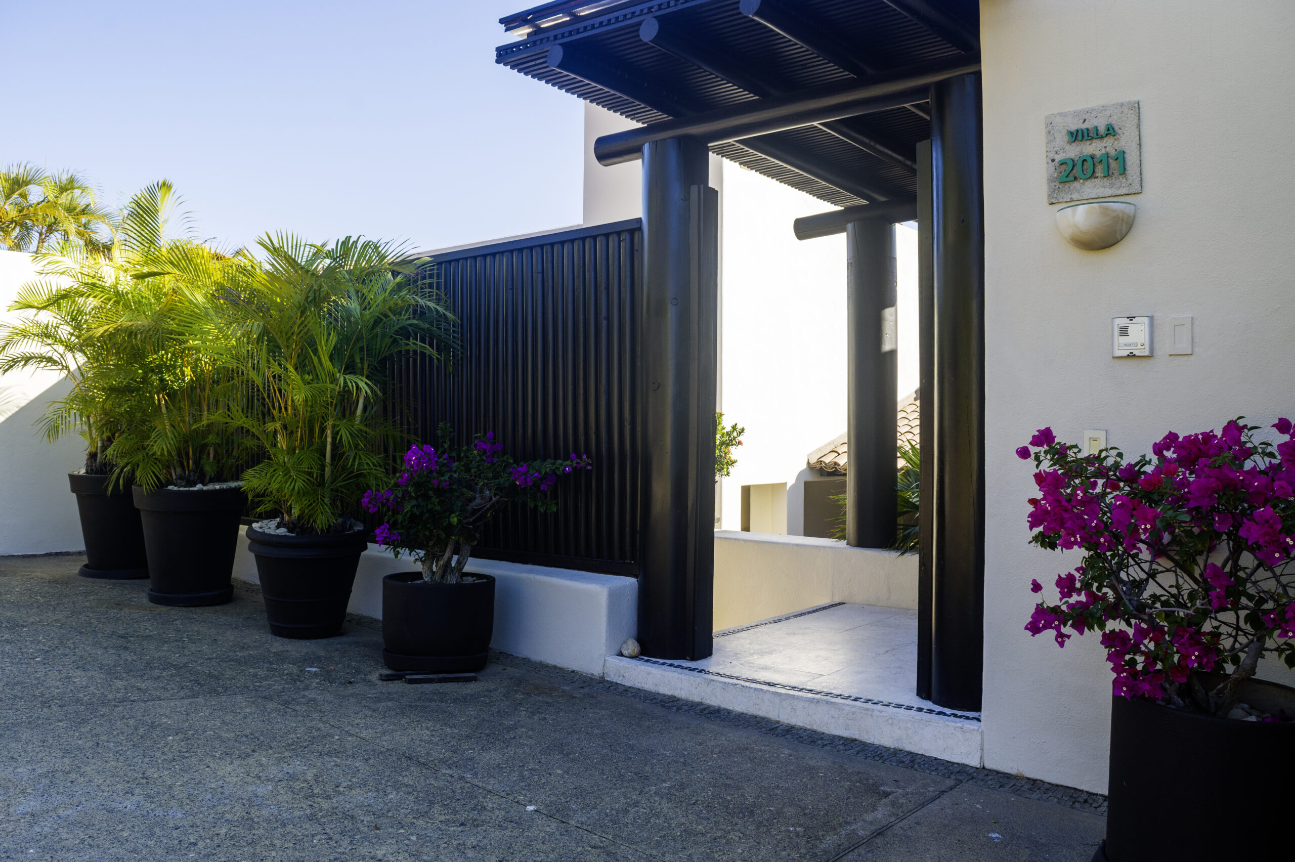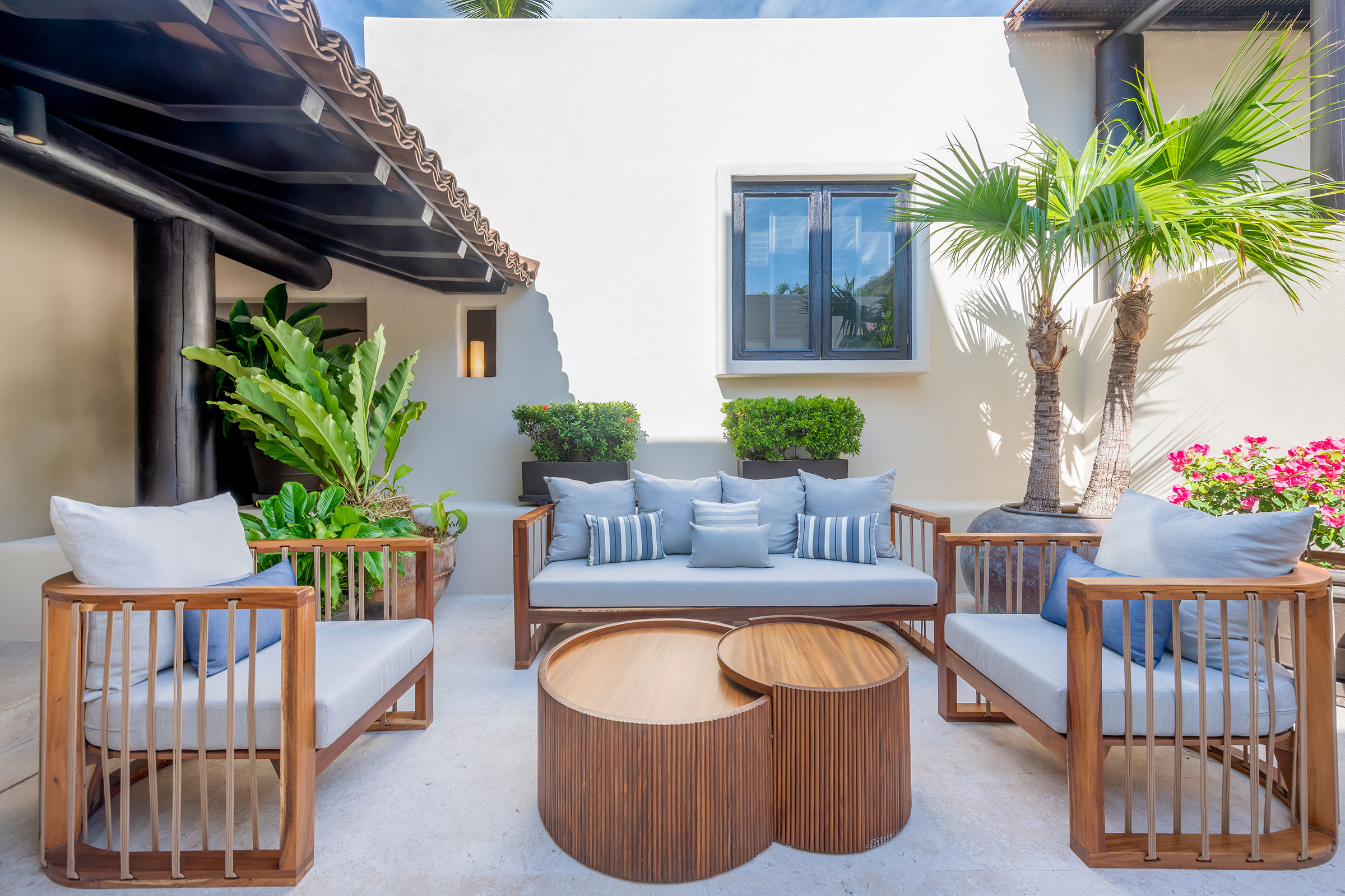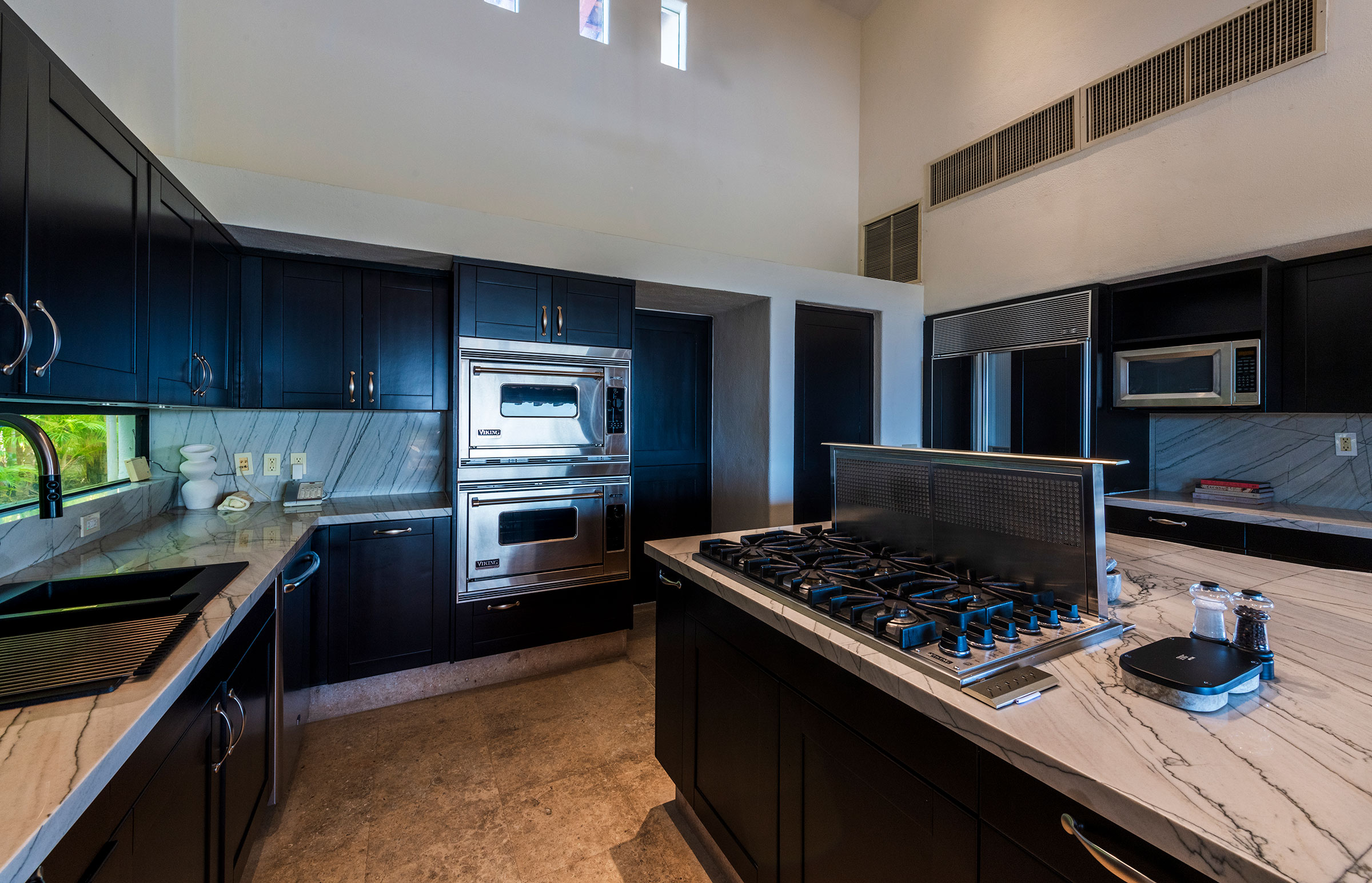 The villa has seen thoughtful enhancements, such as new windows and sliding doors, a new air conditioning system, refinished natural stone flooring with inlays, and custom woodwork.