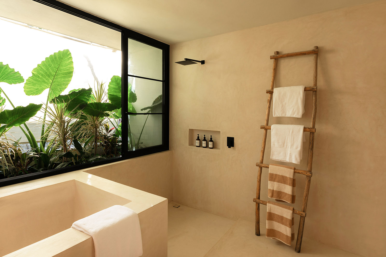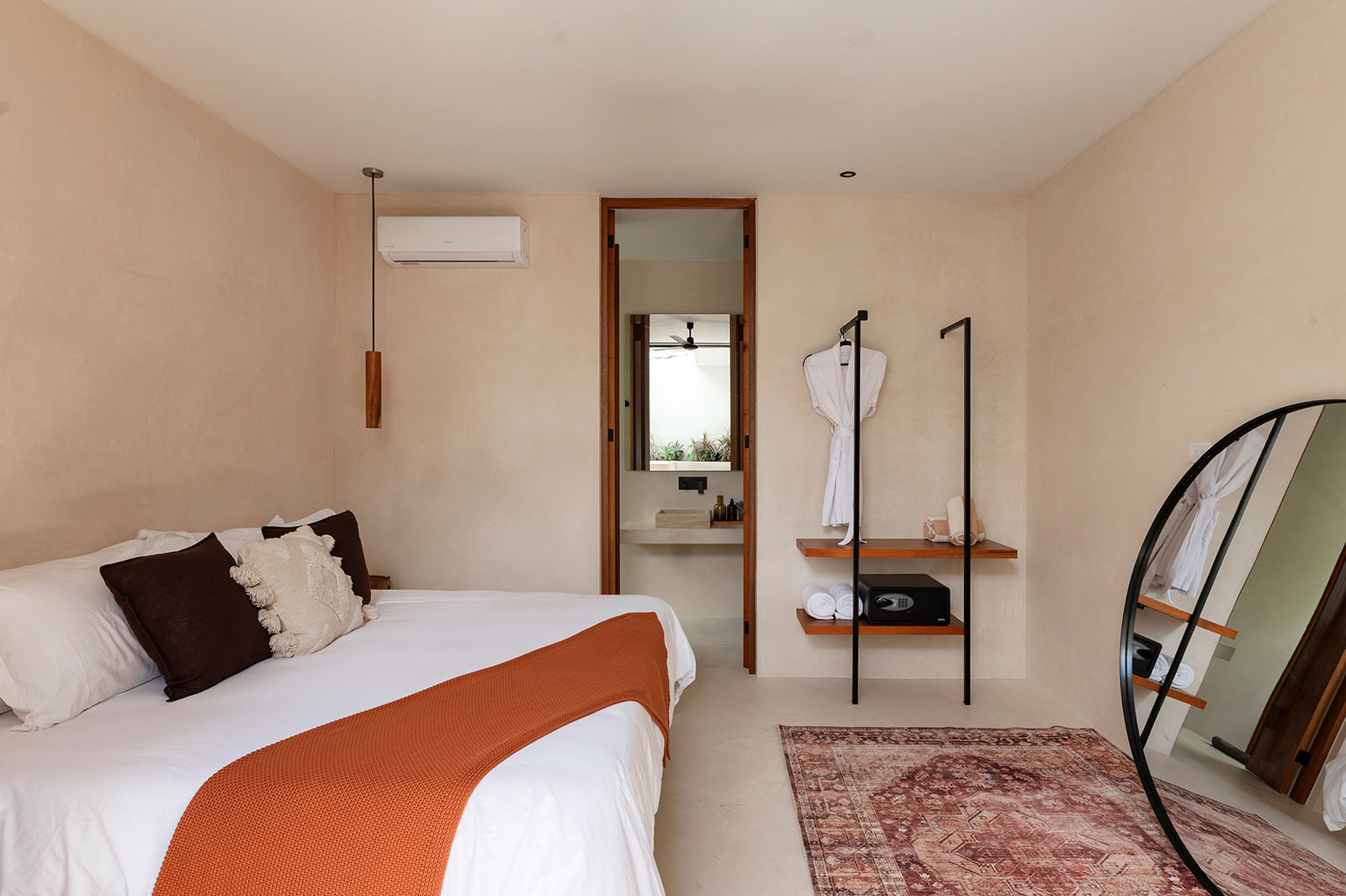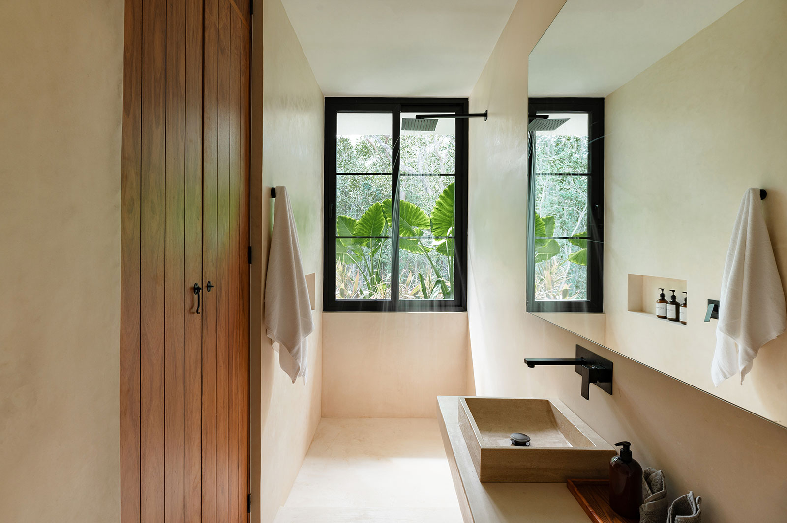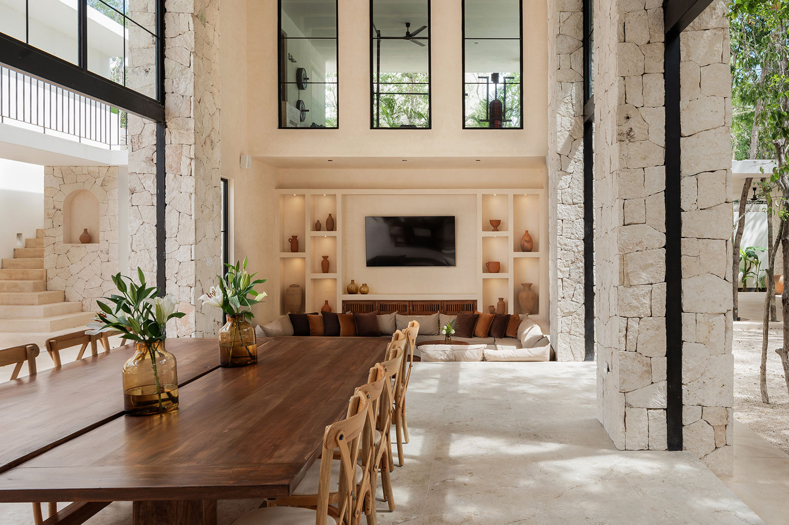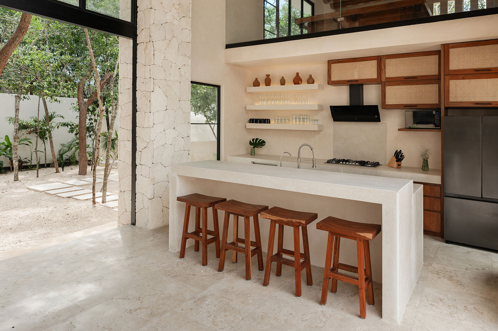 Surrounded by lush vegetation and reached via simple dirt roads, the property is intentionally tucked away from the everyday. Traditional elements such as wooden beams, stone pillars, and the region’s characteristic chukum finish anchor the villa in its local context, while minimalist décor keeps the atmosphere serene and uncluttered. The result is a retreat that feels deeply connected to its environment without sacrificing comfort.