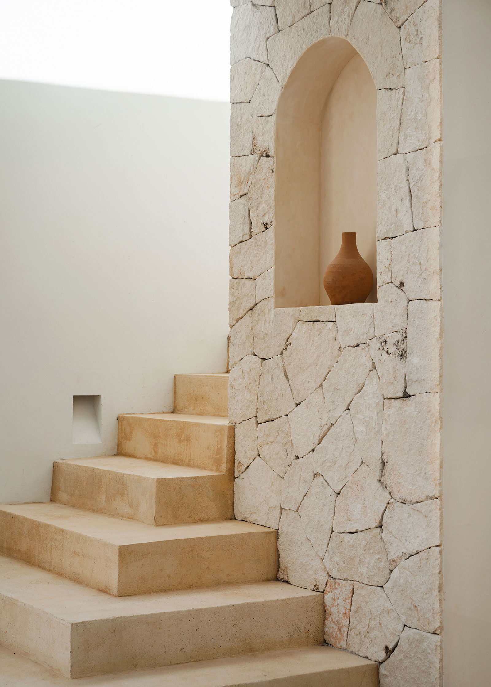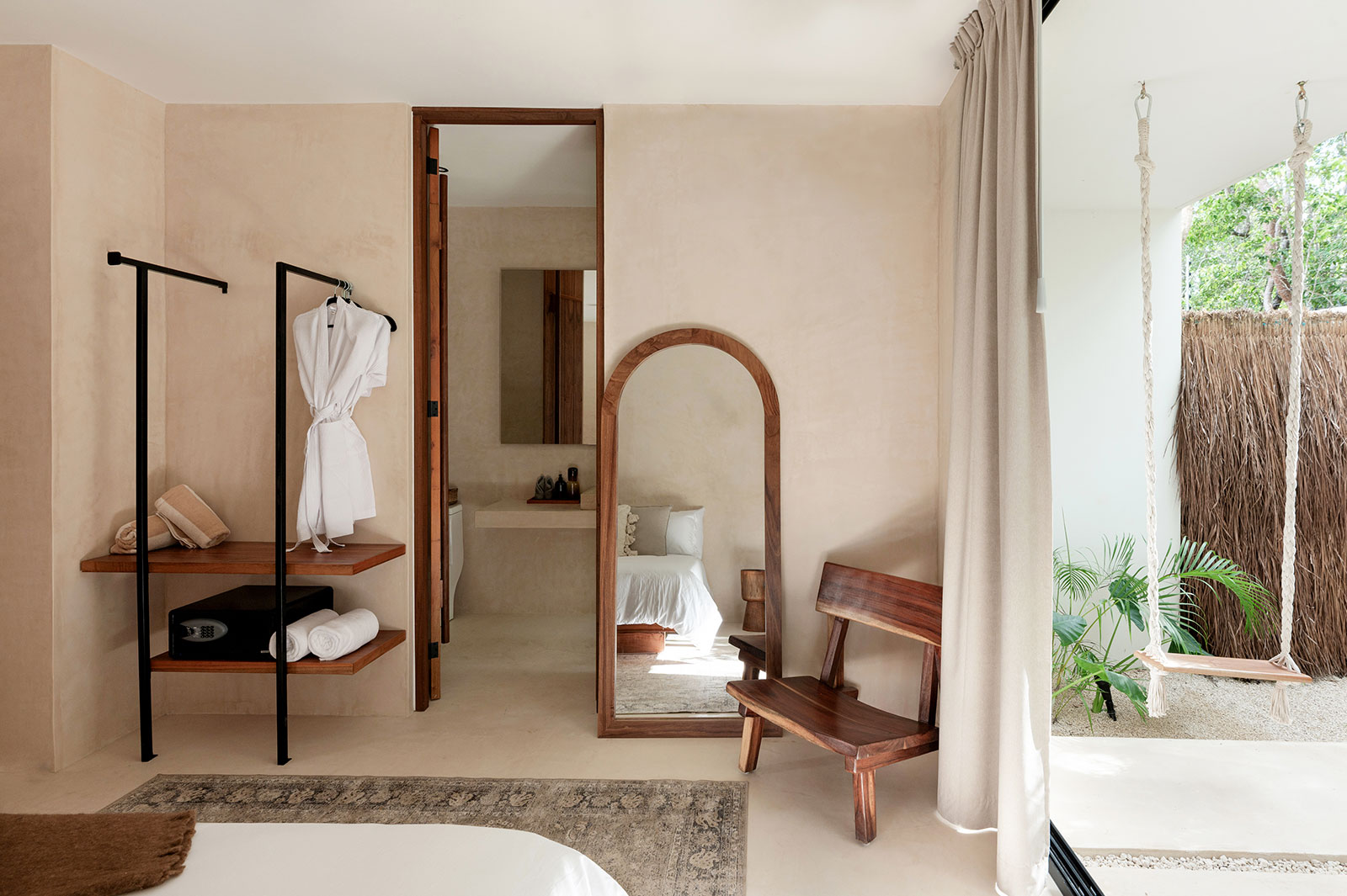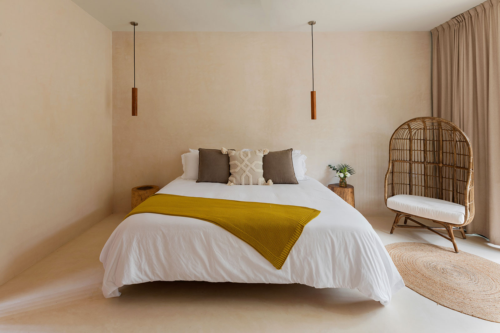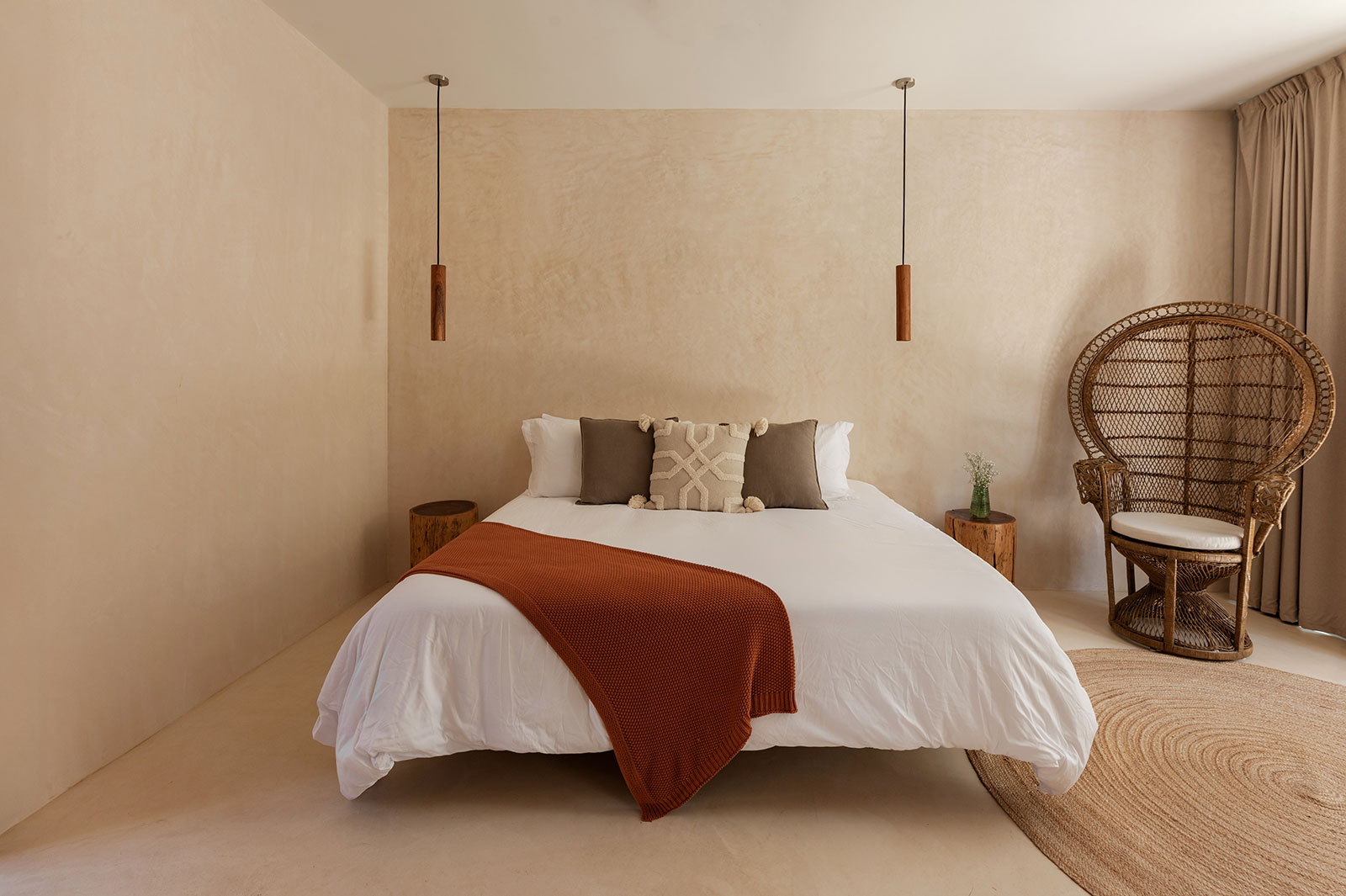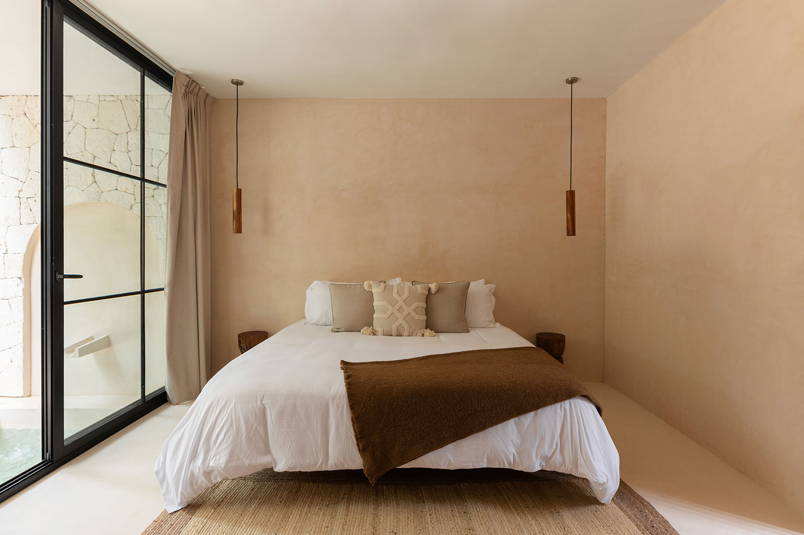Surrounded by lush vegetation and reached via simple dirt roads, the property is intentionally tucked away from the everyday. Traditional elements such as wooden beams, stone pillars, and the region’s characteristic chukum finish anchor the villa in its local context, while minimalist décor keeps the atmosphere serene and uncluttered. The result is a retreat that feels deeply connected to its environment without sacrificing comfort.