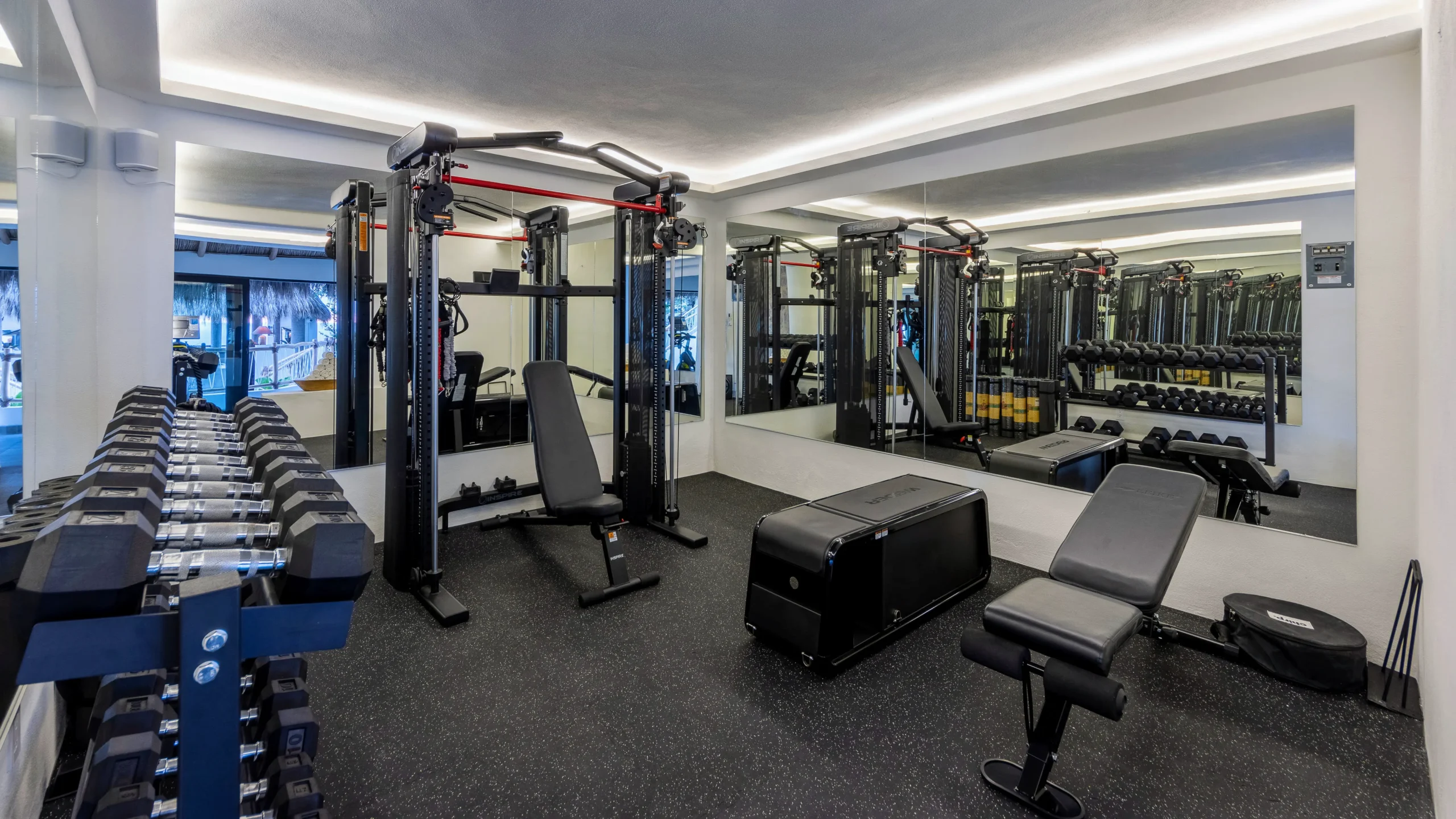 Indoor spaces are designed for both relaxation and entertaining. Two indoor living and dining areas accommodate groups of all sizes, supported by a state-of-the-art commercial kitchen with chef’s prep area. A fully equipped fitness room, central A/C throughout, sound system, and high-speed Wi-Fi ensure modern comfort and seamless connectivity.