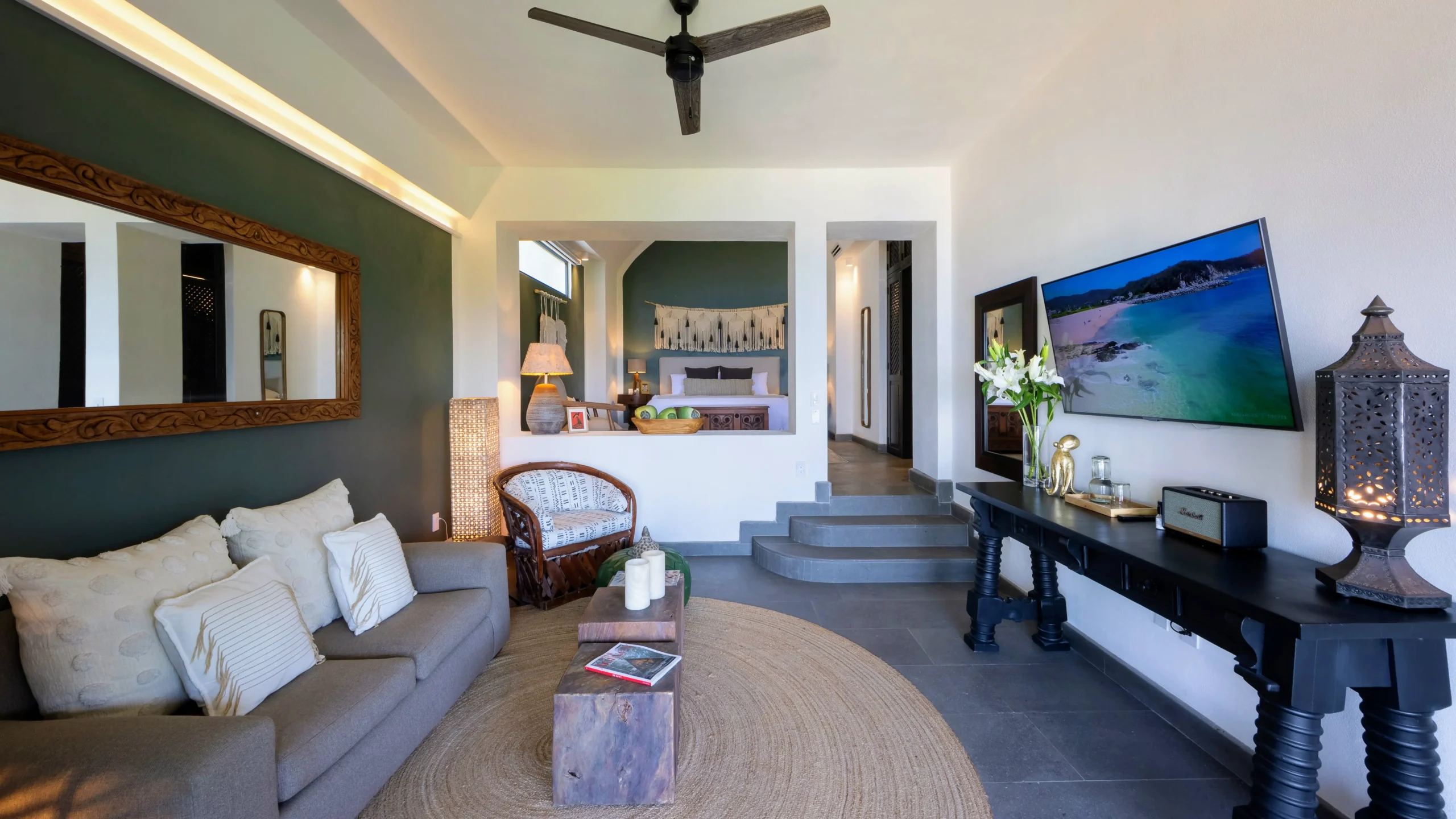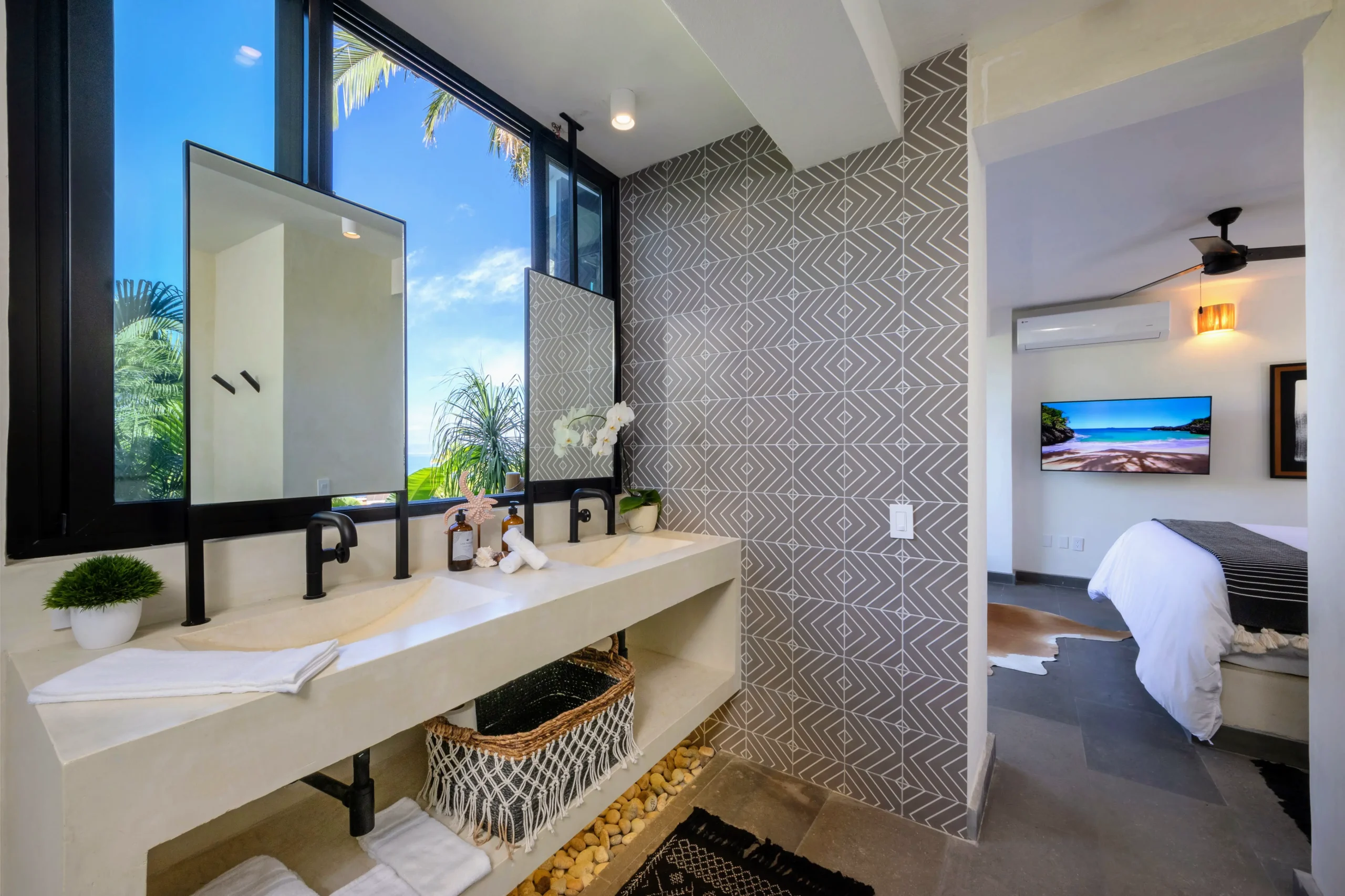 Casa Mia, available with 6–8 bedroom bookings, elevates the experience with additional ocean-view suites. The Horizon Suite offers a king bed, ocean-view terrace, bathtub, large walk-in closet, and private en-suite. The Palmera Suite features a king bed, ocean view, soaking tub, double vanity, and elegant finishes. A Terraza Room with a king bed plus two twin beds and garden view is ideal for families, complete with its own en-suite bathroom.