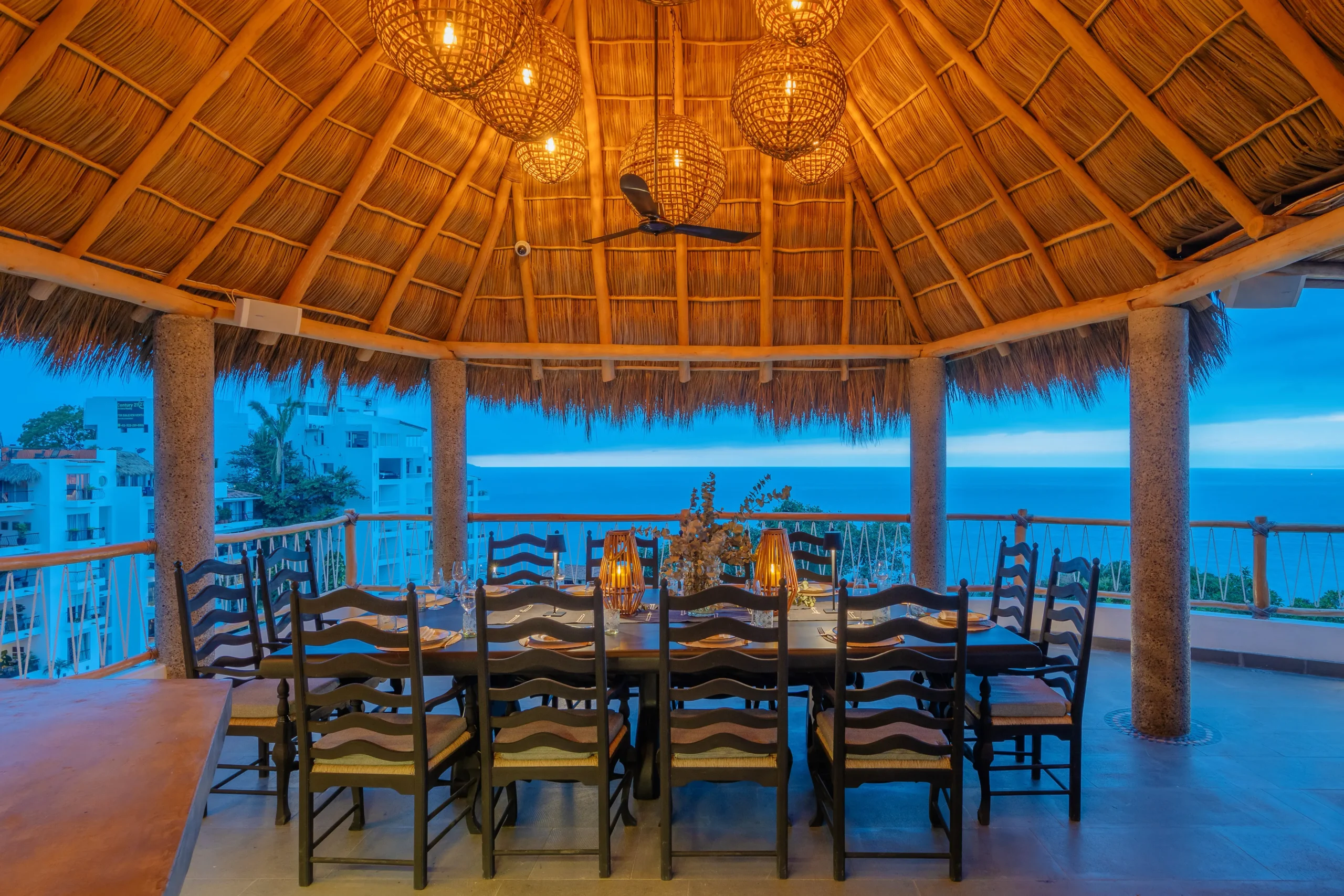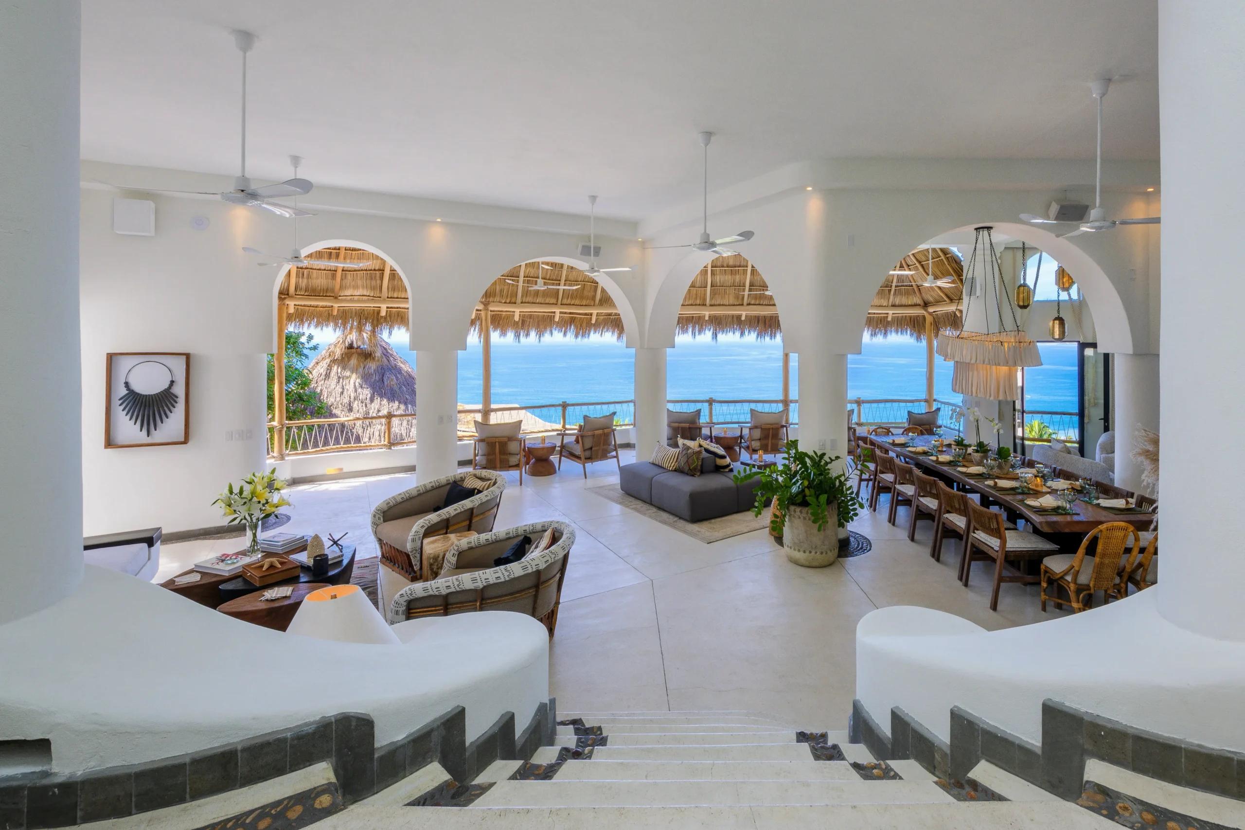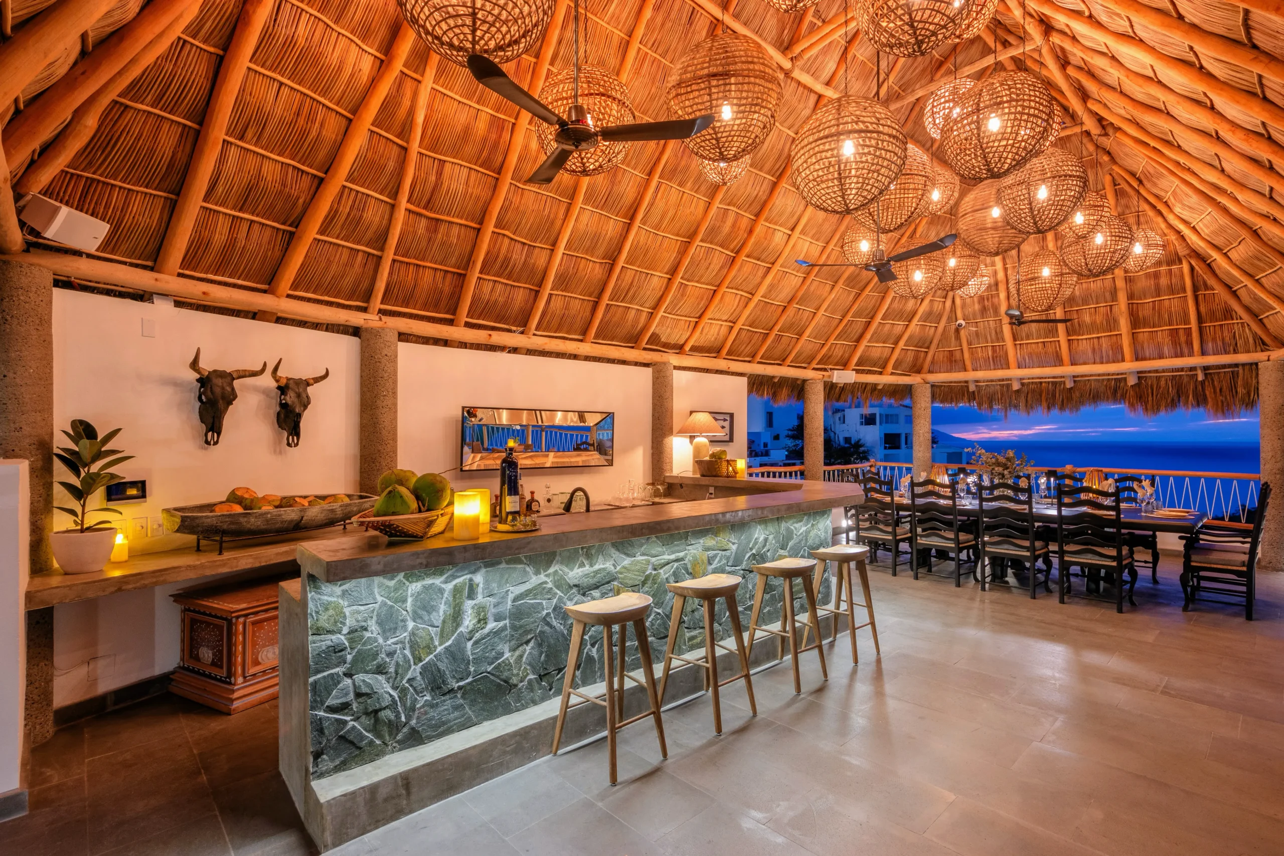 Outdoors, two infinity-edge swimming pools and a private Jacuzzi overlook the Pacific, creating a dramatic backdrop for sunbathing, sunset cocktails, or late-afternoon lounging. Three shaded palapas invite guests to unwind or enjoy outdoor massages, while expansive terraces, sun decks, and an alfresco dining area set the stage for open-air meals and celebrations.