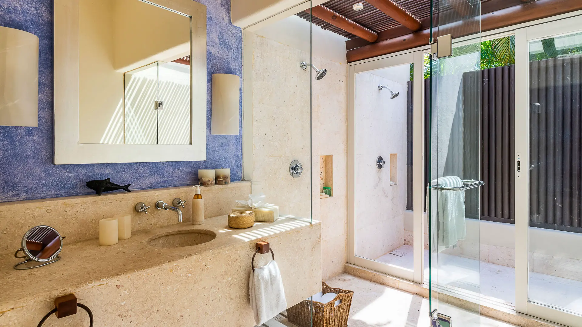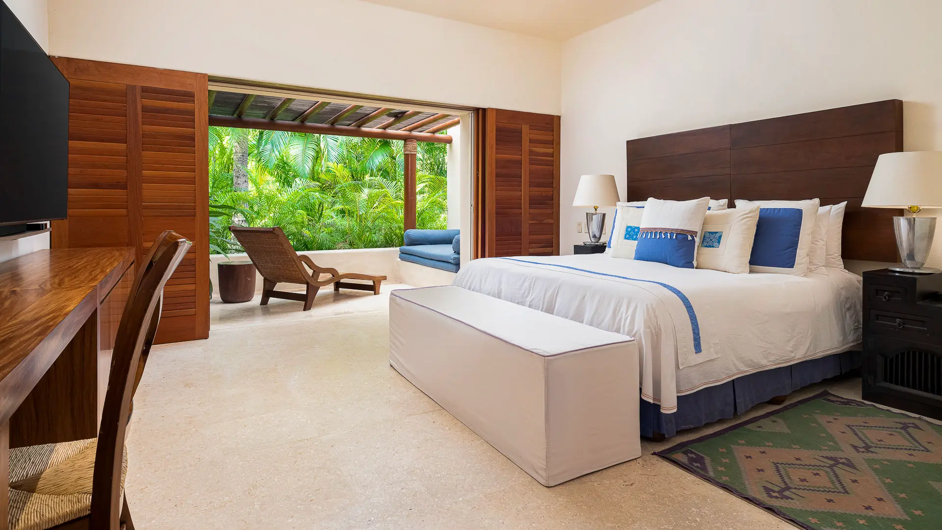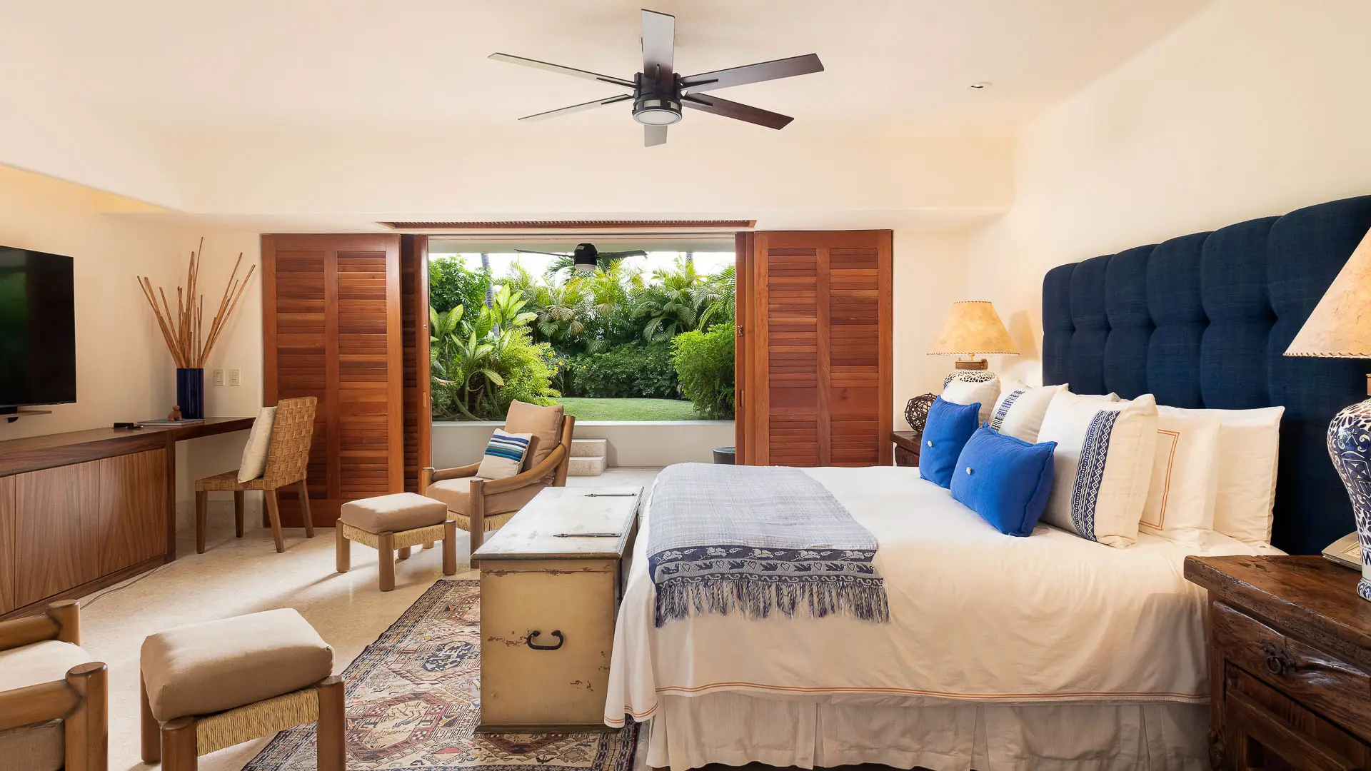 This suite features a king-size bed and includes an en-suite bathroom with indoor and outdoor showers. It also offers direct access to a private patio with views of the villa’s lush gardens.