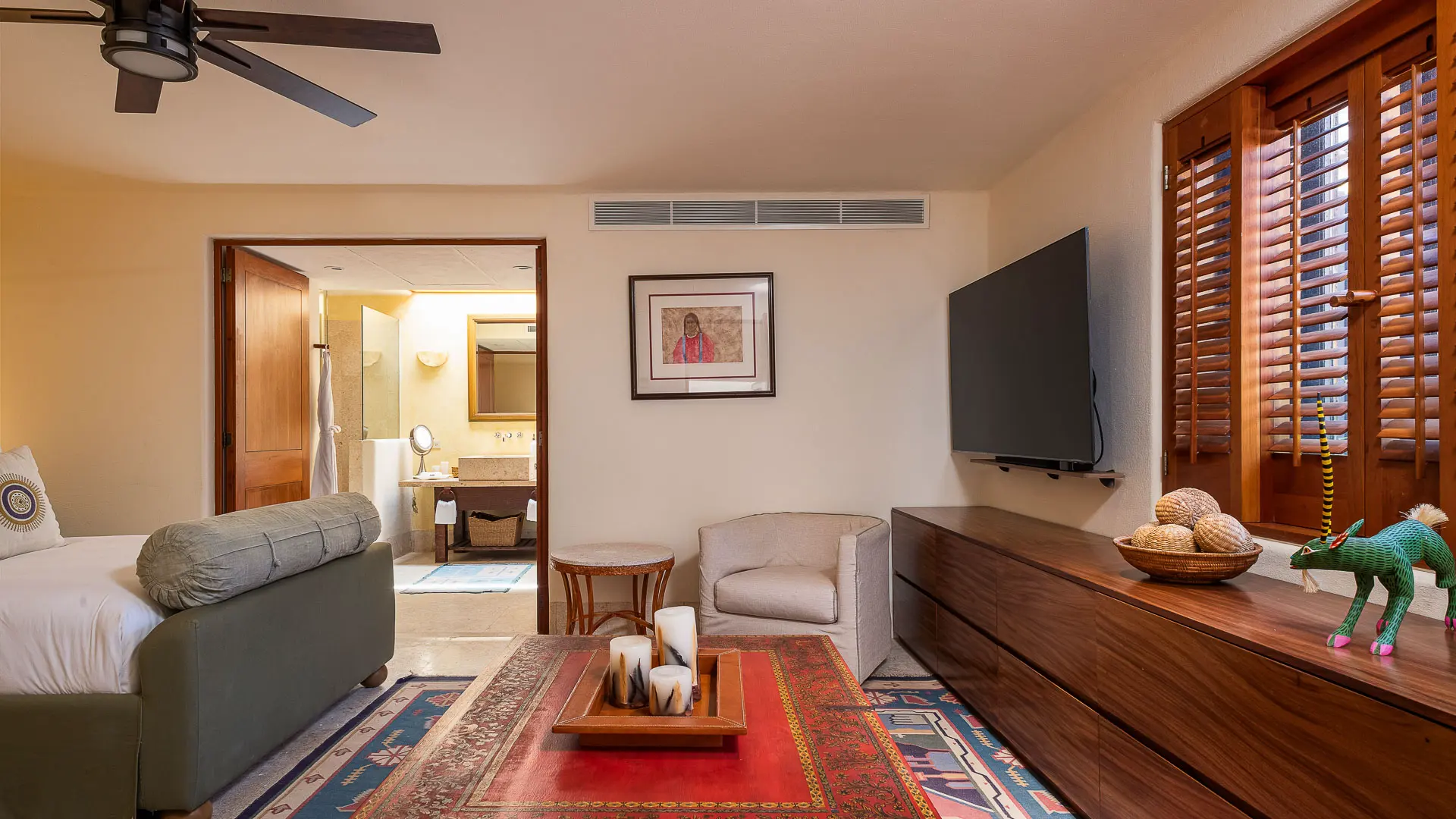 This elegant suite features a king-size bed, a spacious sitting area with a flat-screen TV, and a luxurious en-suite bathroom with twin vanities, twin showers, a soaking tub, and a walk-in closet. Step out onto your private patio with a jacuzzi and outdoor lounge area to enjoy the serene sea views.