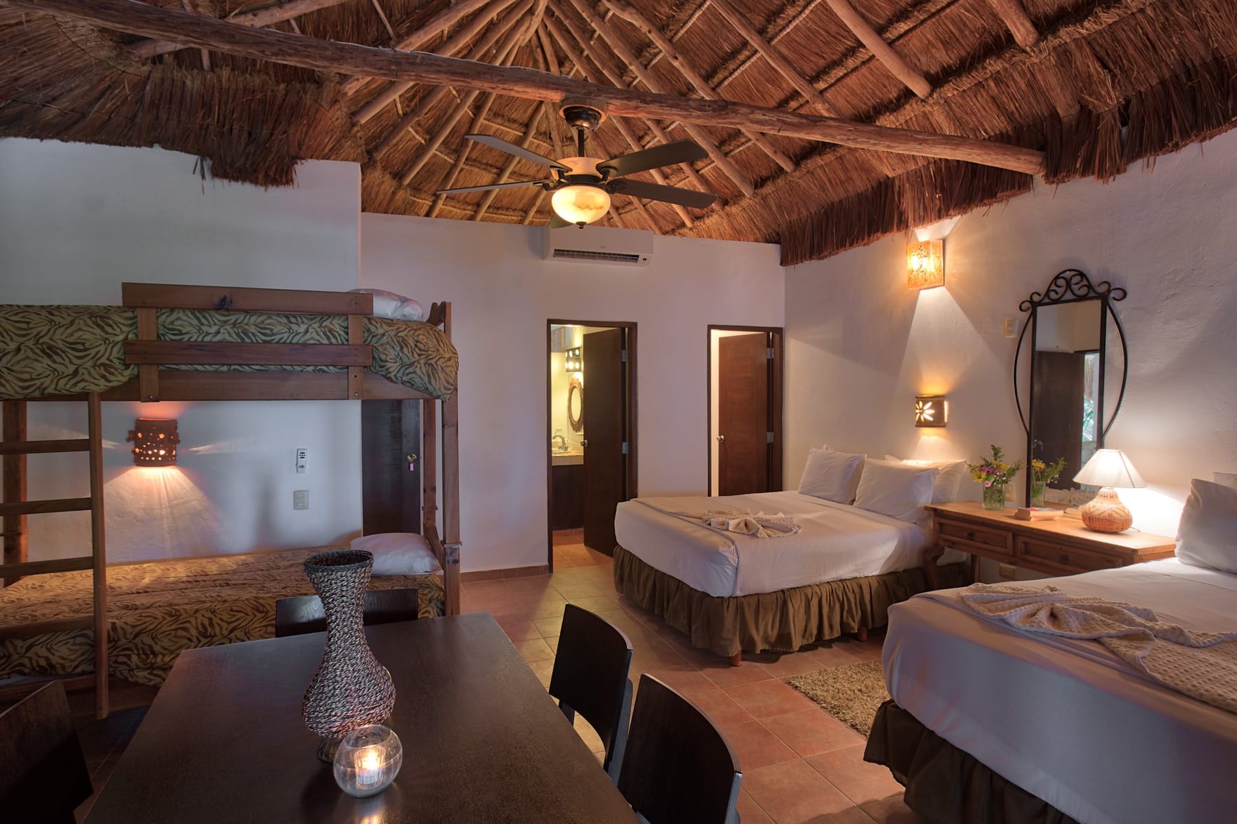 The suite’s design stands out. Palm roofs, tree trunk pillars, bamboo, and wood details tell a story. Moreover, guests enjoy two queen beds, a bunk bed, and modern comforts. And there’s a fun twist! A swinging bridge links to the Palapa Honeymoon Suite.
