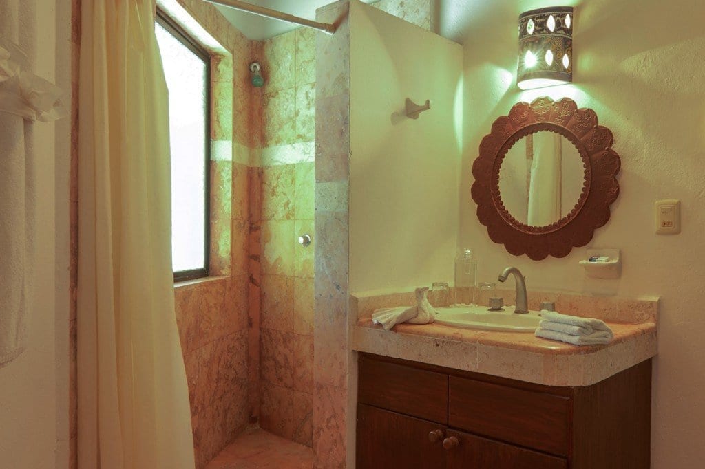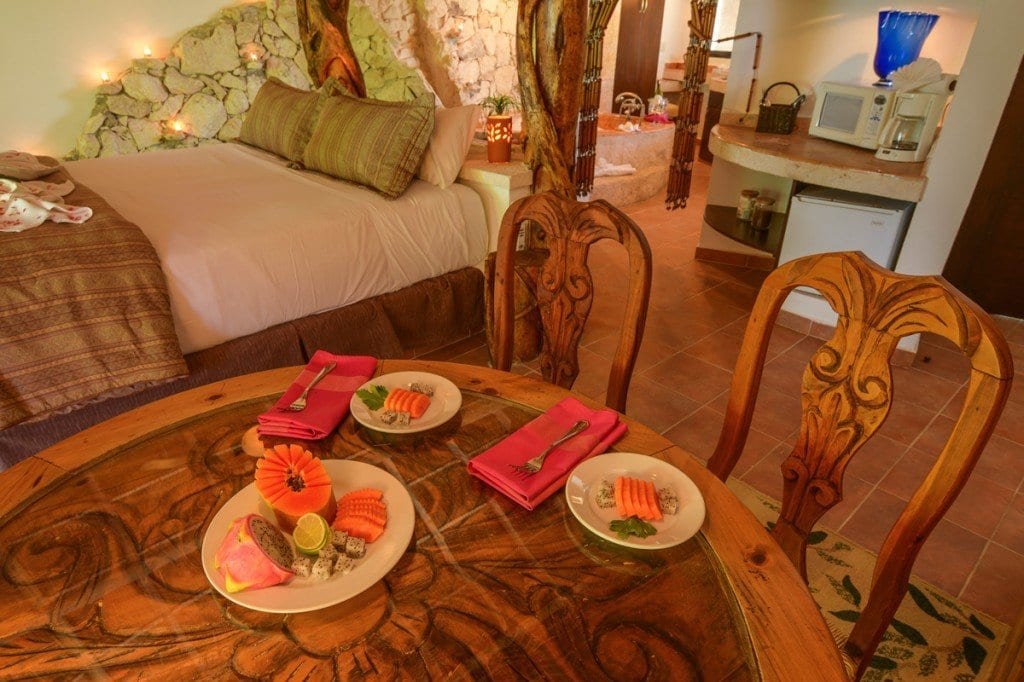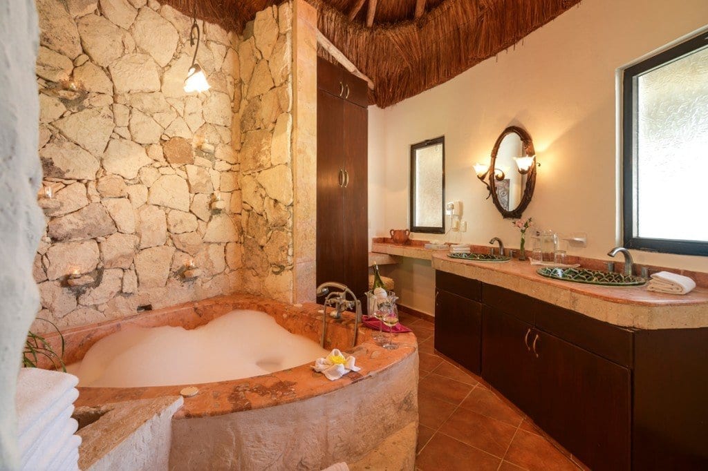 Palapa Main Suite: Nestled on the villa’s 2nd level, this suite mesmerizes couples with a beach view balcony, plush king bed, tailored air conditioning, a ceiling fan, and a well-appointed kitchenette featuring a microwave, mini-refrigerator, and coffee maker—a spa-inspired bathroom with a serene jacuzzi and cascading rock waterfall.