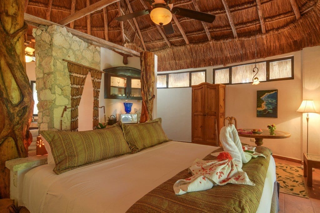 Palapa Family Suite: Accessible via a charming swinging bridge, this suite is ideal for larger gatherings. It boasts two queen beds, a bunk bed, dual spacious bathrooms, and other conveniences such as A/C, a ceiling fan, and a kitchenette.
