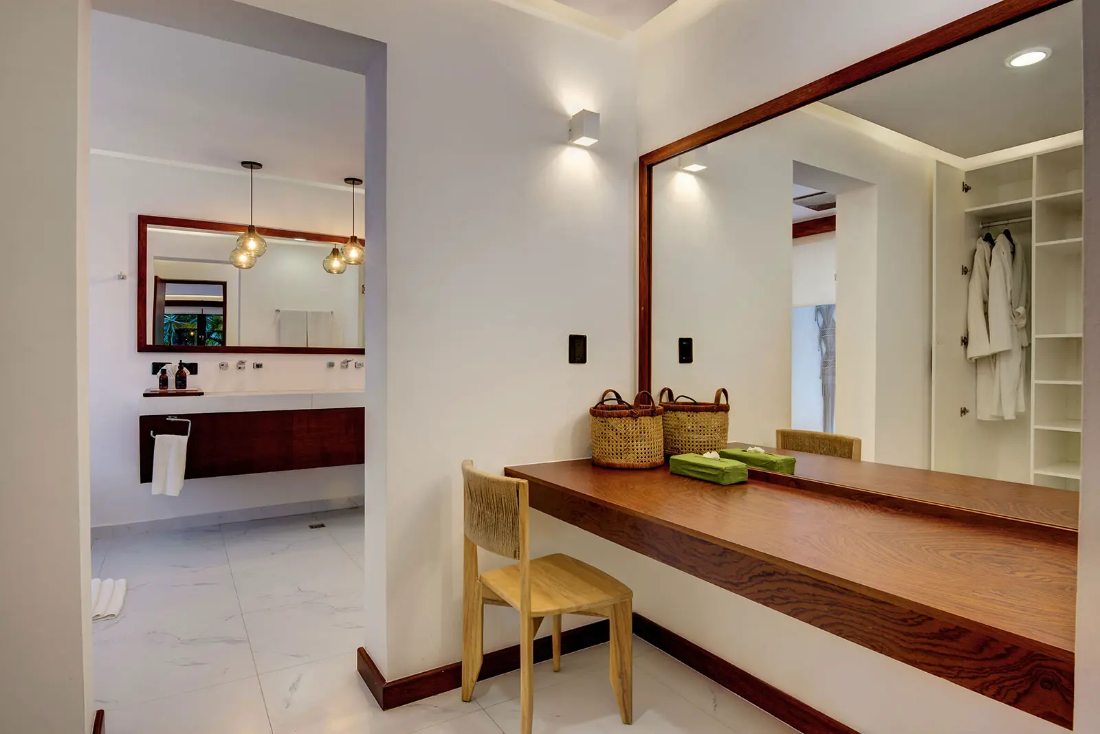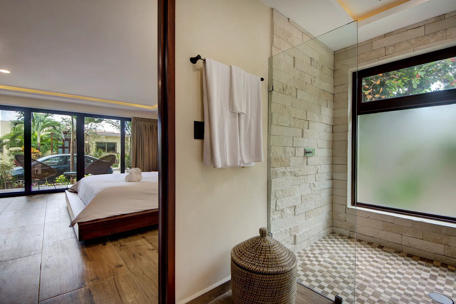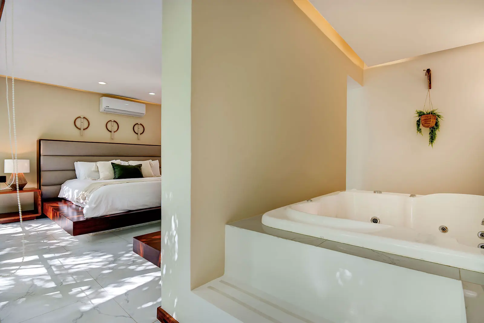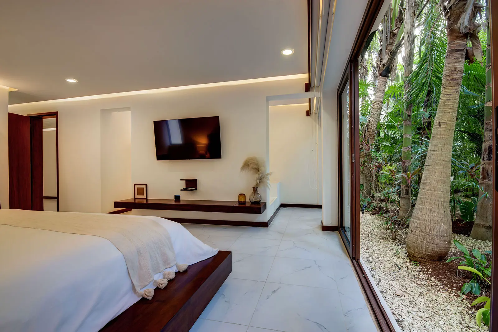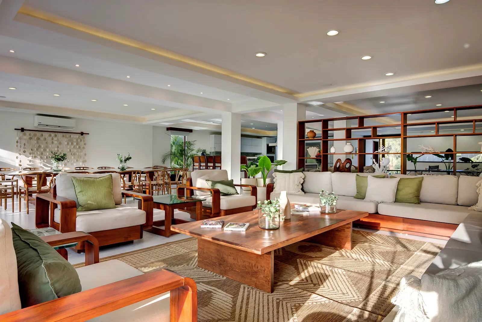 The estate sits within the private, upscale neighborhood of Playacar, giving it a discreet residential feel while remaining connected to the energy of the surrounding area. Guests are positioned close to Playa del Carmen’s renowned Fifth Avenue, with its restaurants, bars, and shopping, yet return to a calm environment that feels distinctly separate from the city’s bustle. This contrast between lively surroundings and a tranquil home base shapes the overall atmosphere of the stay.