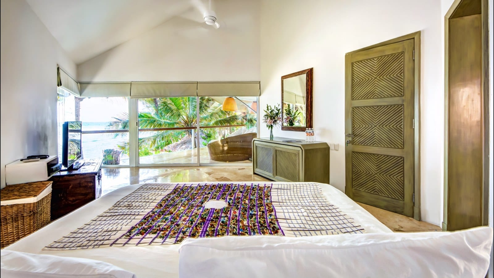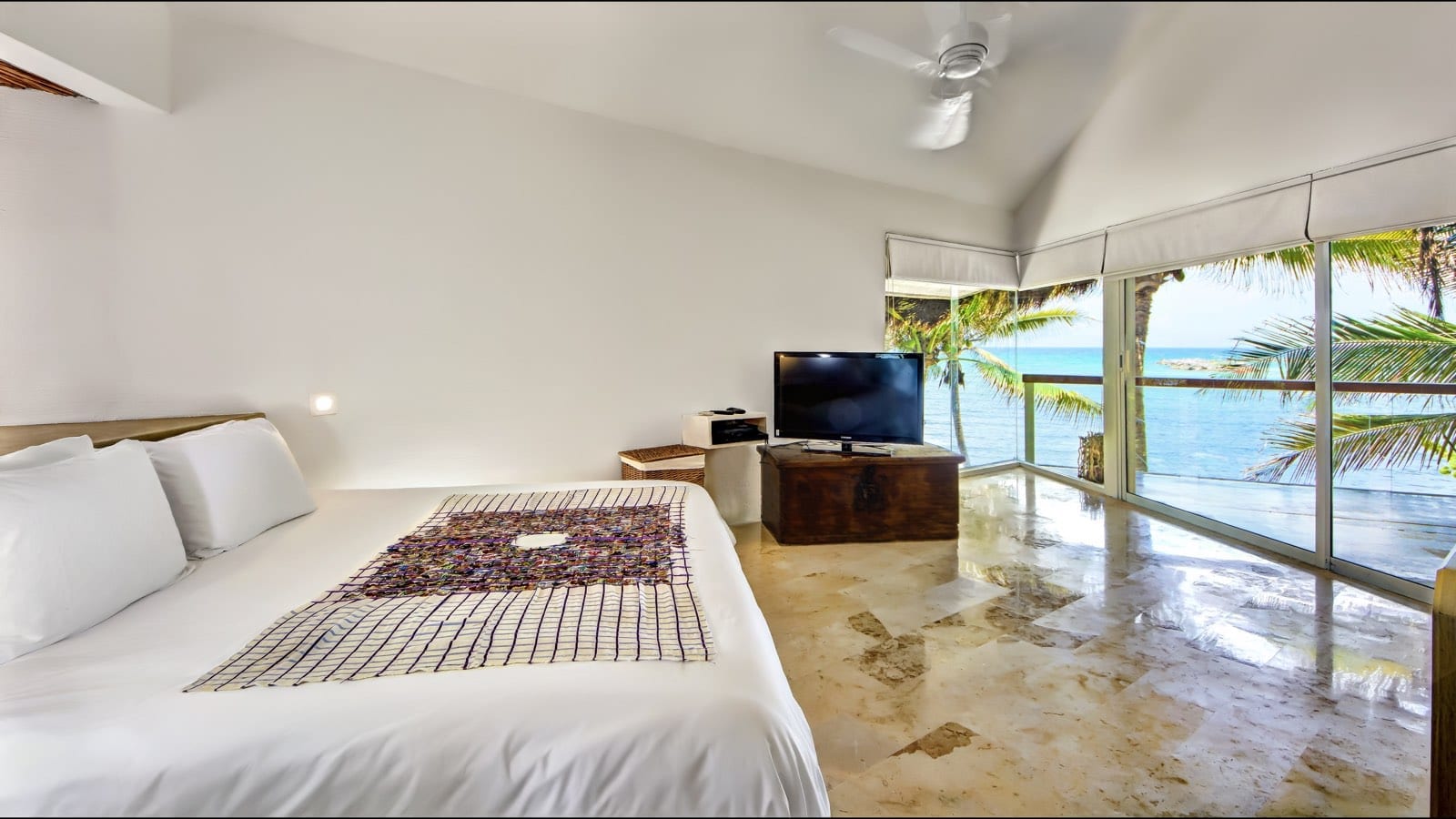 King size bed, Air conditioning, CD player, Ceiling fan, Ocean view, Sky TV, Toiletries