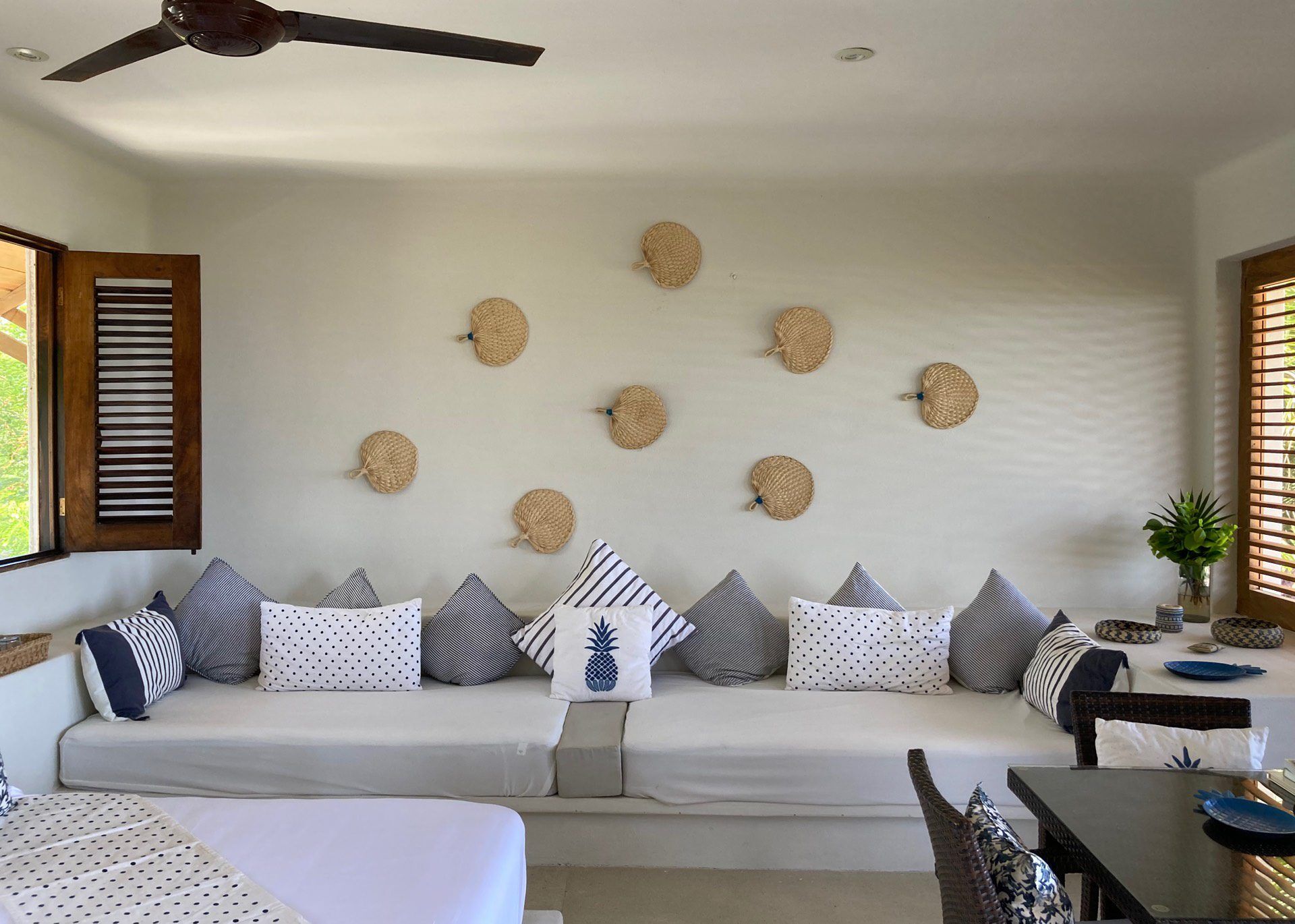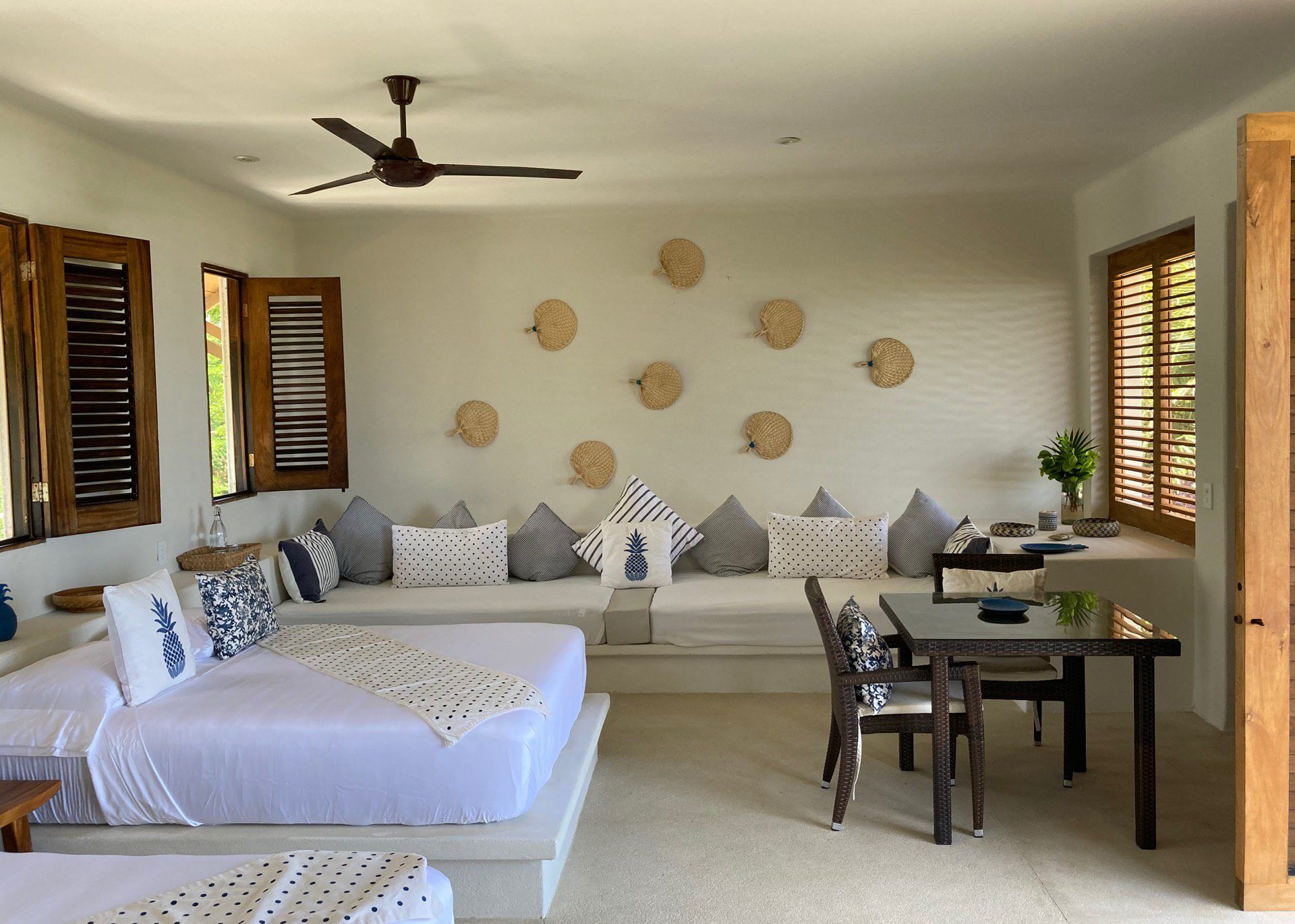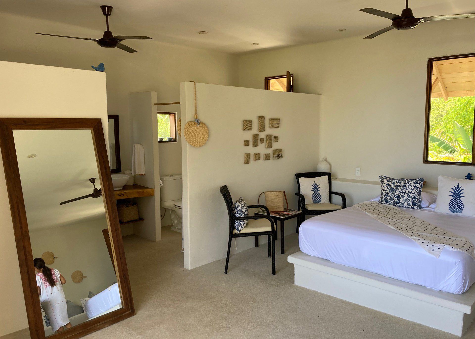 Suite Pinas at Los Guajes – Step into a realm of tropical elegance in our bungalow suite situated upstairs. It features two queen-sized beds, complemented by a spacious daybed – perfect for unwinding with a good read. An inviting outdoor terrace offers direct ocean views and the villa’s beautifully curated paths and gardens. We’ve added ceiling fans, an outdoor seating space, and a compact refrigerator for your beverages and treats to enhance your stay.