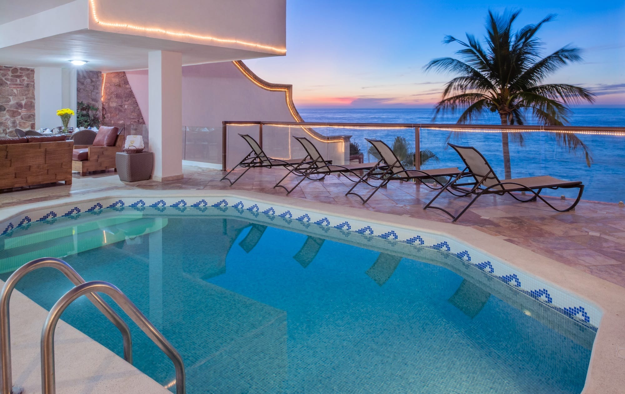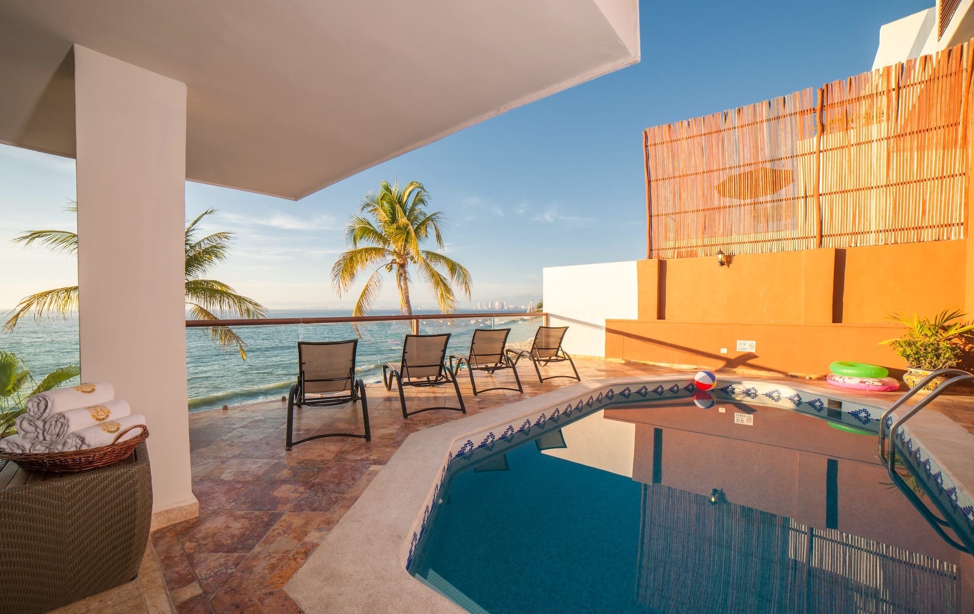 Welcome to Sky Suite B at Vallarta Shores, featuring 3 bedrooms/3 bathrooms, private pool, private chef service (included in rate), and conveniently located right on the beach. Sky Suite B offers a unique opportunity to enjoy stunning panoramic views and glorious sunsets of charming Puerto Vallarta. Take the elevator to the top levels of the building, and immerse yourself in the beauty of your surroundings! The expansive, open-air living and dining space of Sky Suite B melds into the outdoor terrace and allows for uninterrupted views from every property angle. With a private pool steps from the living area and daily personalized chef service, you will feel pampered in paradise. Sky Suite B boasts three spacious air-conditioned bedrooms for absolute comfort while you rest. The hillside’s stone embraces two bedrooms open to the ocean, and the third, larger bedroom; all bedrooms are equipped with individual safes, A/C, and cable flat-panel TVs. Two bedrooms feature en-suite bathrooms. Some extra features include a smart TV in the living area with the ability to stream movies online, and Netflix account already set up, Bluetooth stereo with iPod docking, Wi-fi throughout, a daily maid service, telephone, and even an ice-making machine.